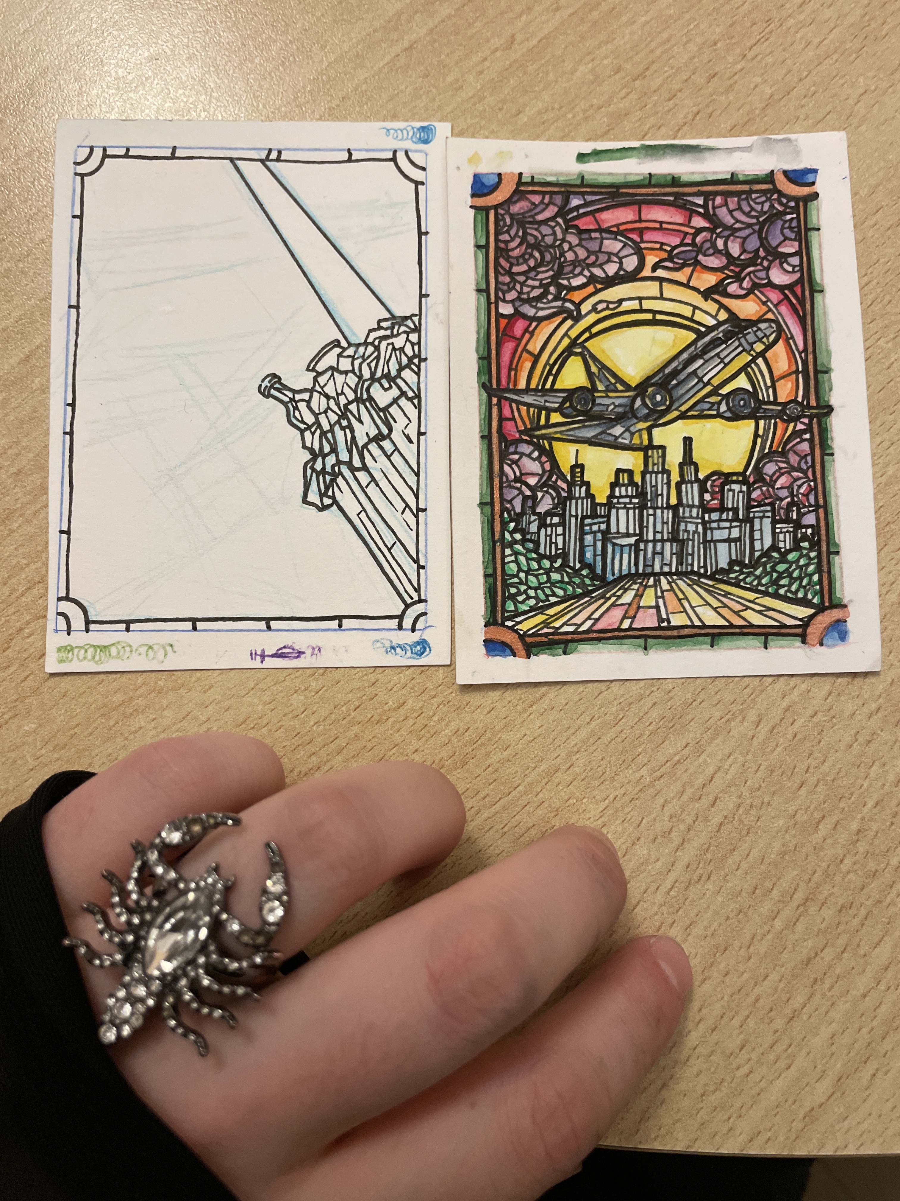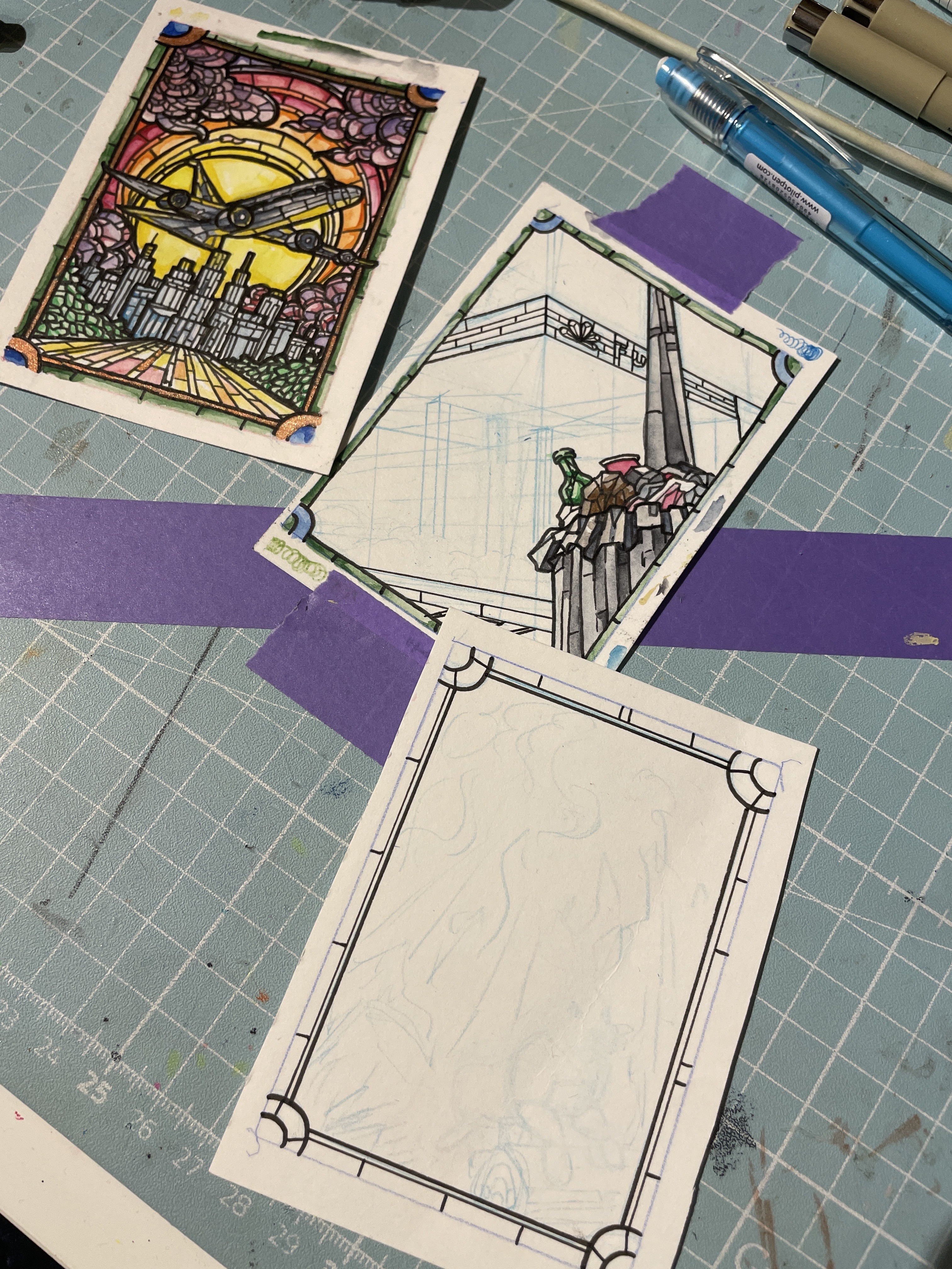 Die Perspektive nimmt leider auch sehr viel Zeit in Anspruch und die dritte Karte hab ich beim radieren versehentlich geknickt und müsste nochmal neu anfangen. Also da werde ich auf keinen Fall heute fertig mit. Aber ich hab mich ja auch nicht angemeldet und eigentlich hatte ich vor allem Lust darauf, richtig mit Buntglas zu arbeiten weil ich sowas schon immer probieren wollte aber es ließ sich eben schwer organisieren.