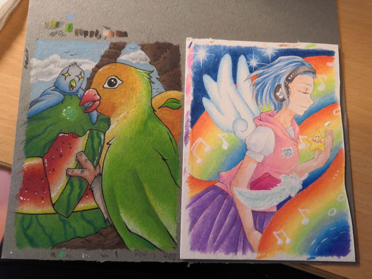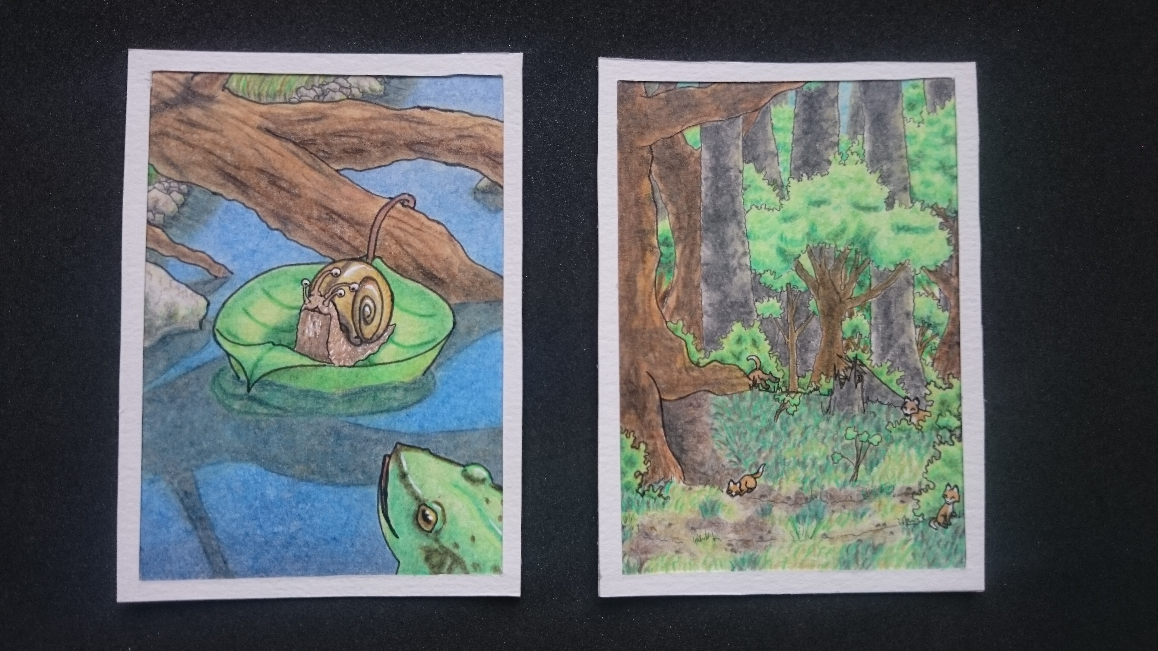 Uff, ich wär dann auch soweit, falls die beiden Karten so abgenommen werden. Die haben mir wegen Kleberresten zuletzt doch noch jeden Nerv gekostet. Der weiße Rahmen war gewollt, allerdings musste ich da jetzt einen aufgesetzten improvisieren. Man hat die sonst schier nicht anfassen können… Insgesamt bin ich aber dennoch zufrieden mit den Ergebnissen und hab das Gefühl mit meinem Spinnefeind Buntstiften wieder etwas weitergekommen zu sein.