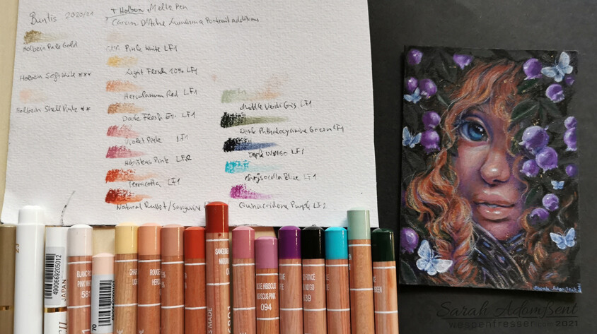 Das sind Derwent Coloursoft auf Mi-Teintes. (Und ja, vielleicht gönne ich ihr noch einen Mund.)