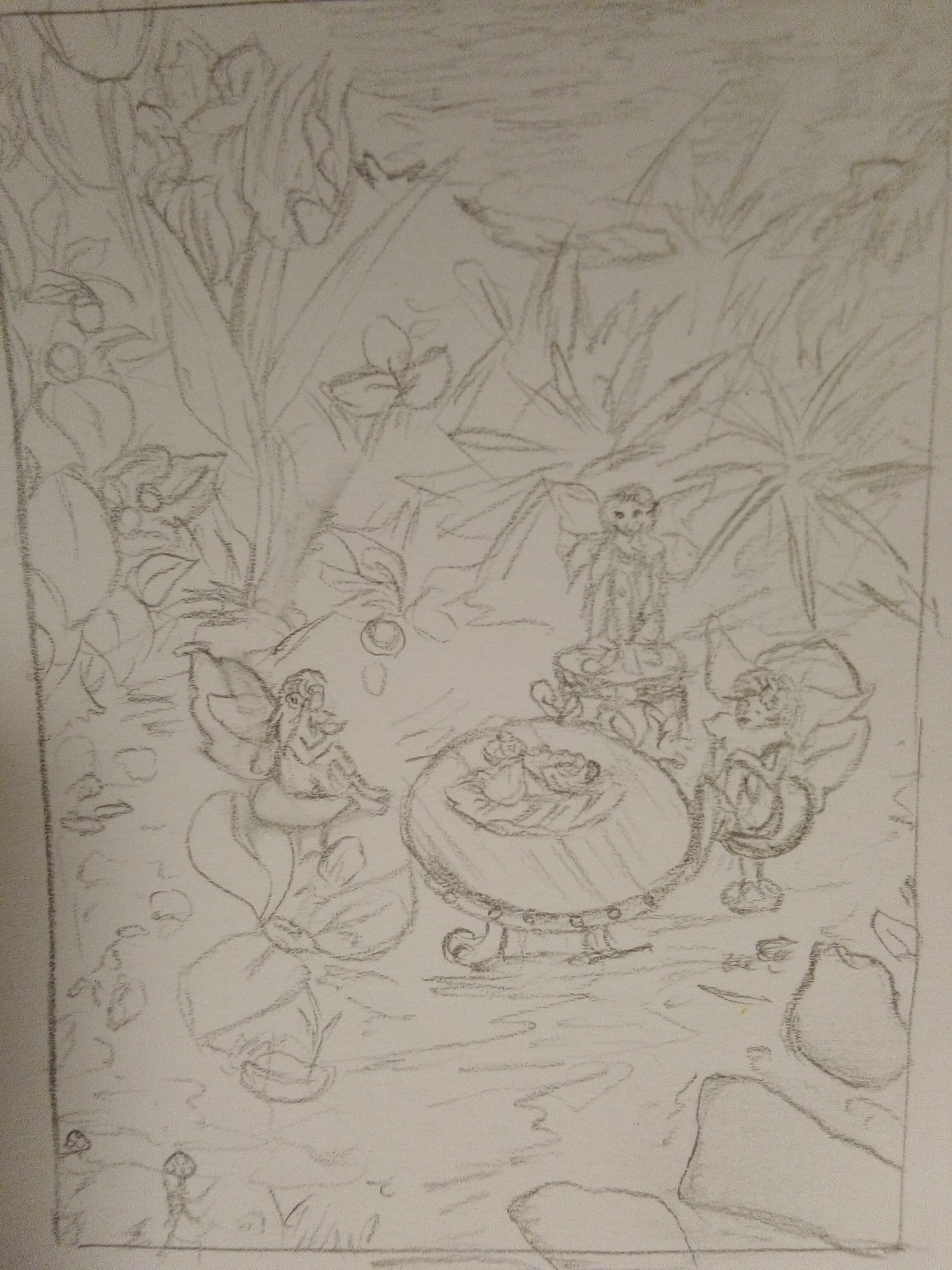 ich habe eine zweite (super grobe) Skizze. Es sind drei kleine Feen, die ihren Tee im Grün unter Tulpen nehmen.