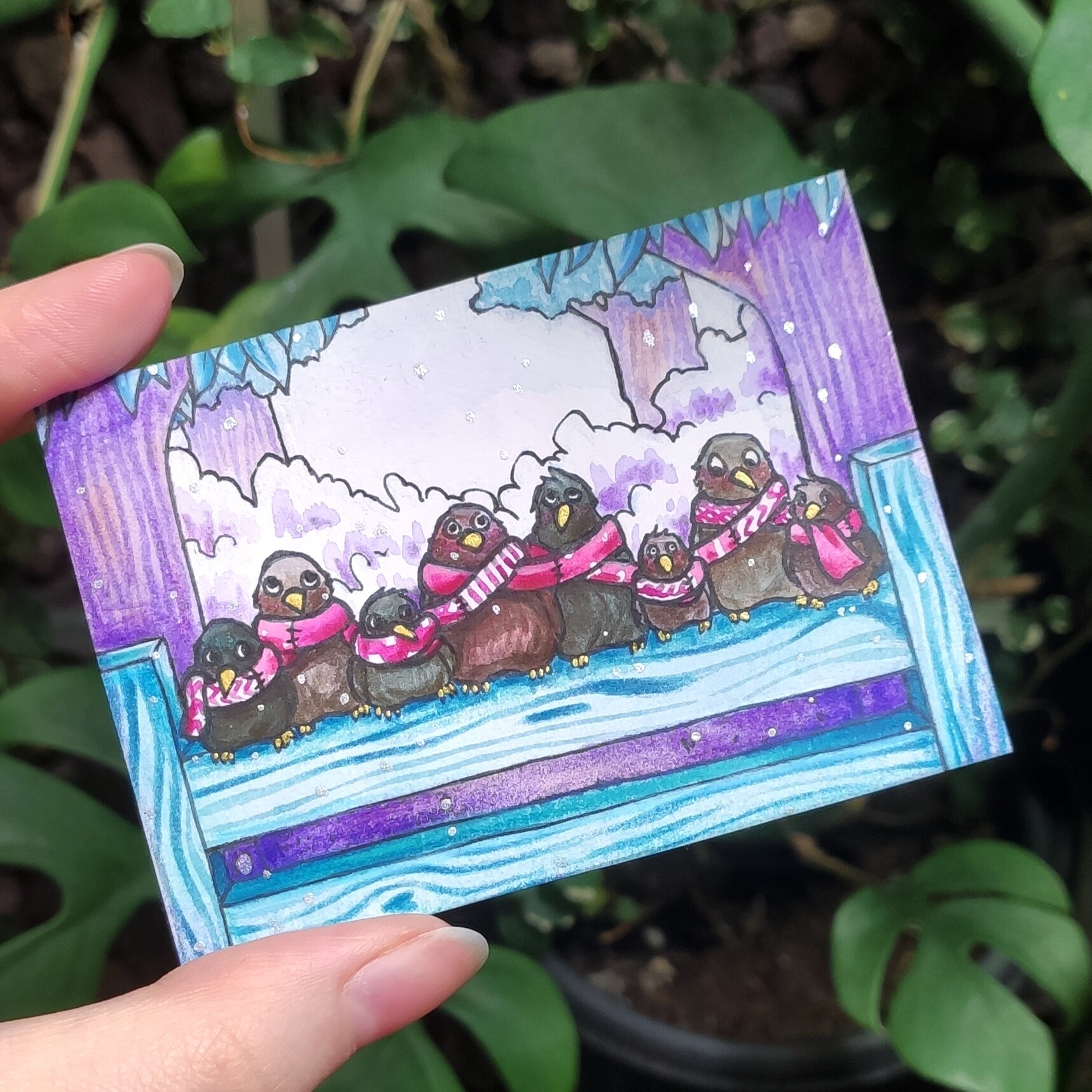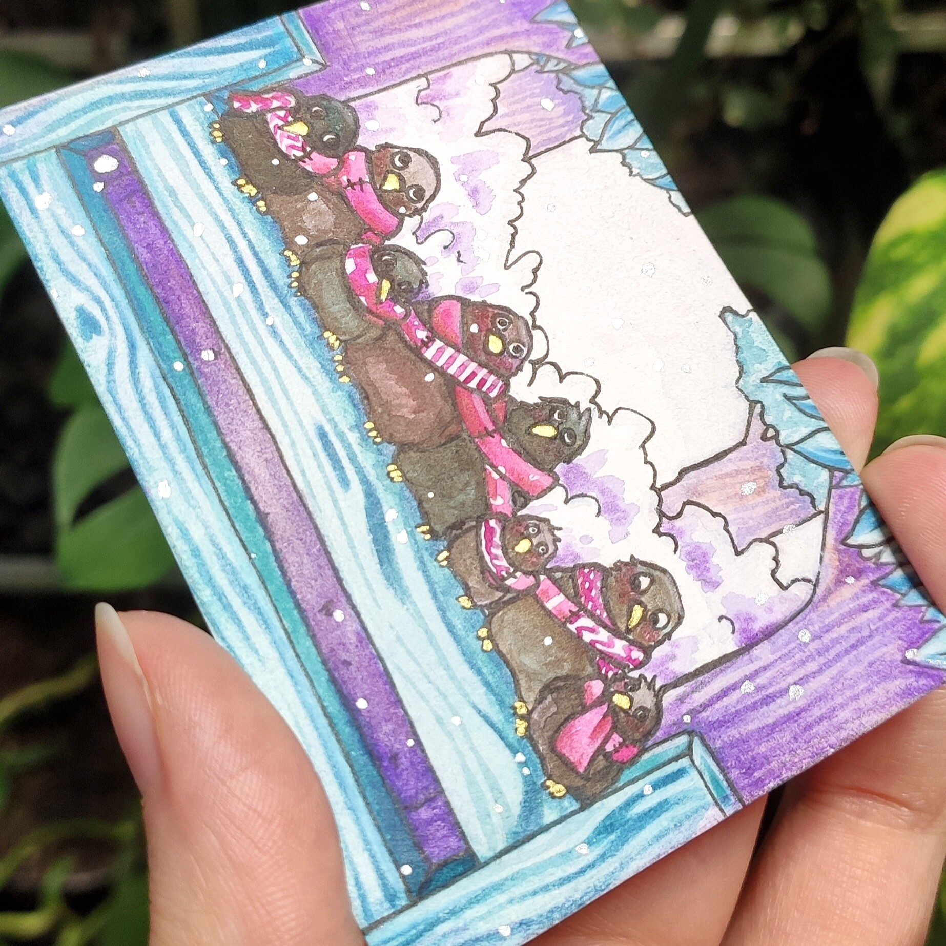 Hab dann versucht mit Buntstiften die Situation halbwegs zu retten. Ich hoffe die Karte ist so in Ordnung und ich die nicht ganz verkackt habe… Ah, die Schneeflocken und die Schnabel und Füße der Vögel sind Glitzer Aquarelle.