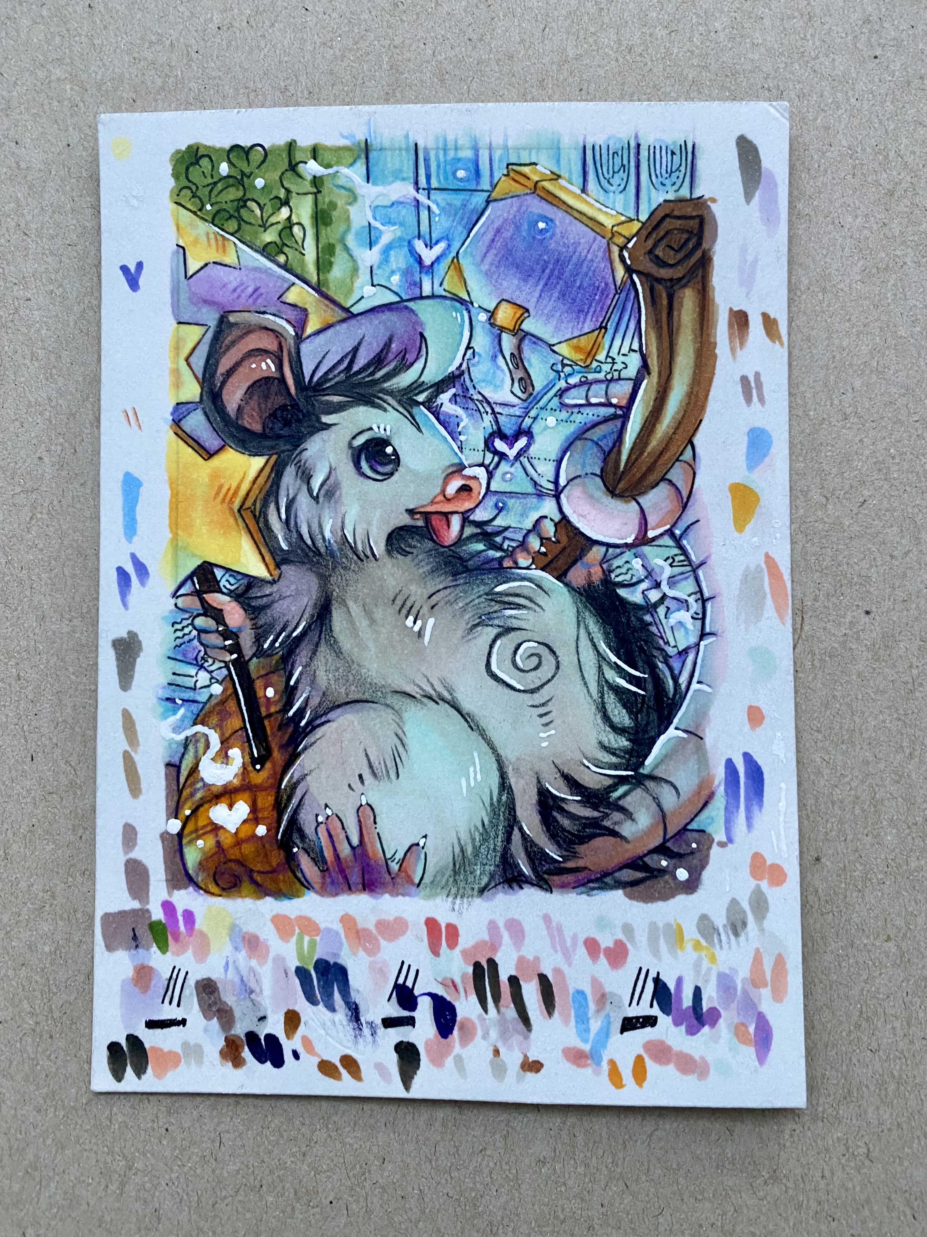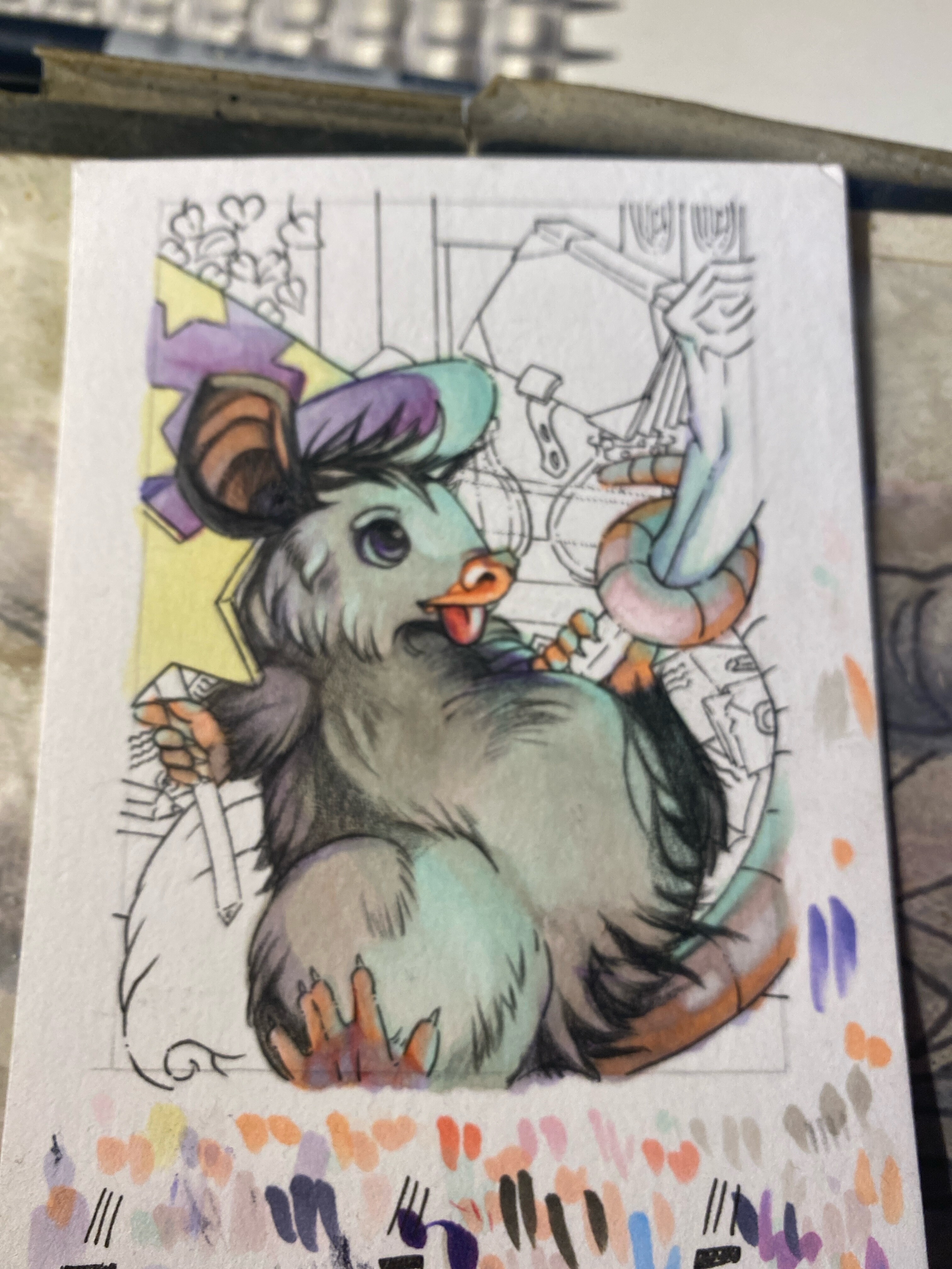 Von mir auch mal ein Zwischenstand: Karte 1 hat die ersten Farben bekommen, aber trocknet erstmal bis morgen, dann kommen noch die glitzerschuppen und der Untergrund.