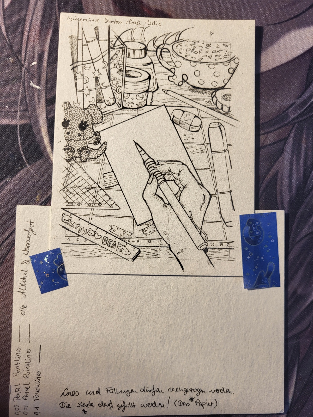 Haaa~ Das mit den anderen Farben für Lines hat sich übrigens erledigt. Zum Glück hab ich es vorher nochmal getestet, aber sie sind nicht ganz wasserfest…🥲(bisher hatte ich sie nur für Copic-Colo genommen ) Mist