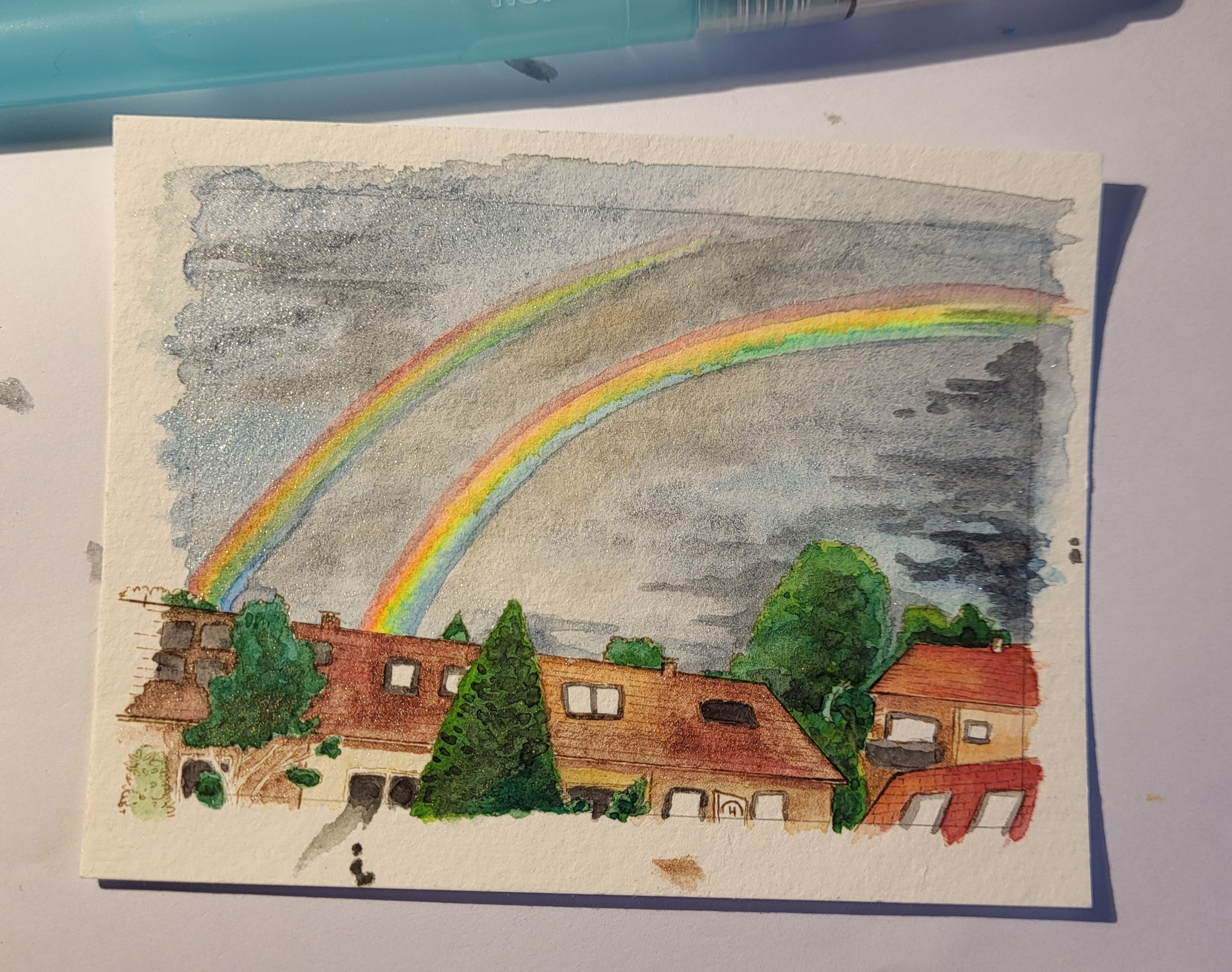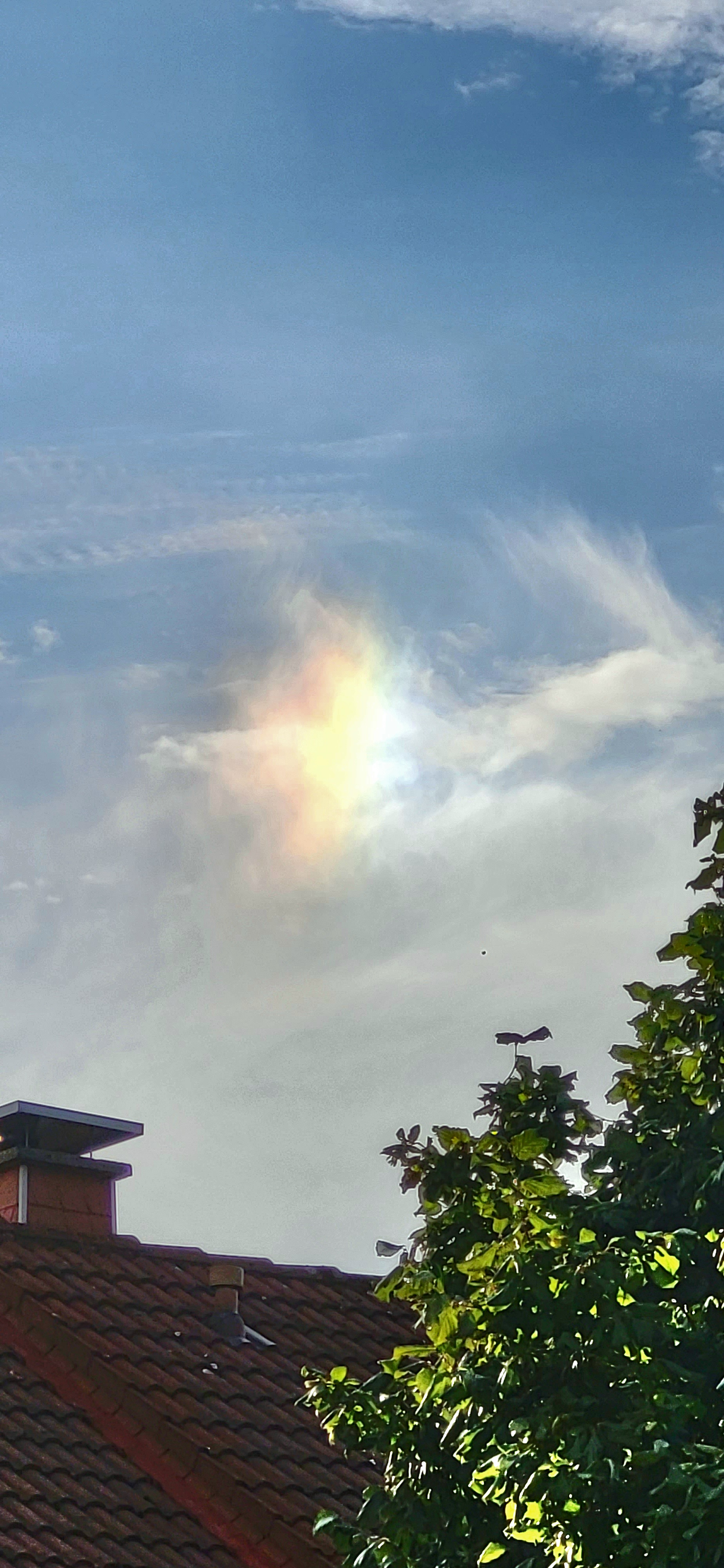 Ich habe gerade zwei Fotos gemacht, die ich euch zeigen muss. Habt ihr schonmal einen Miniregenbogen bei ansonsten fast blauem Himmel gesehen?