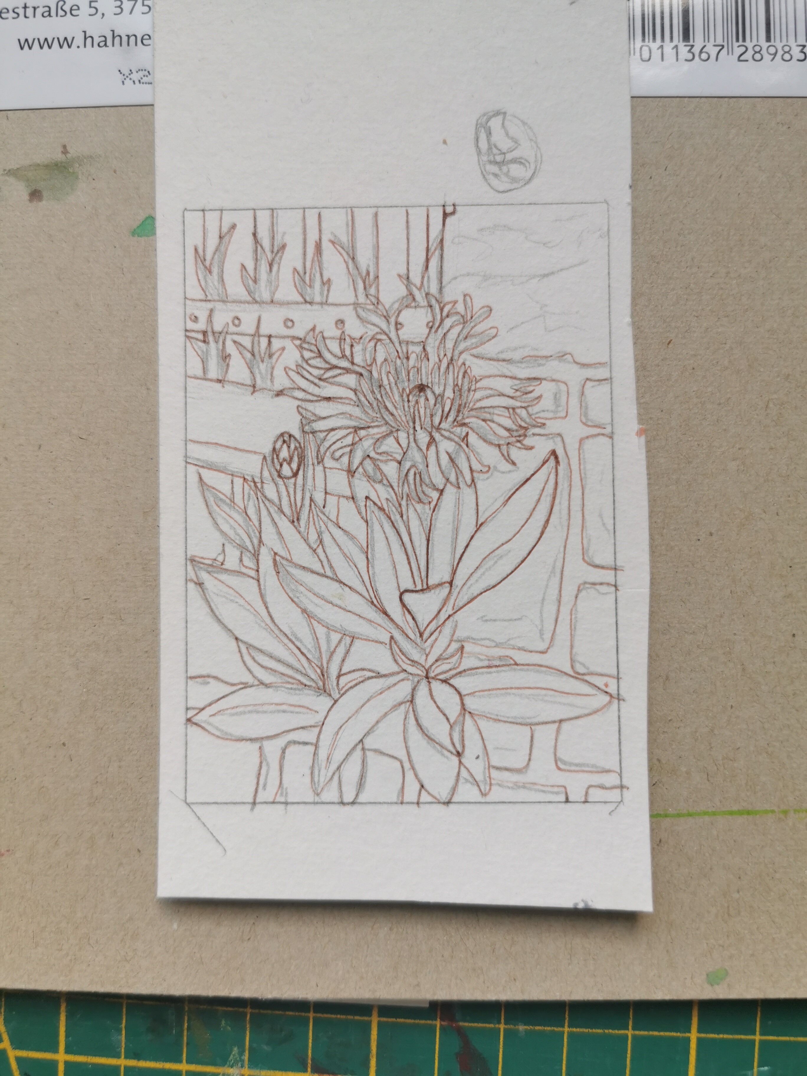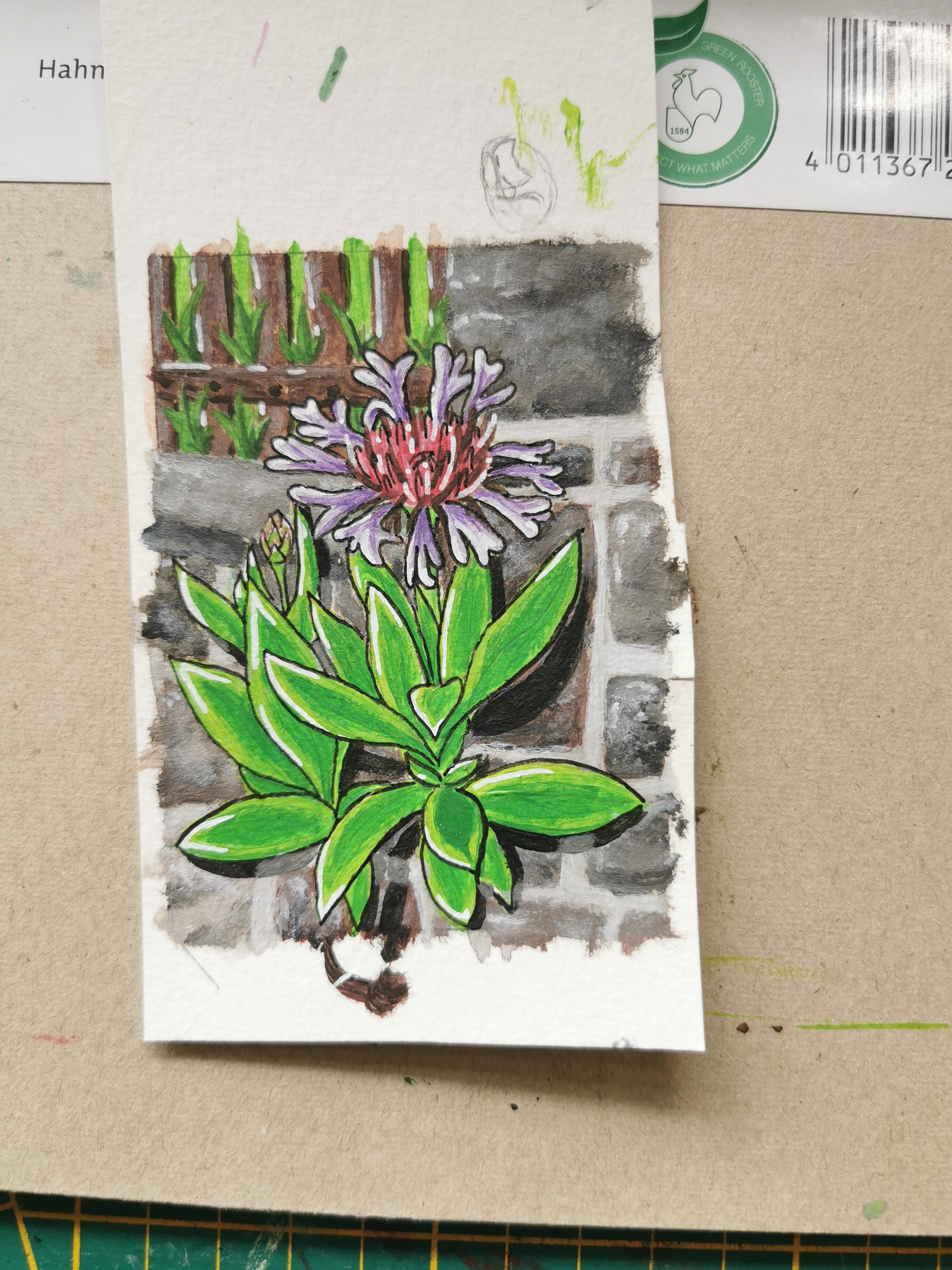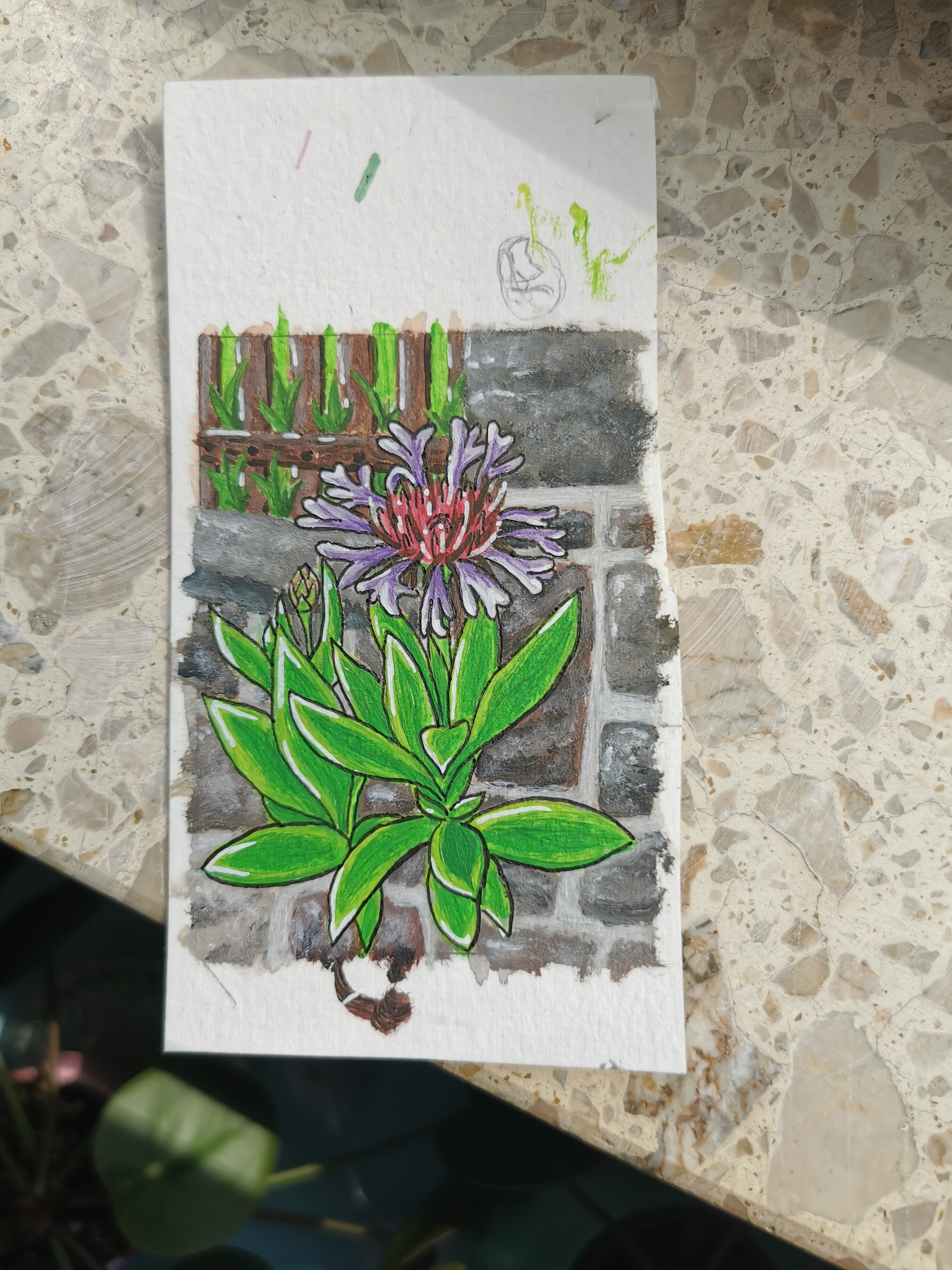 Kannst du unter/hinter den Blättern noch Schatten andeuten, die Blume steht ja etwas von der Wand ab und müsste damit einen Schattenwurf aufs Mauerwerk haben.
