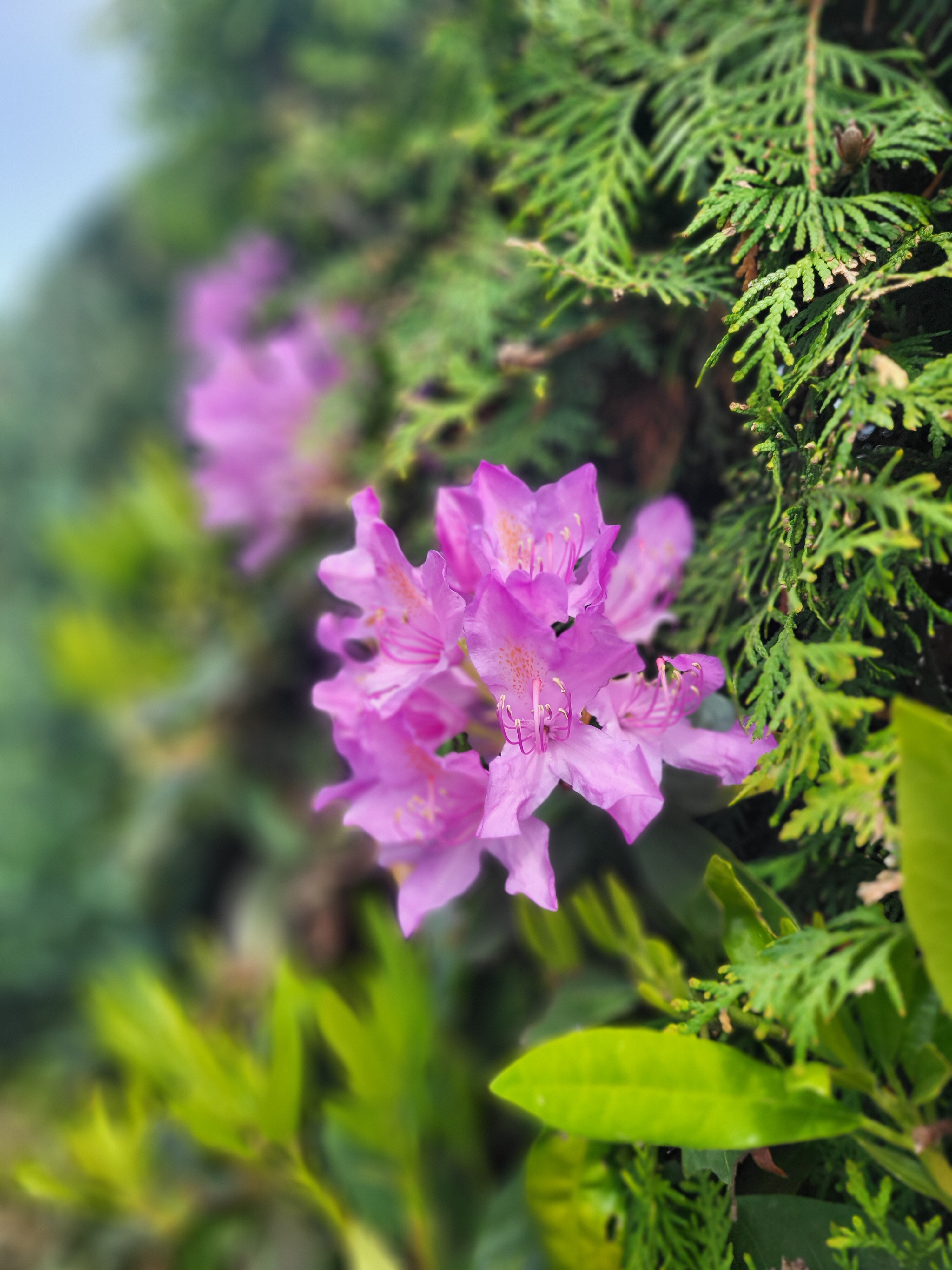 Nettes Bokeh. Was ist das für eine Mischhecke? Rhododendron, Efeu und Zypresse (?) in einer Hecke? Spannend.