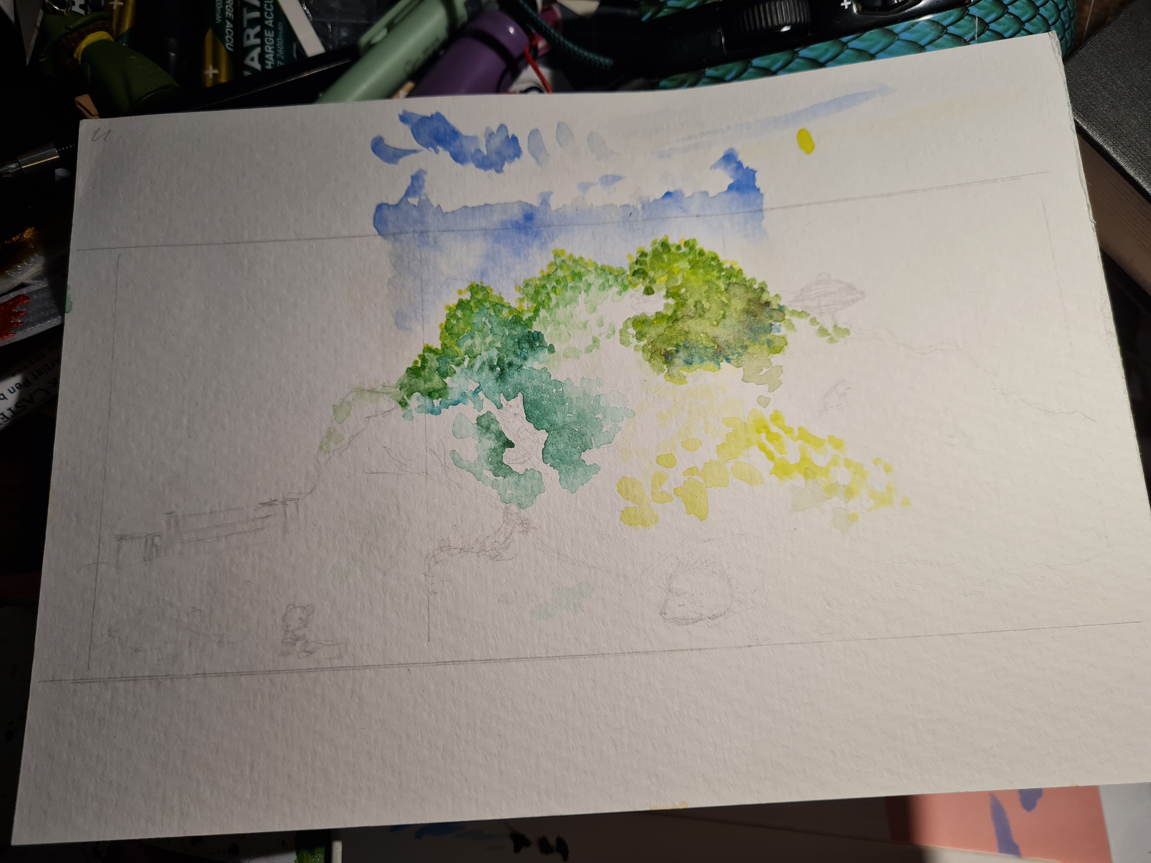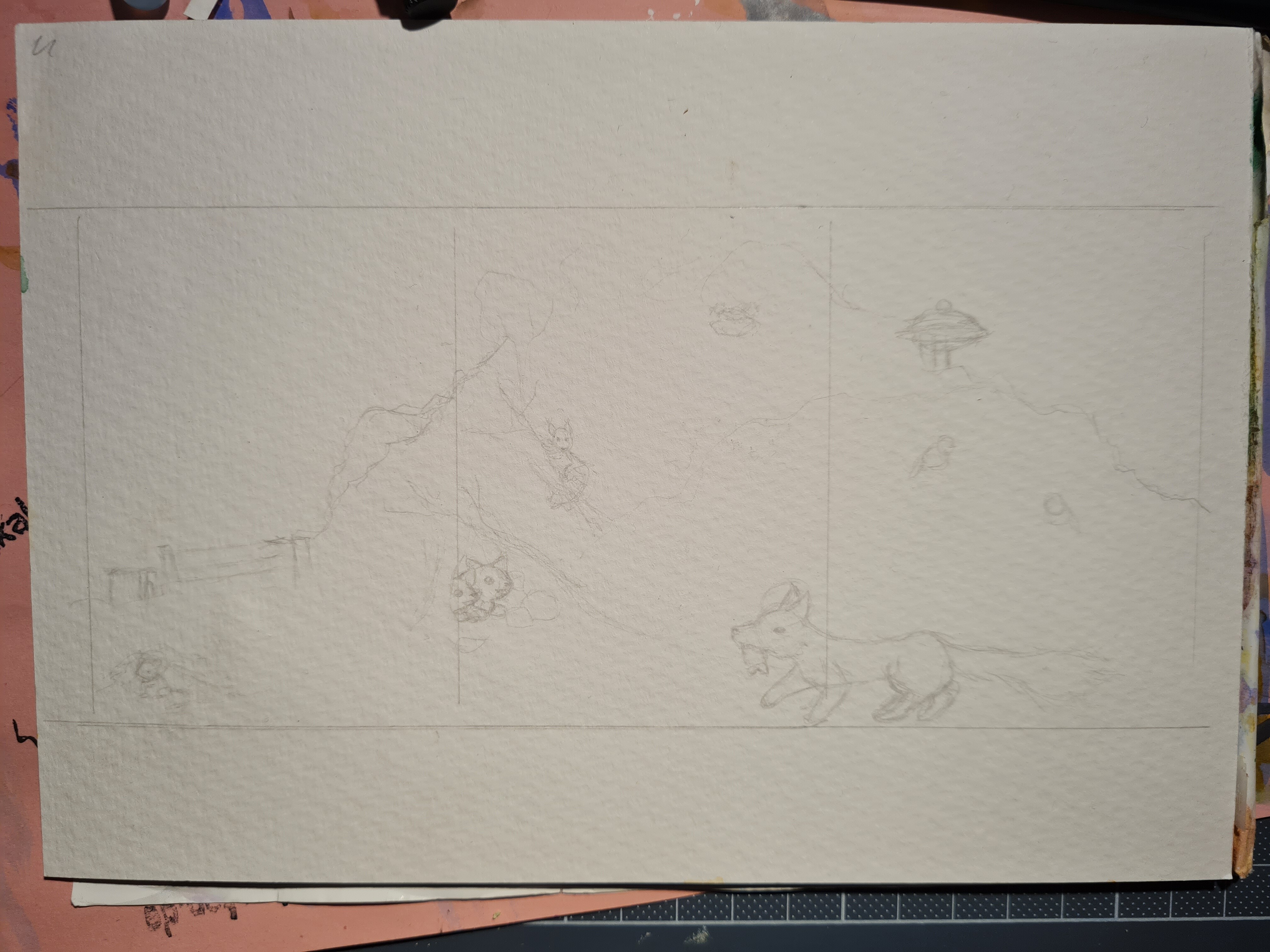 Ich möchte gerne eine Klappkarte machen, mit der realen “Schönheit” außen und der versteckten Schönheit beim Öffnen. Ich habe gerade die erste Skizze dazu gemacht, aber auch, wenn es lauter Tiere sind, die mir hier in der Gegend schon über den Weg gelaufen sind sieht es gerade finde ich mega kitschig aus. Deswegen die Frage: Kitsch ja oder lieber auf realistischer runter reduzieren?