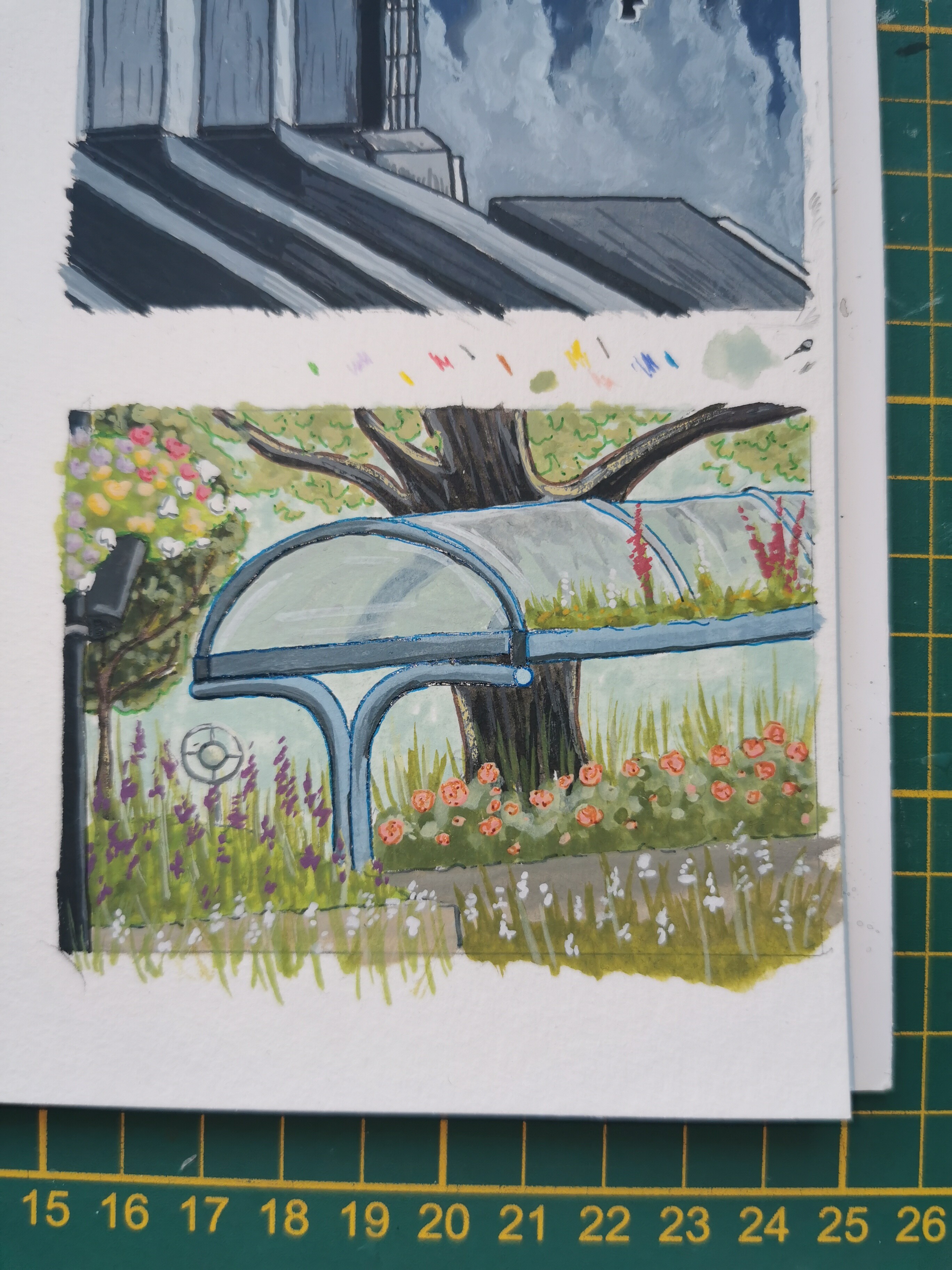 diesmal der Blick aus meinem Wohnzimmerfenster, abgezeichnet von diesem selber geschossenen Foto :