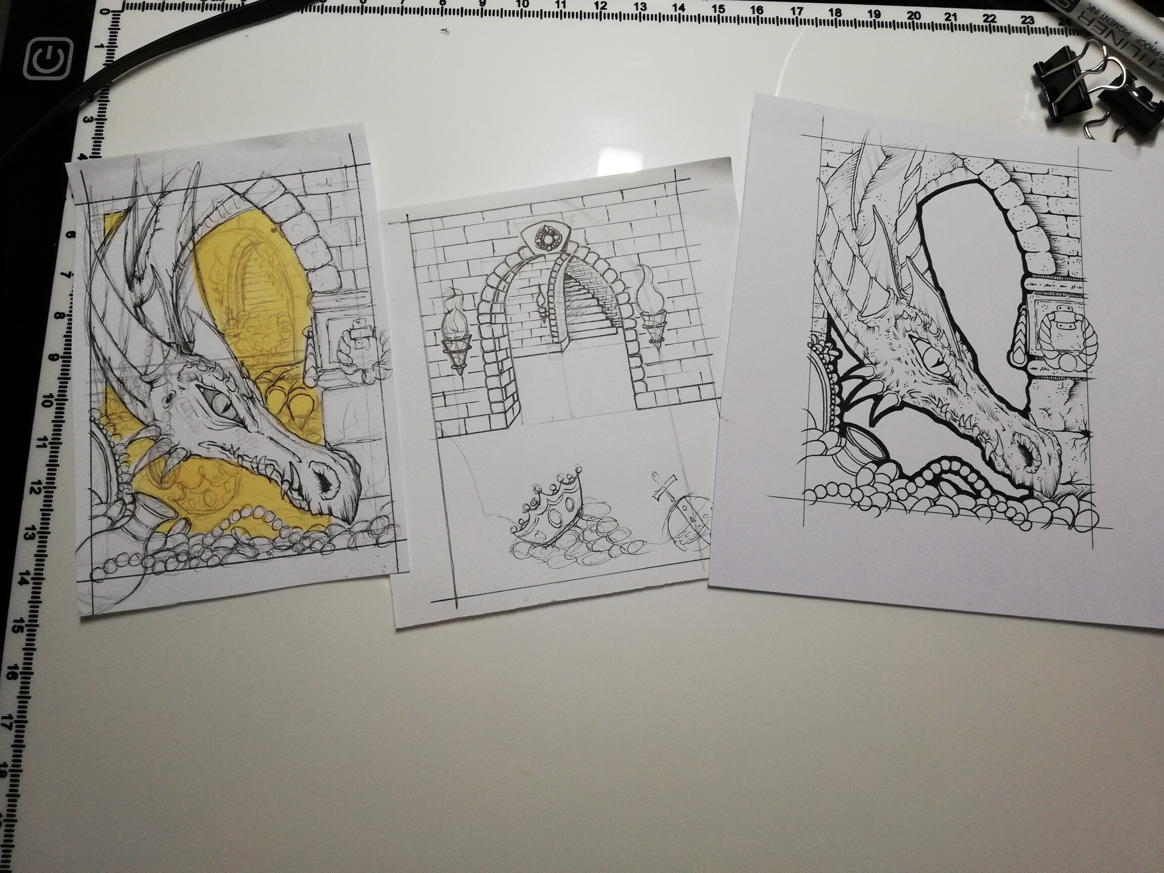 Links die Skizze (gelb = hohlraum) , in der Mitte die grobe Aufteilung fĂŒr den Hintergrund⊠der Boden wird natĂŒrlich noch mit SchĂ€tzen aufgefĂŒllt. Rechts die fertigen Outlines fĂŒr den Vordergrund der Karte (der Rand an den Schnittkanten ist extra so fett, damit es nicht so auffĂ€llt, falls ich mich verschneide XD)