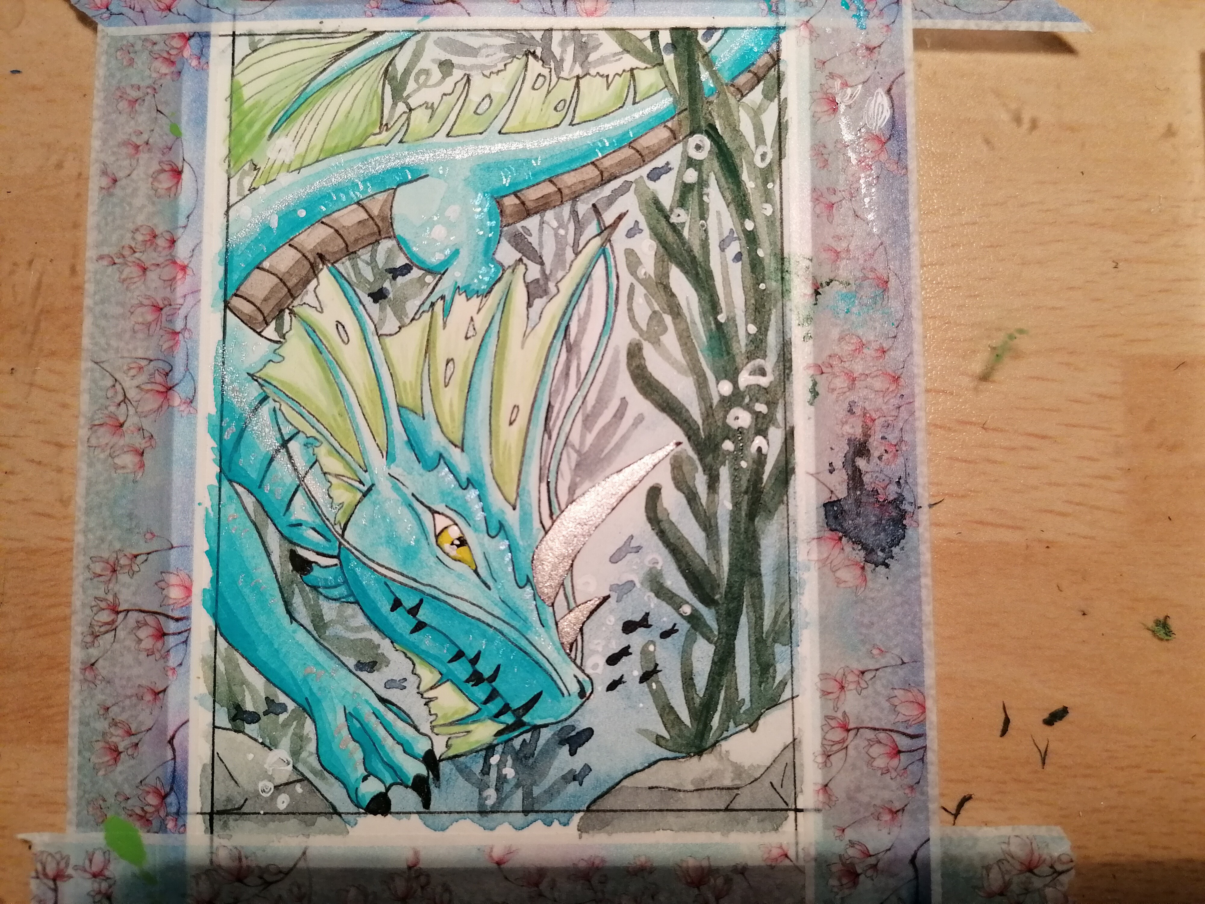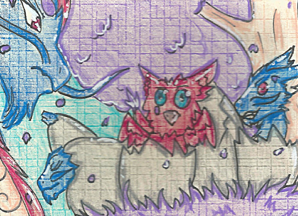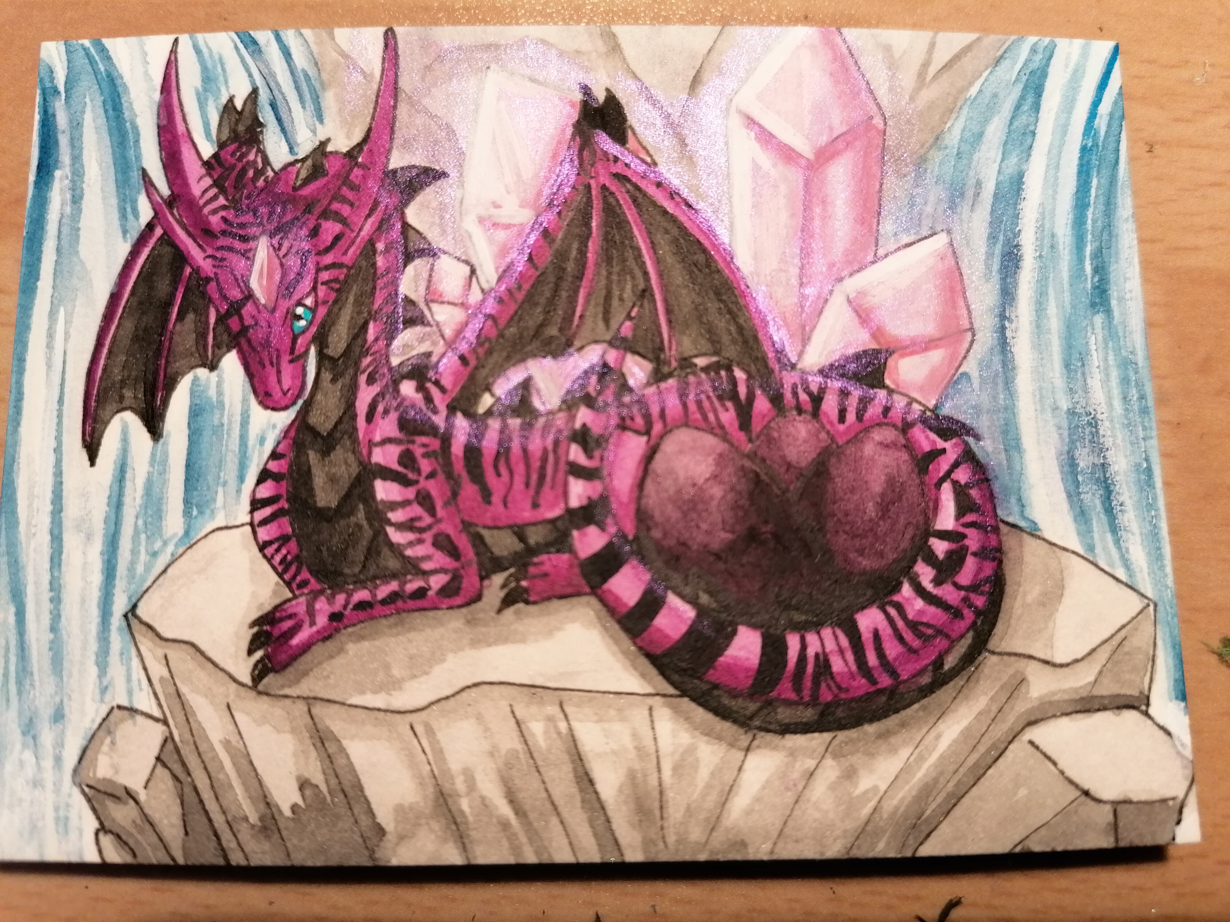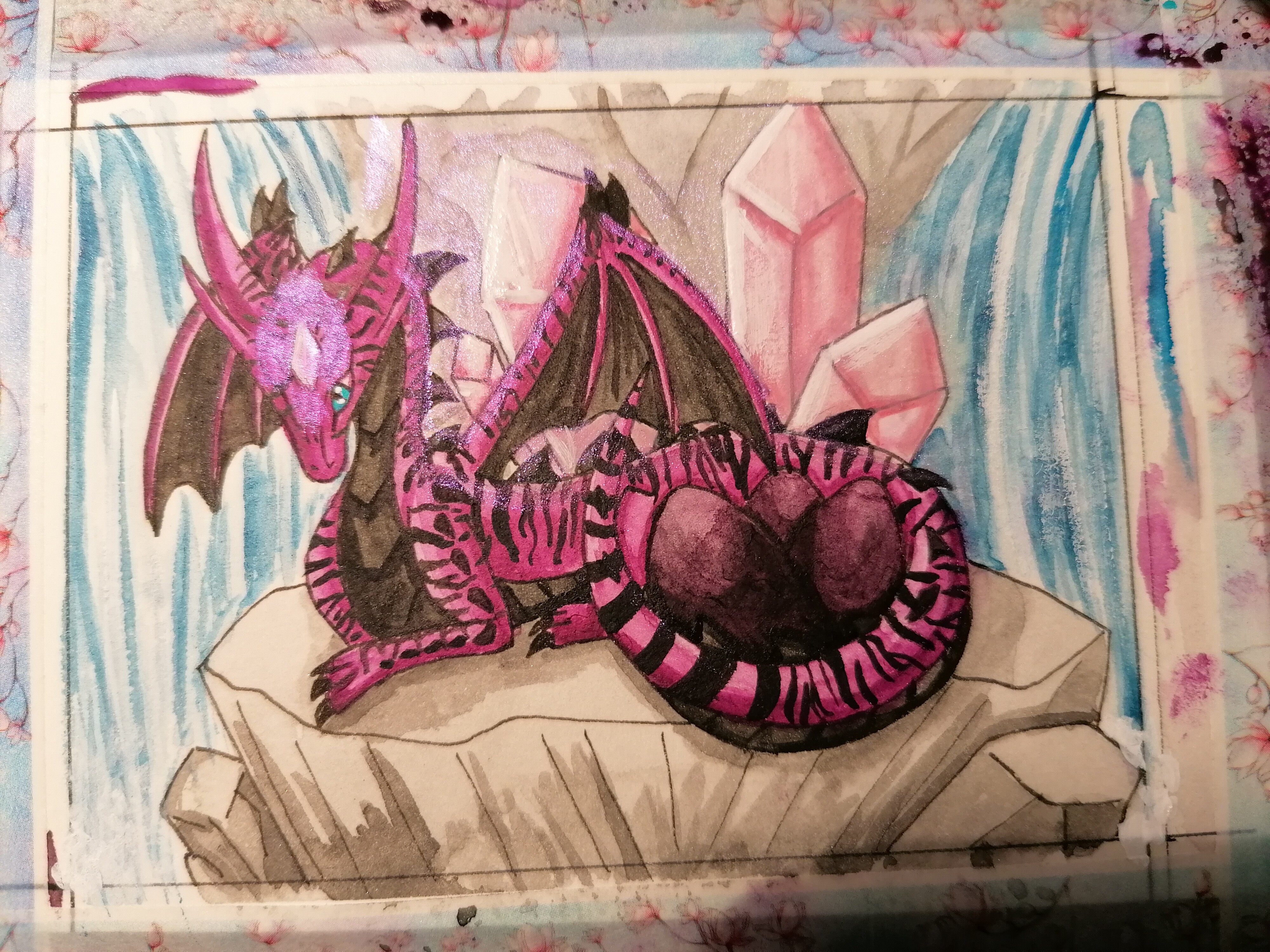 Bei der Karte mit dem Pinken Drachne würde ich vielleicht noch den Stein etwas mehr struktur geben :) Der sieht im Vergleich zum Rest vom Motiv bisschen halbfertig aus. Würde den Schatten direkt unter der Linie von der Kante machen, dann wirkt er gleich plastischer - so wie rechts unten das Stückchen