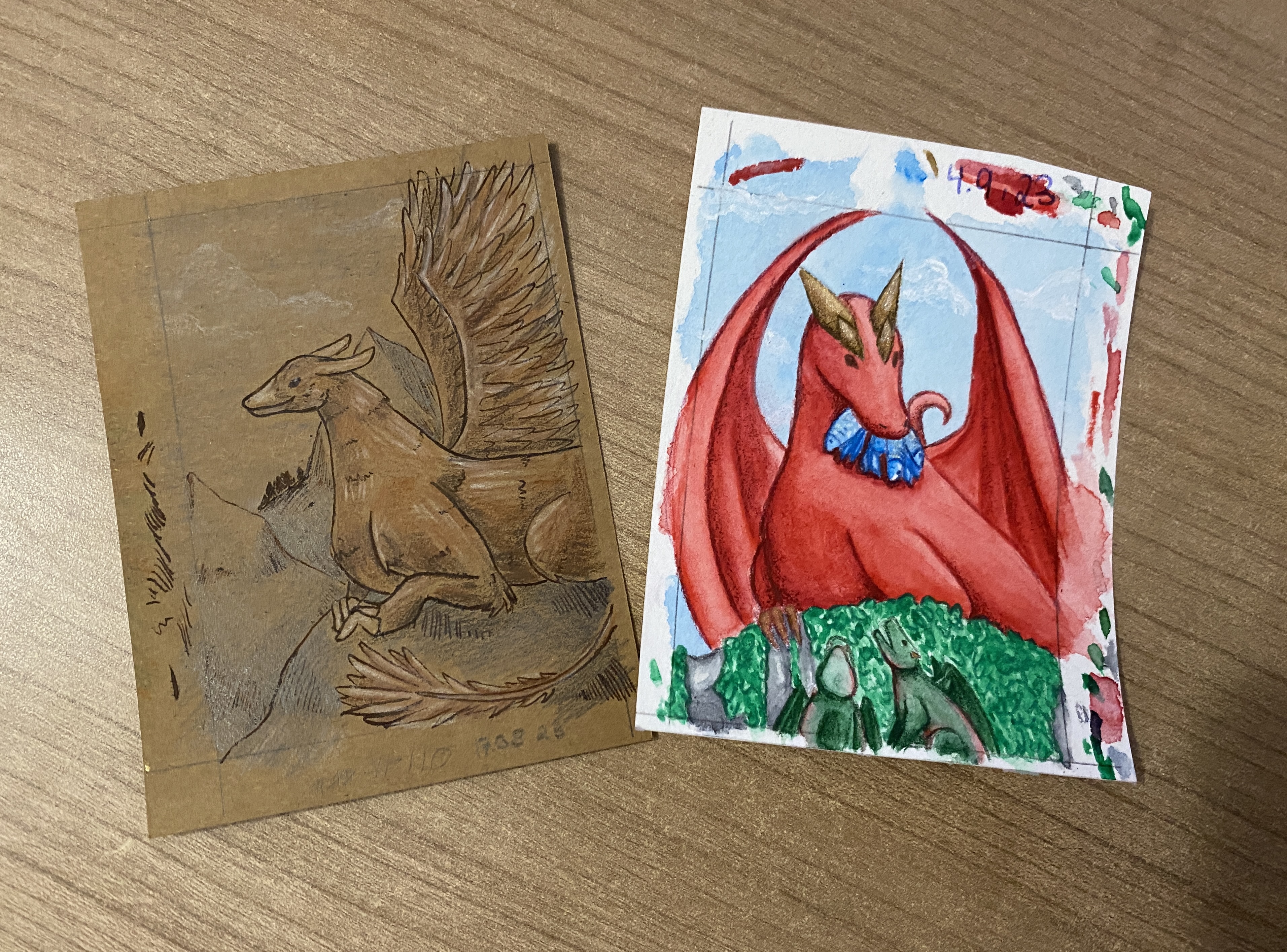 Ich sitze inzwischen auch endlich an meiner zweiten Karte - hatte bisher einfach keine Idee :‘D. Aber dafür hier jetzt Mini-Drachen in der Bibliothek :). Bin noch ein wenig am Überlegen was ich noch in die Bücherregale packe und ob ich noch ein zweites Bücherregal dazu male oder ein Fenster oder vielleicht doch etwas anderes. Mal schauen. Ich hoffe die Idee und Umsetzung ist so in Ordnung :).