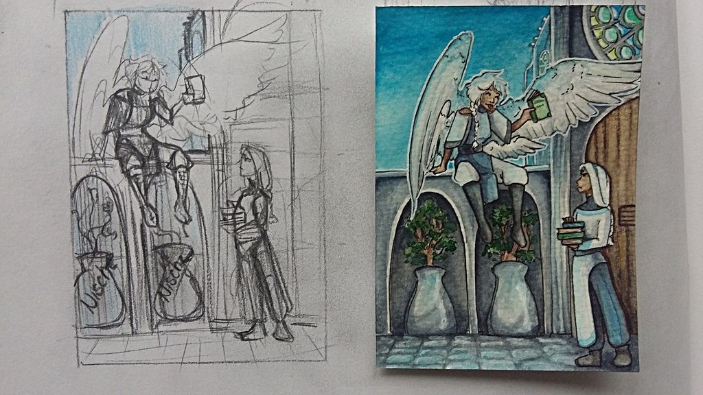 Ich bins nicht wirklich gewöhnt Ganzkörper auf so kleinem Format zu zeichnen und auch Charaktere, die mit dem Hintergrund interagieren fallen mir manchmal noch ein bisschen schwer (selbst wenn die Interaktion nur “sitzt da” ist :'D). Und über meine Entscheidung, diesen Spiegel so ins Bild zu packen habe ich beim Malen auch geflucht.