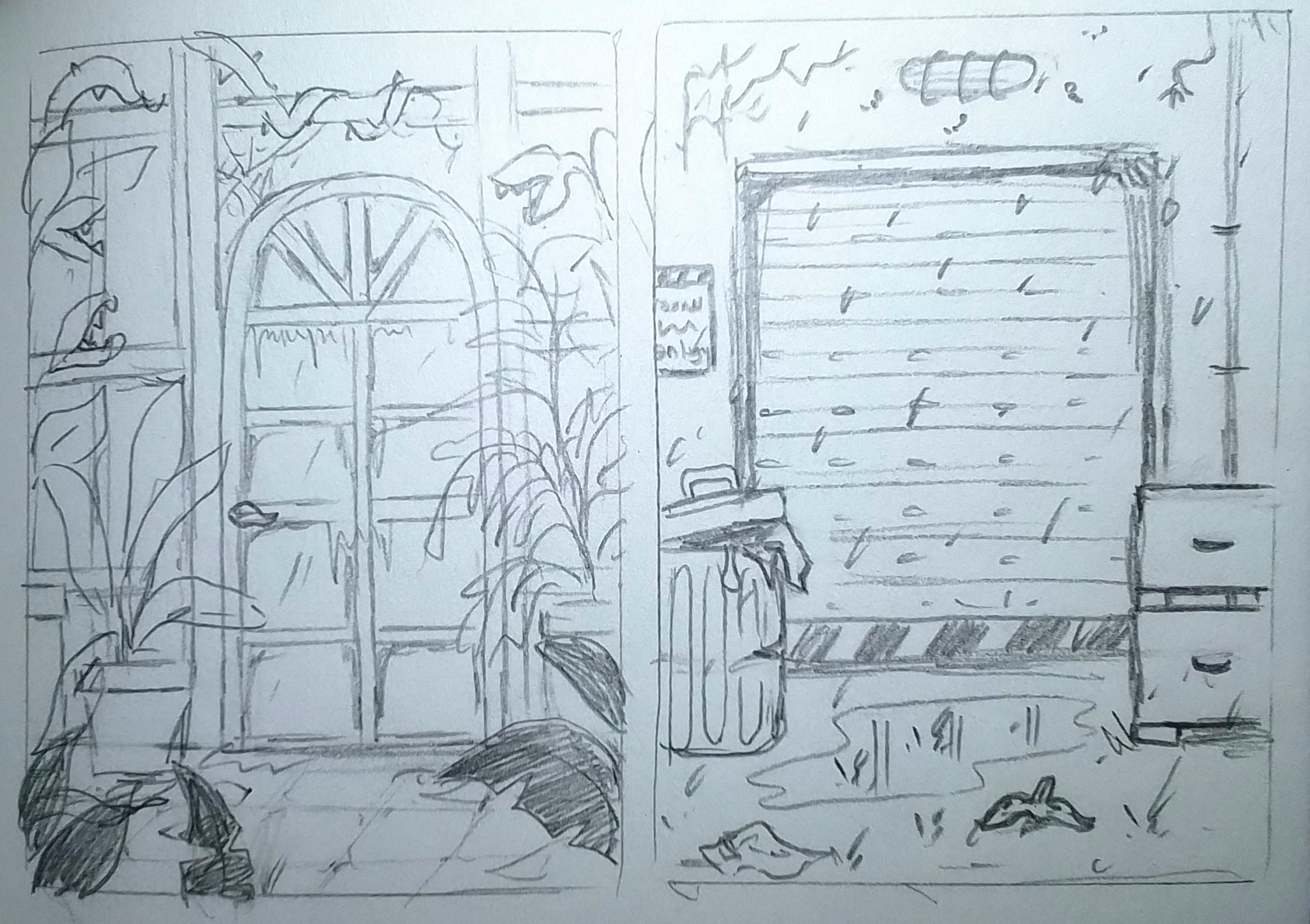 Hier nun meine erste Skizze ich wollte eine Tür in einer sumpfigen Landschaft darstellen.