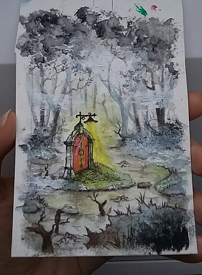 Die Landschaft ist jetzt bräunlich-blau gehalten und ohne Outlines nur mit Aquarell, damit sich die Tür mit Outlines noch mehr abhebt.