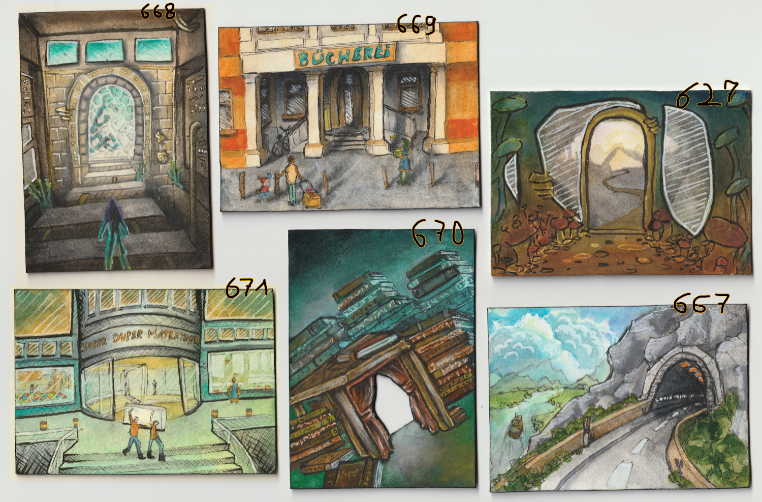 Sehr coole WIPs schon, bin super gespannt auf die fertigen Karten! Falltür als Eingang ist auch interessant, daran hab ich gar nicht gedacht xD Vom Motiv her ist der Fokus schon sehr auf dem Charakter, aber für die “Szene” ist die Falltür verantwortlich, also wäre das noch OK