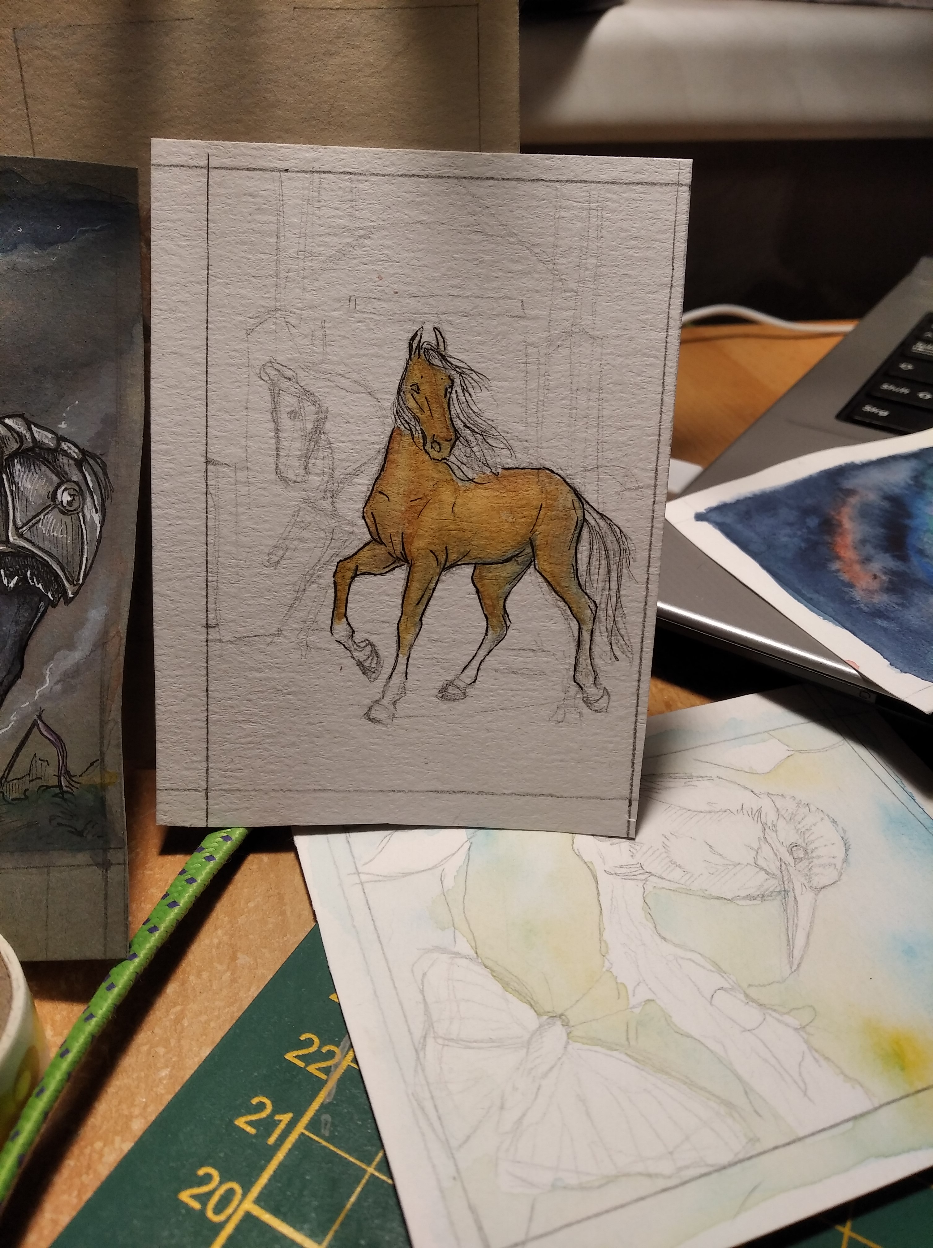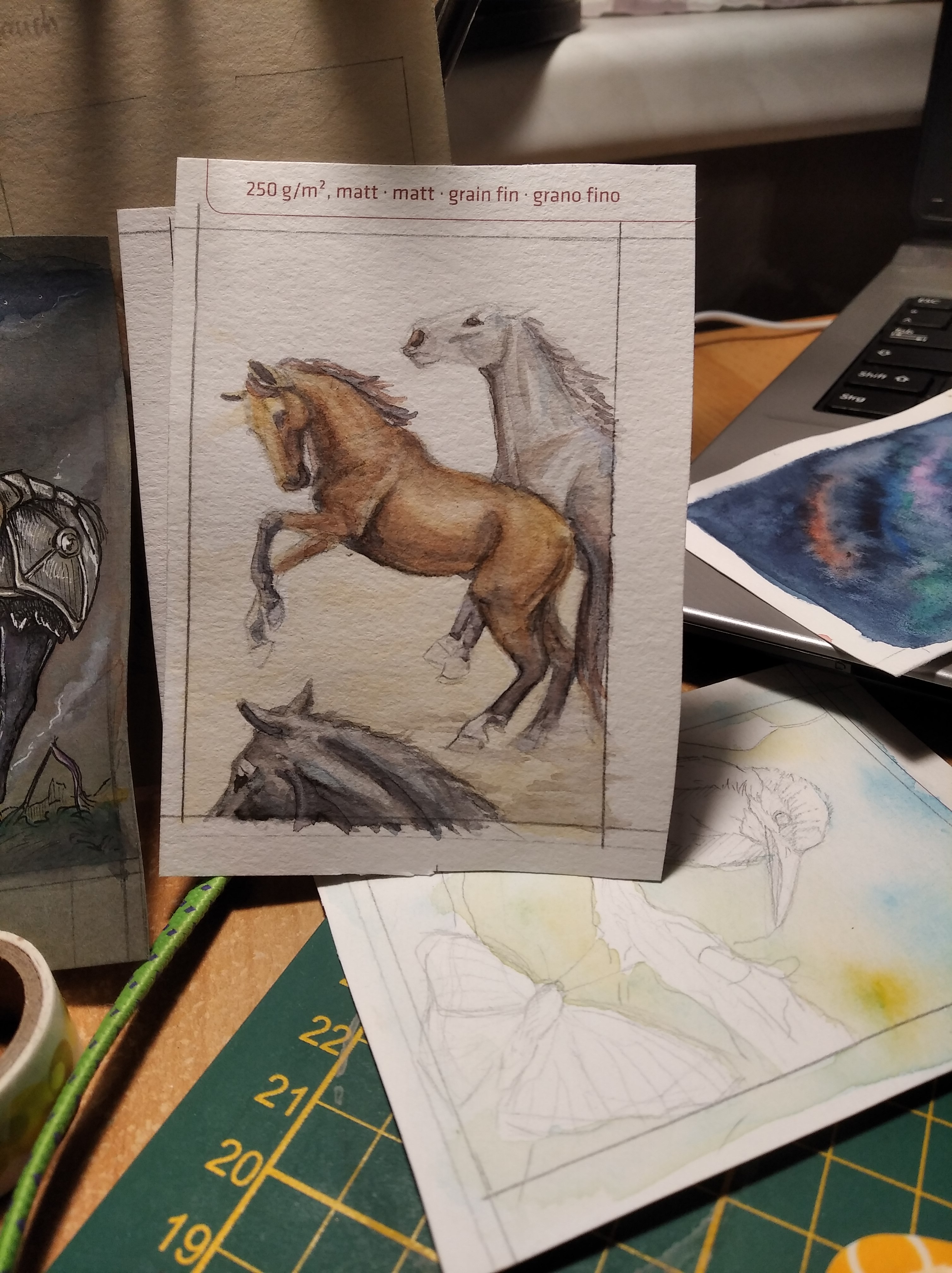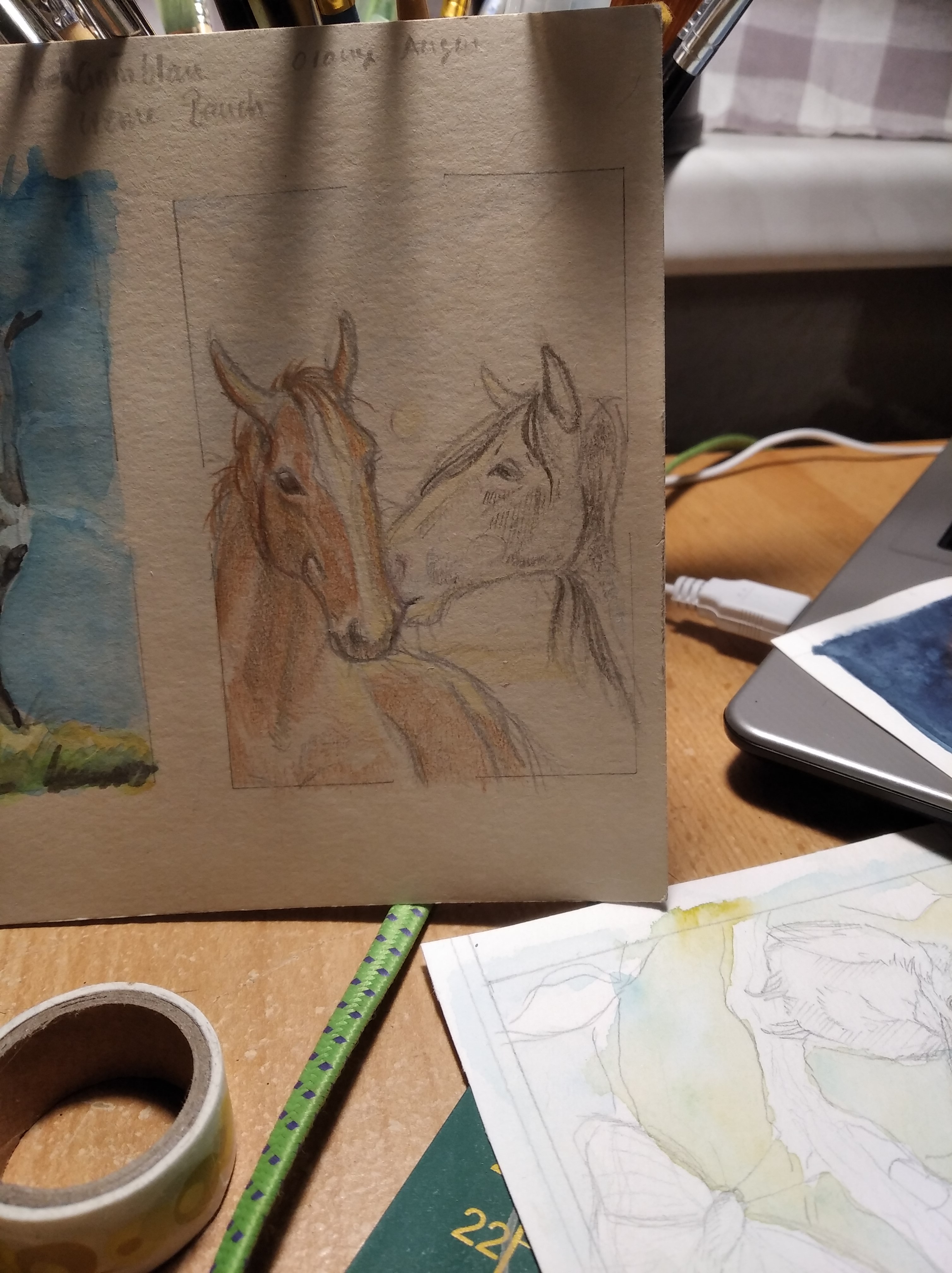 Ideen hätte ich ein paar. Unter anderem würde ich gerne ein hübsches Kriegsross in Montur zeichnen und ein altes Pferd/Pony mit einer alten Katze, die sich gegenseitig Gesellschaft leisten. Eventuell eine Gouache- oder Kratzkarte probieren.