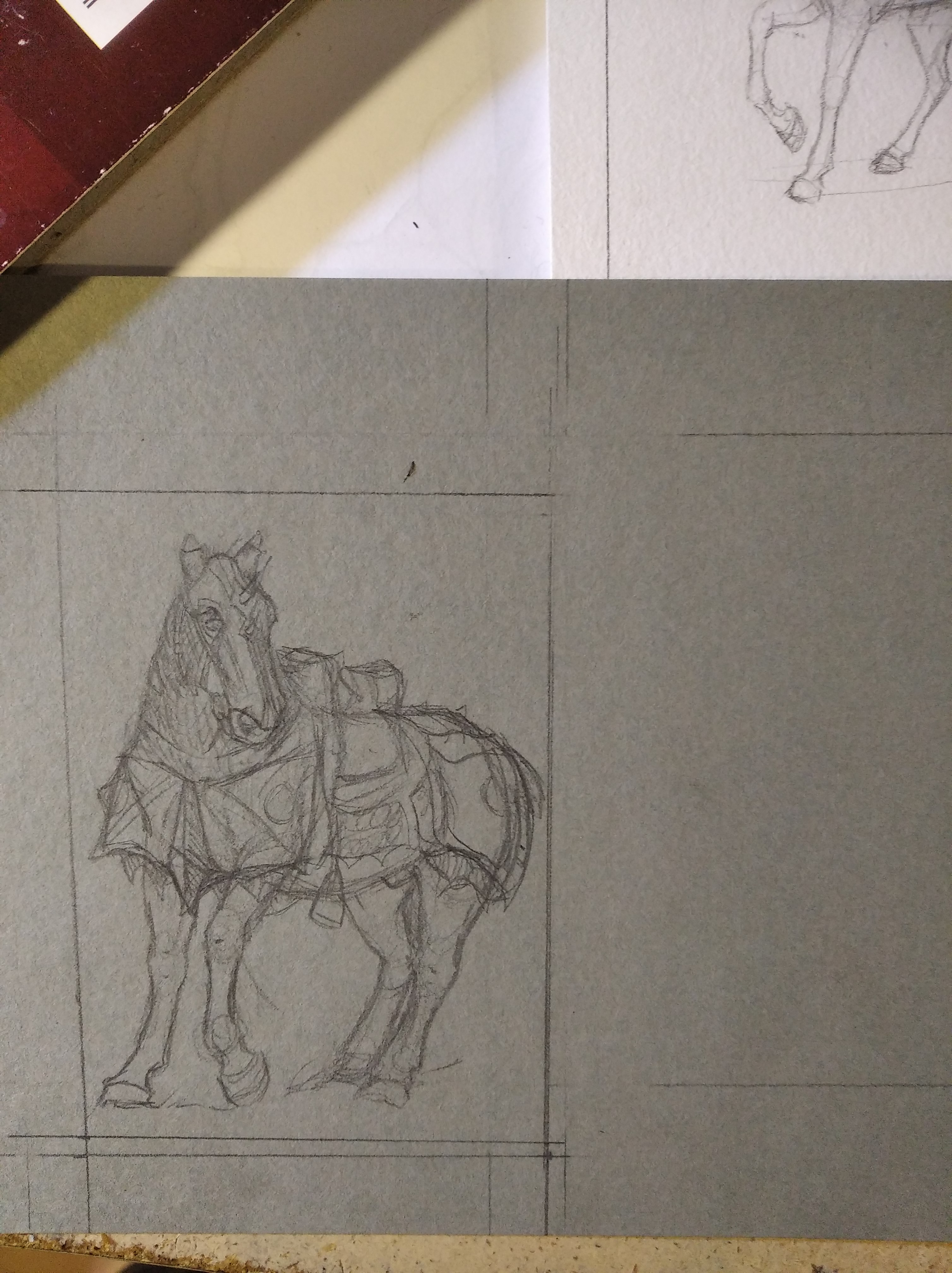 Ich mag Kriegsrösser in Rüstung einfach unglaublich gerne. Mein erster Versuch auf grauem Papier. Mal sehen, wie es werden wird.