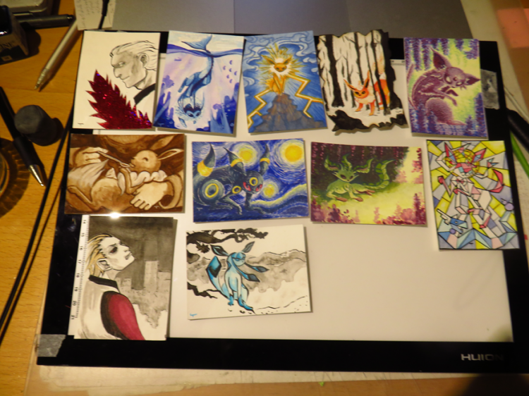 Puh ich hätte es auch soweit geschafft und meine Beiträge fertig, sollten sie so okay sein :) Hab mich extra schon an ihnen gesetzt, damit ich genügend Zeit für Ersatzkarten hätte, sollte ein oder mehrere nicht zugelassen werden. Da Pokemon, wie gesagt eine Herausforderung für mich sind. Aber hat dennoch mega Spaß gemacht mich mit ihnen auseinander zu setzen, besonderst da Evoli und co. fast das einzige sind was ich noch von Pokemon mag. Muss sie dann nur scannen und einreichen. Daher erst mal meine Instagram-Links und die Farben sind alle auch besser als auf den Fotos. Hoffe die Scans werden besser.