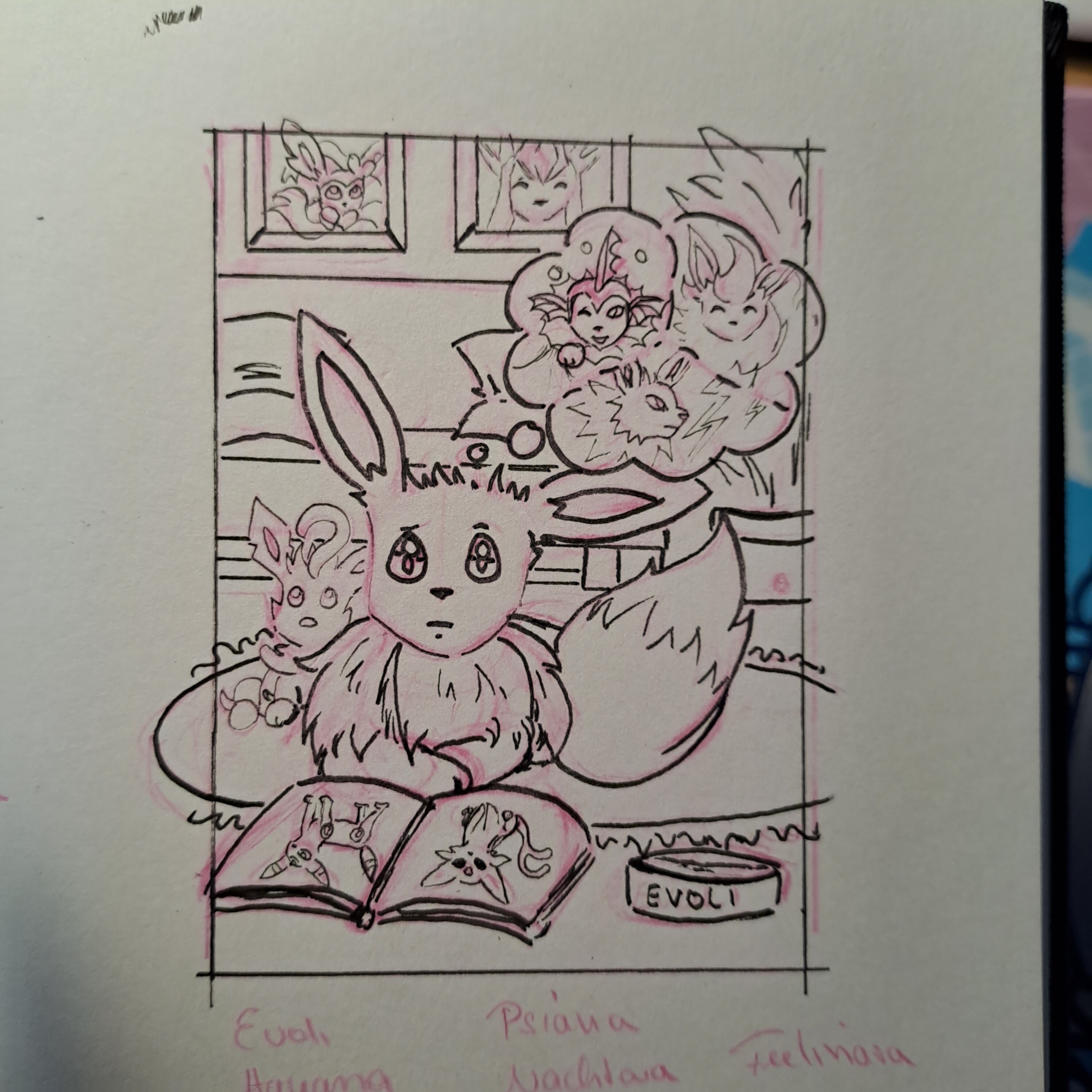 2.) Wenn ich groß bin, werde ich…: Ein unentschlossenes Evoli. Ich möchte gerne verschiedene Referenzen zu seiner Entwicklung ins Bild einbauen, ein Poster oder Plüschi einer seiner Entwicklungen im HG etc.