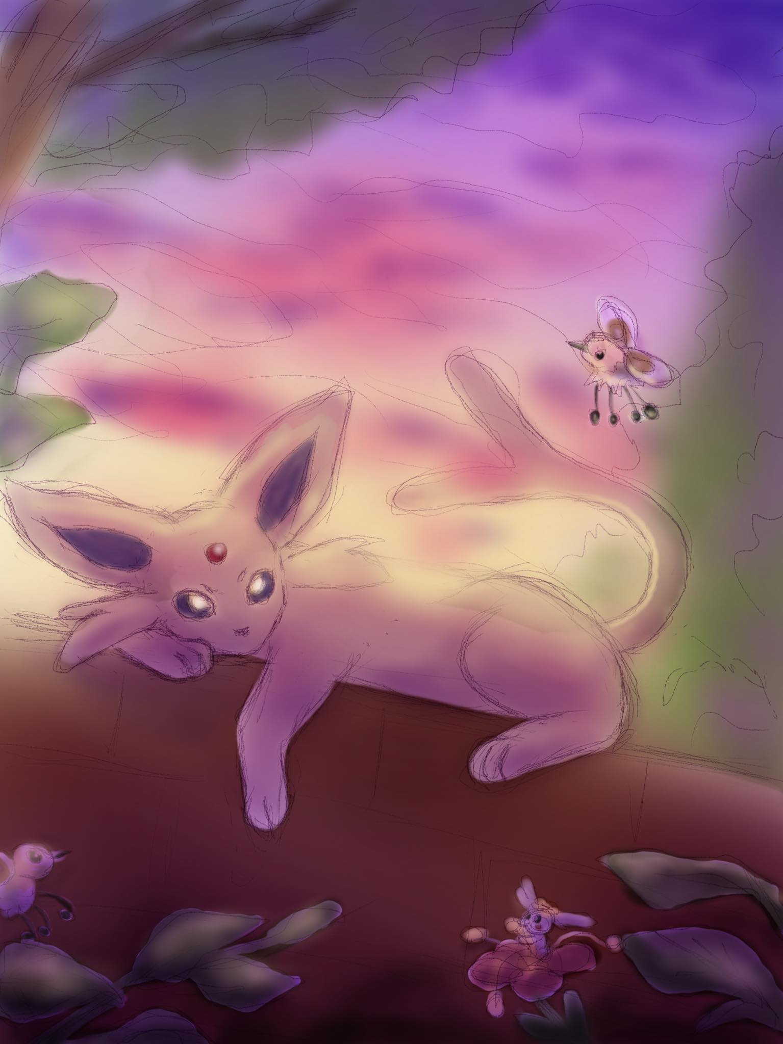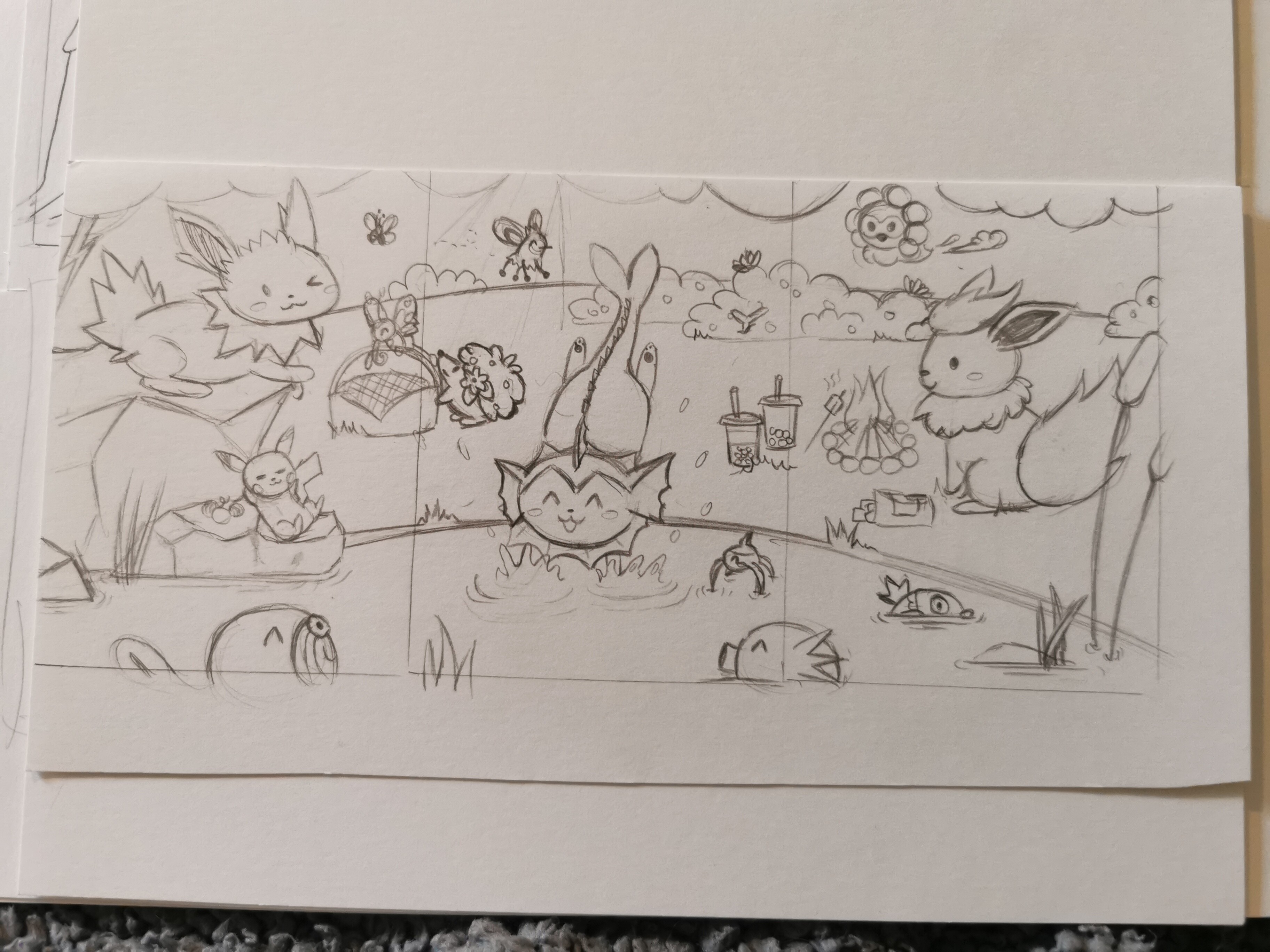 Ich habe tatsächlich zuerst nur das Aquana gezeichnet, ohne zu wissen, wohin mich der Prozess verschlägt… nun dachte ich mir, dass ich es doch ziemlich gut mit einem Shiggy bei einem Beachvolleyball-Spiel in Szene setzen könnte. ^^