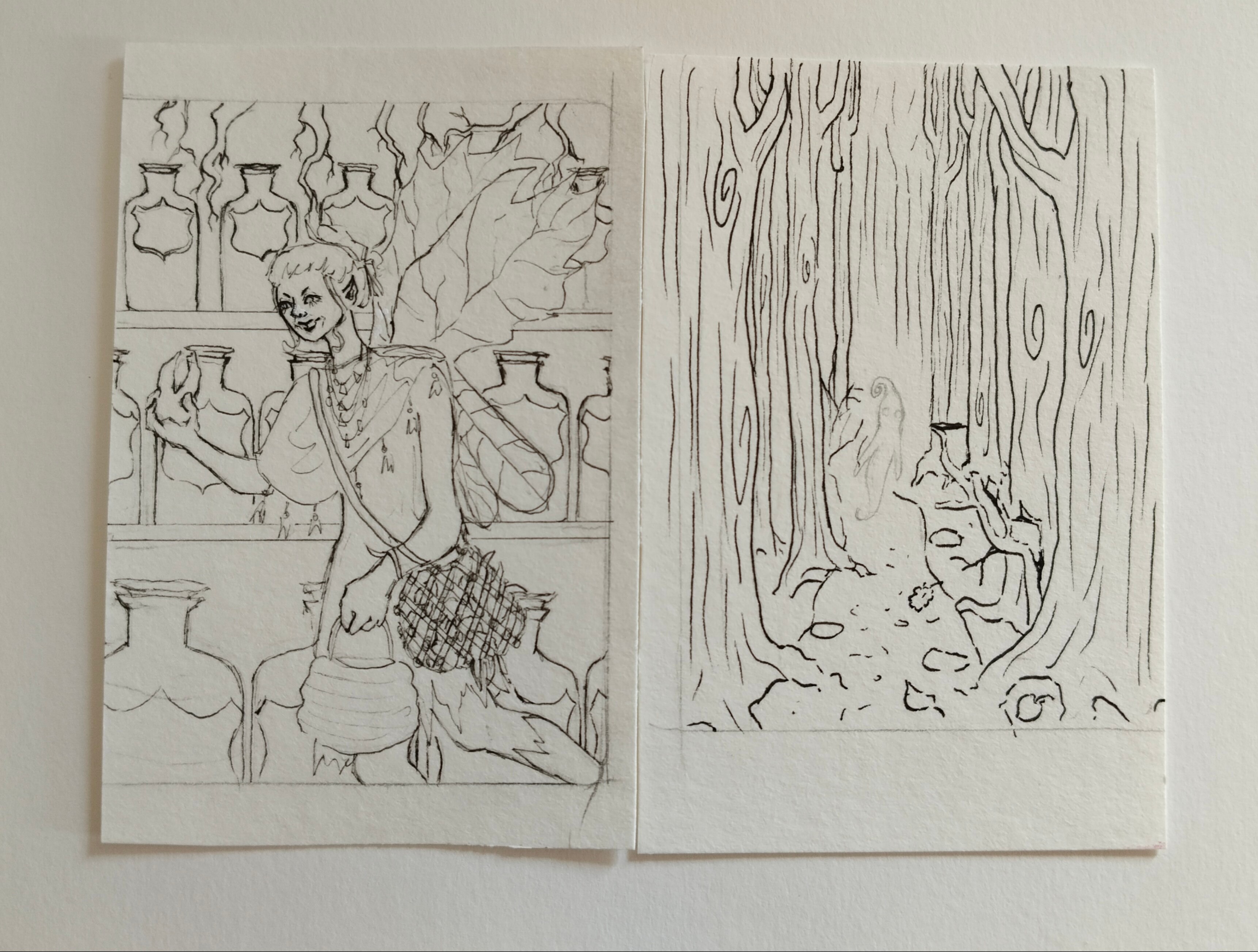 Die Skizzen für die Karten werden nochmal ordentlich auf Aquarellpapier abgepaust.