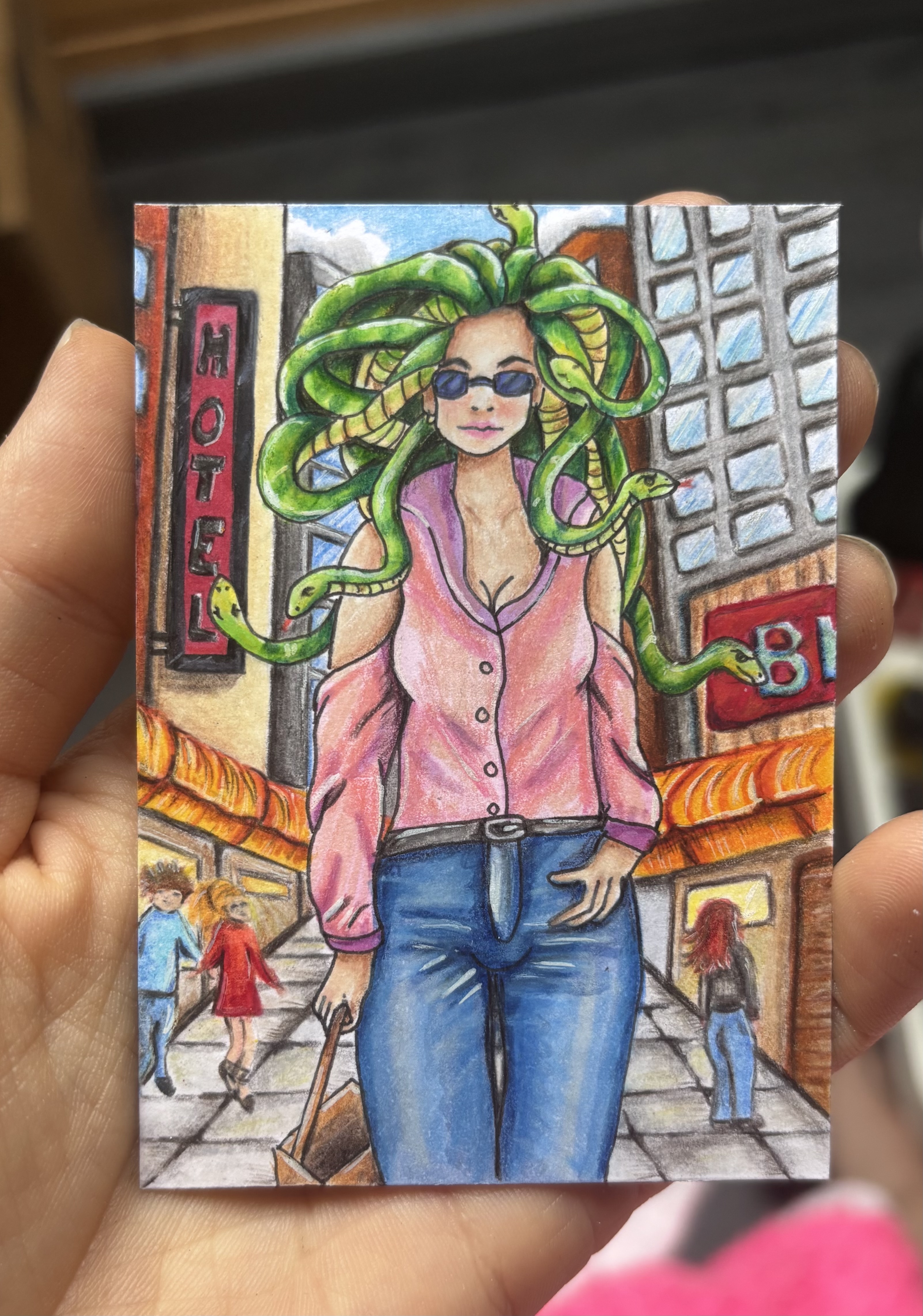 Meine erste Karte ist die Medusa beim shoppen. Um keinen zu versteinern braucht sie natürlich eine Sonnenbrille