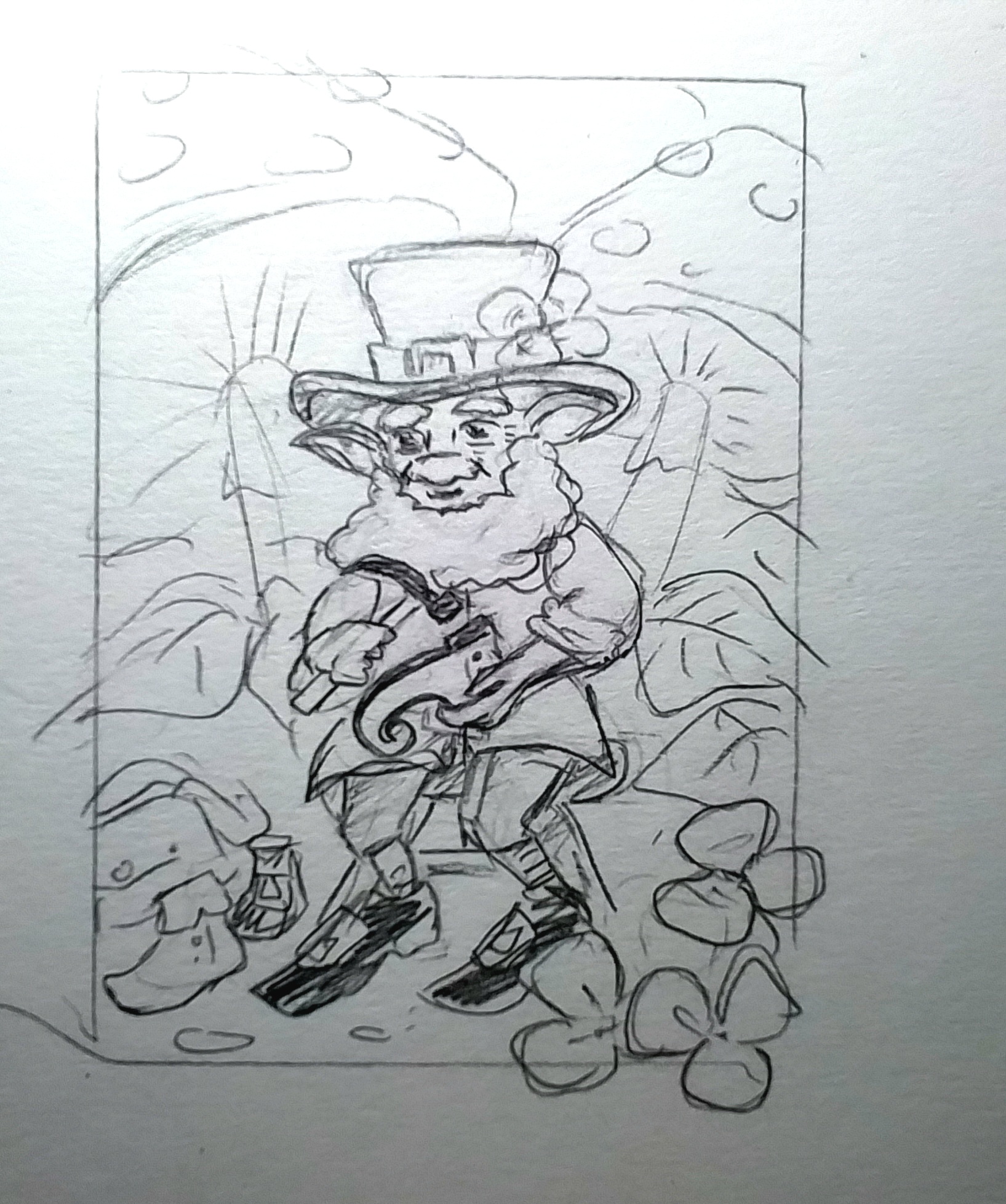 Update: Der Leprechaun ist ja auch Schuhmacher der Feen/Elfen, ich habe da ein tolles Referenzbild gefunden und eine andere Pose ausprobiert (grobe Skizze)