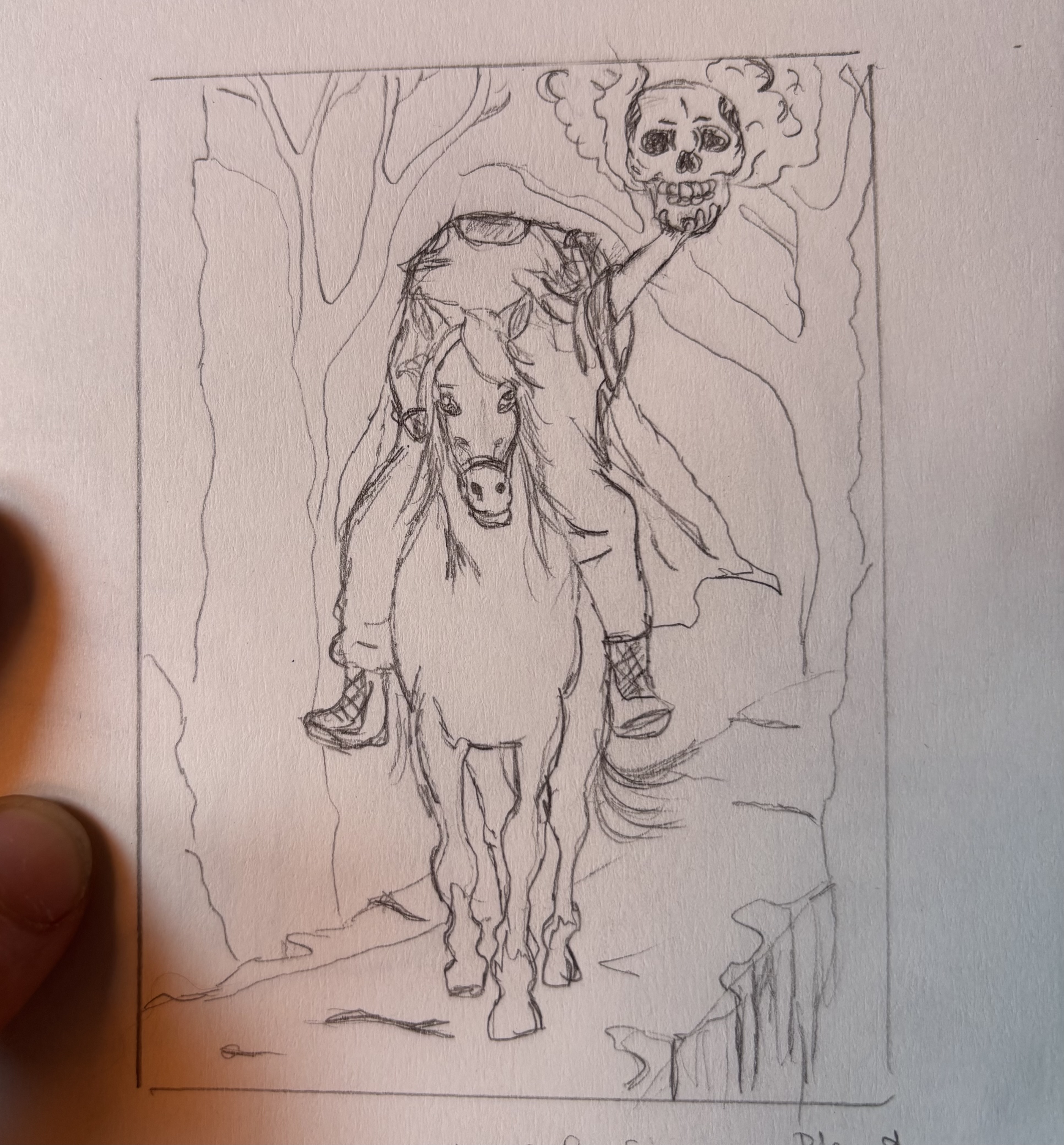 Die Skizze meiner zweiten Karte wird der kopflose Reiter. Ich hoffe ich bekomme ihn so hin wie ich will