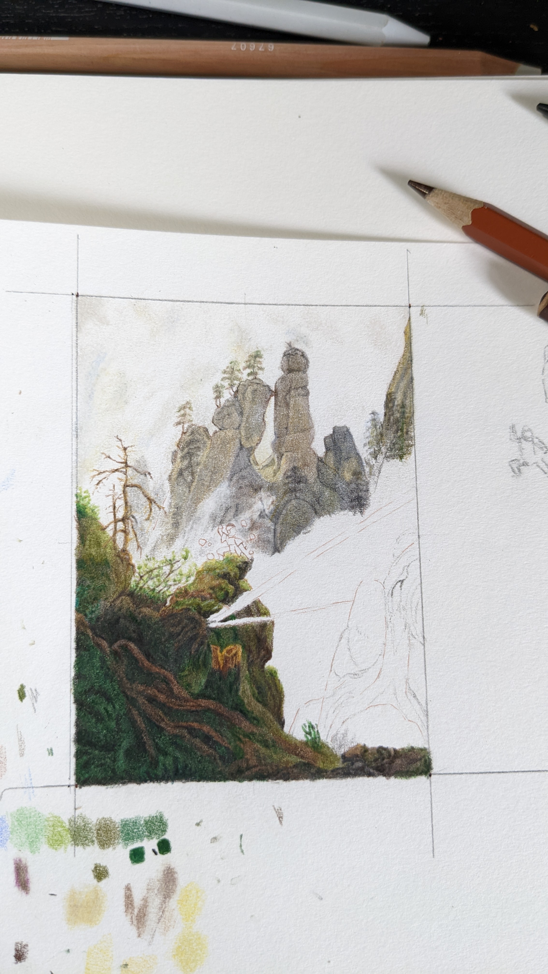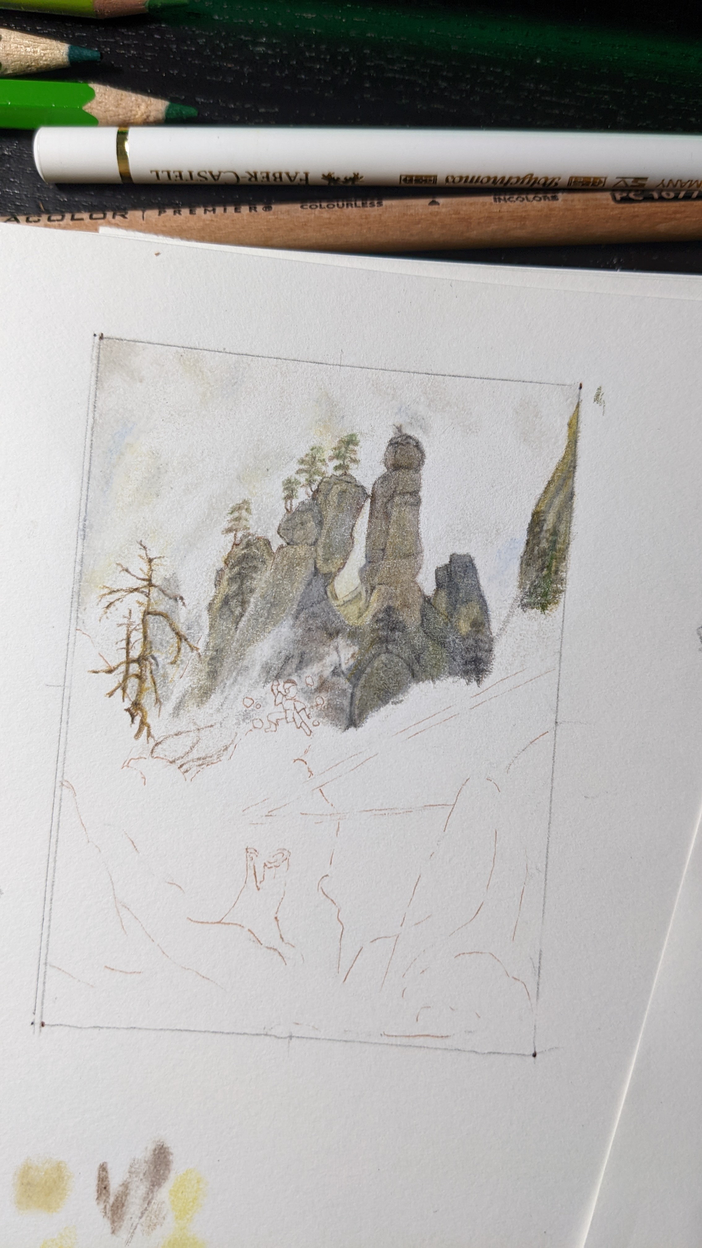 Hier einmal einen kleinen Zwischenstand meiner nächsten Karte. Ich hab mich nochmal umentschieden und werde neben Sophie (Milchausgießende Magd von Johannes Vermeer), nun von Caspar David Friedrich die Felsenlandschaft im Elbsandsteingebirge zusammen mit Toph aus Avatar zeichnen. Bei dem Gebirge musste ich irgendwie an einen Trainingsplatz der Erdbändigerin denken.