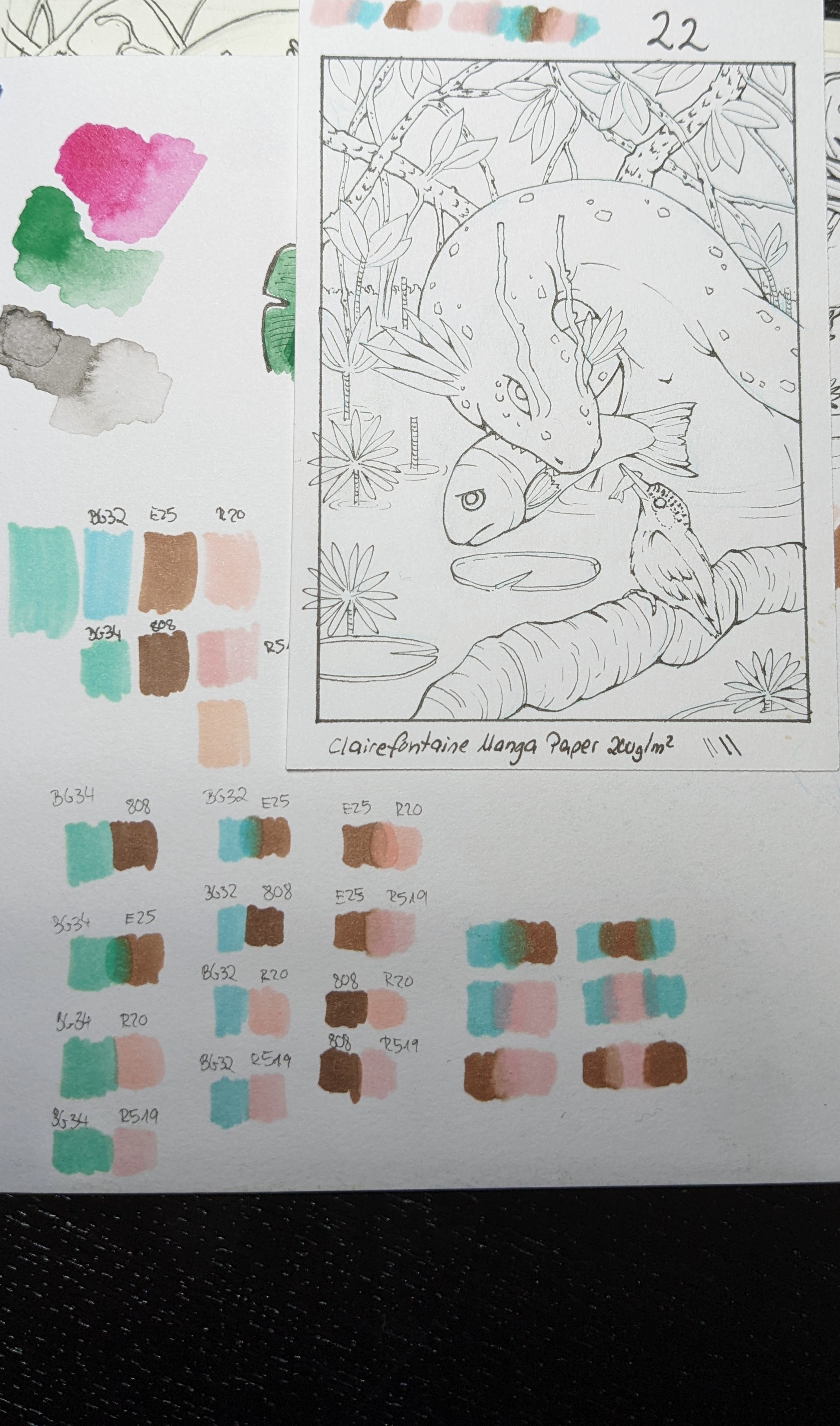Mit auf dem Bild sieht man auch noch meine ganzen Copic-Testfarben und Kombinationen, hab mich jetzt aber für drei entschieden und hoffe sehr, dass ich die Farben gut einsetzen kann