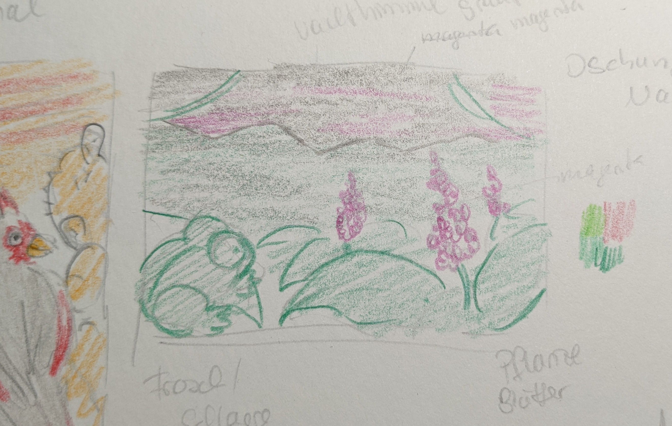 @absol : Ich liebe eure schnellen Farbskizzen, bitte mehr davon xD Der Frosch! Die Idee mit dem Drachen und dem Eisvogel ist auch toll - wie der Eisvogel stolz den winzigen Fisch zeigt <3 Bei dem Motiv könnte ich mir tatsächlich sowohl Hoch- als auch Querformat vorstellen. Spontan würde ich eher zu quer tendieren, weil ich den Ausschnitt bei der Skizze aktuell schon toll finde xD