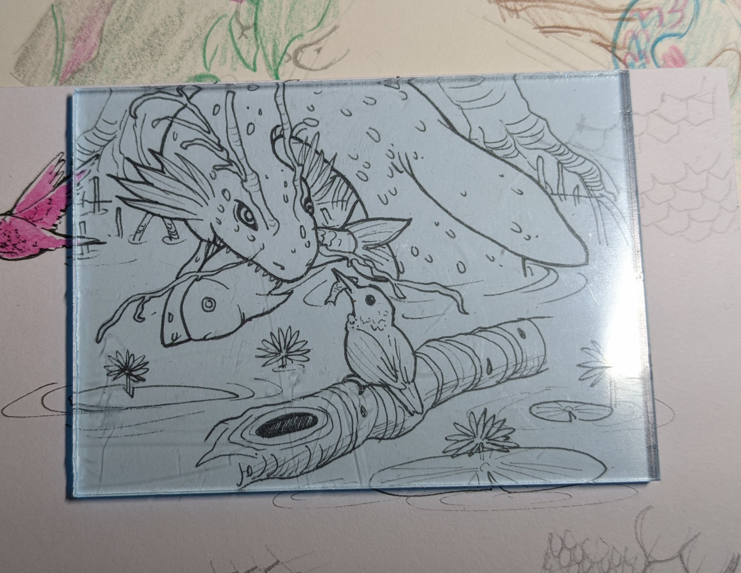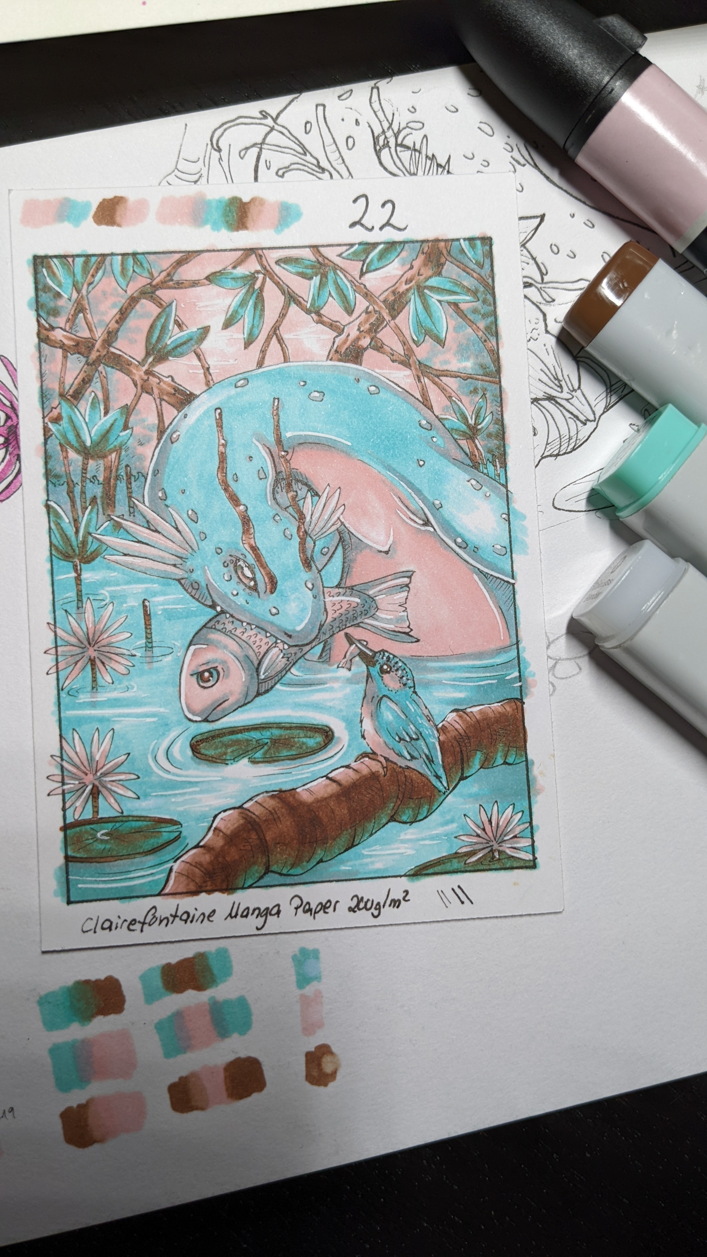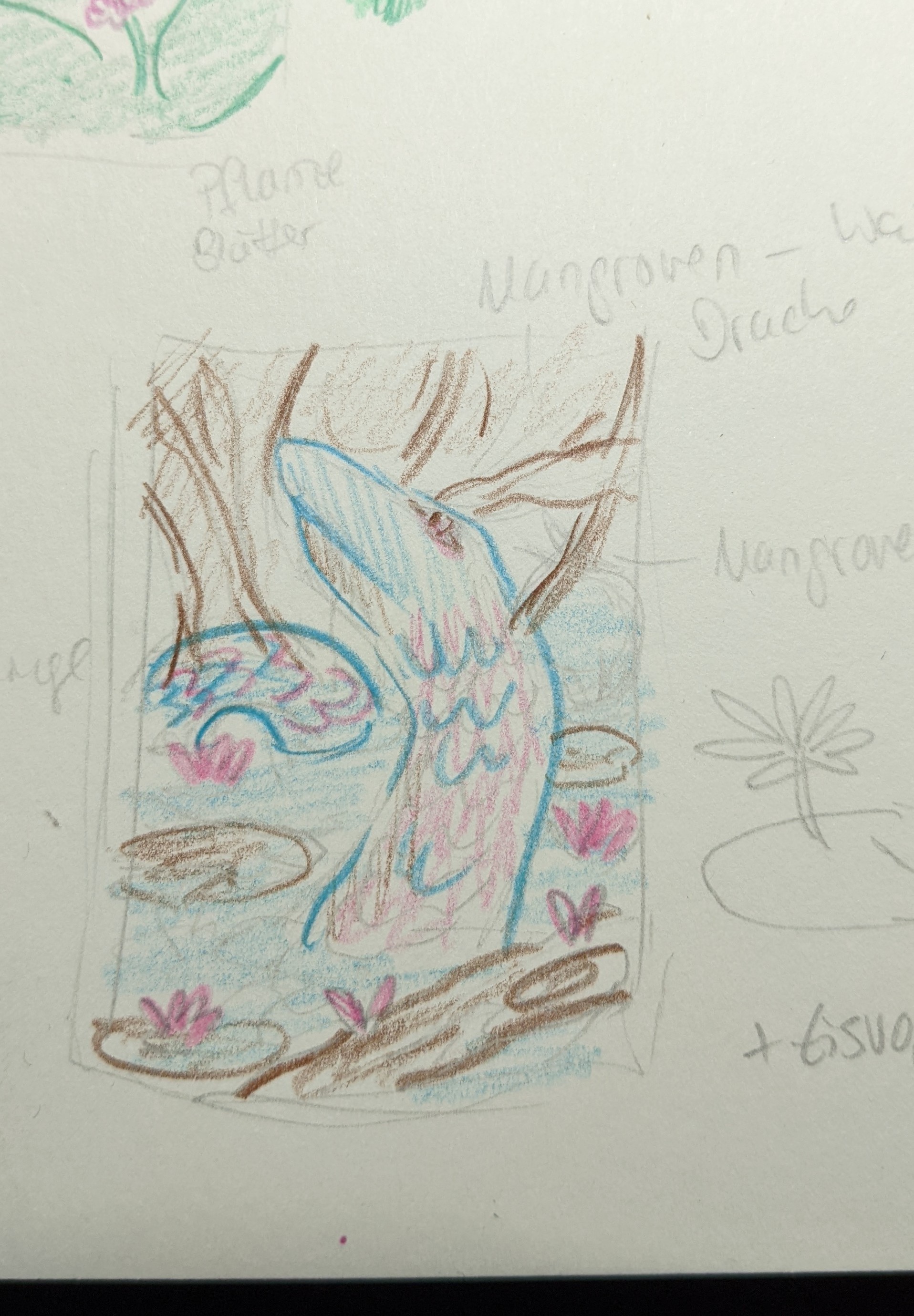 Beim letzten Farbtrio dachte ich schon an Seerosen, hier kombiniere ich das mit einem Wasserdrachen im Mangrovenwald. Evtl auch hier noch einen Eisvogel, einfach um das Vogelthema komplett auszureizen xD