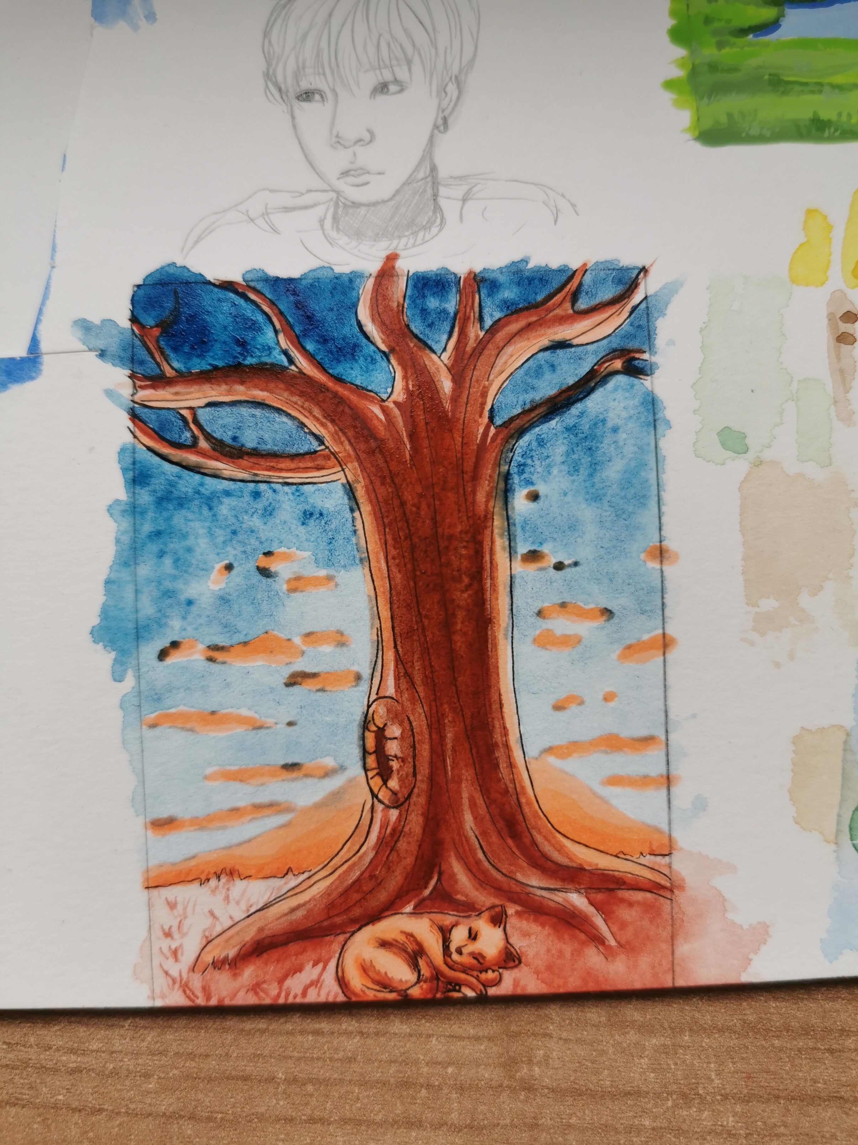 Die Farben waren Rotbraun, Hellorange und Dunkelblau. Die Schatten im Baum werden auf jeden Fall noch bearbeitet und ein paar Highlights müssen noch ausgearbeitet werden, aber generell würde das Motiv so stehen wenn das OK ist ^^