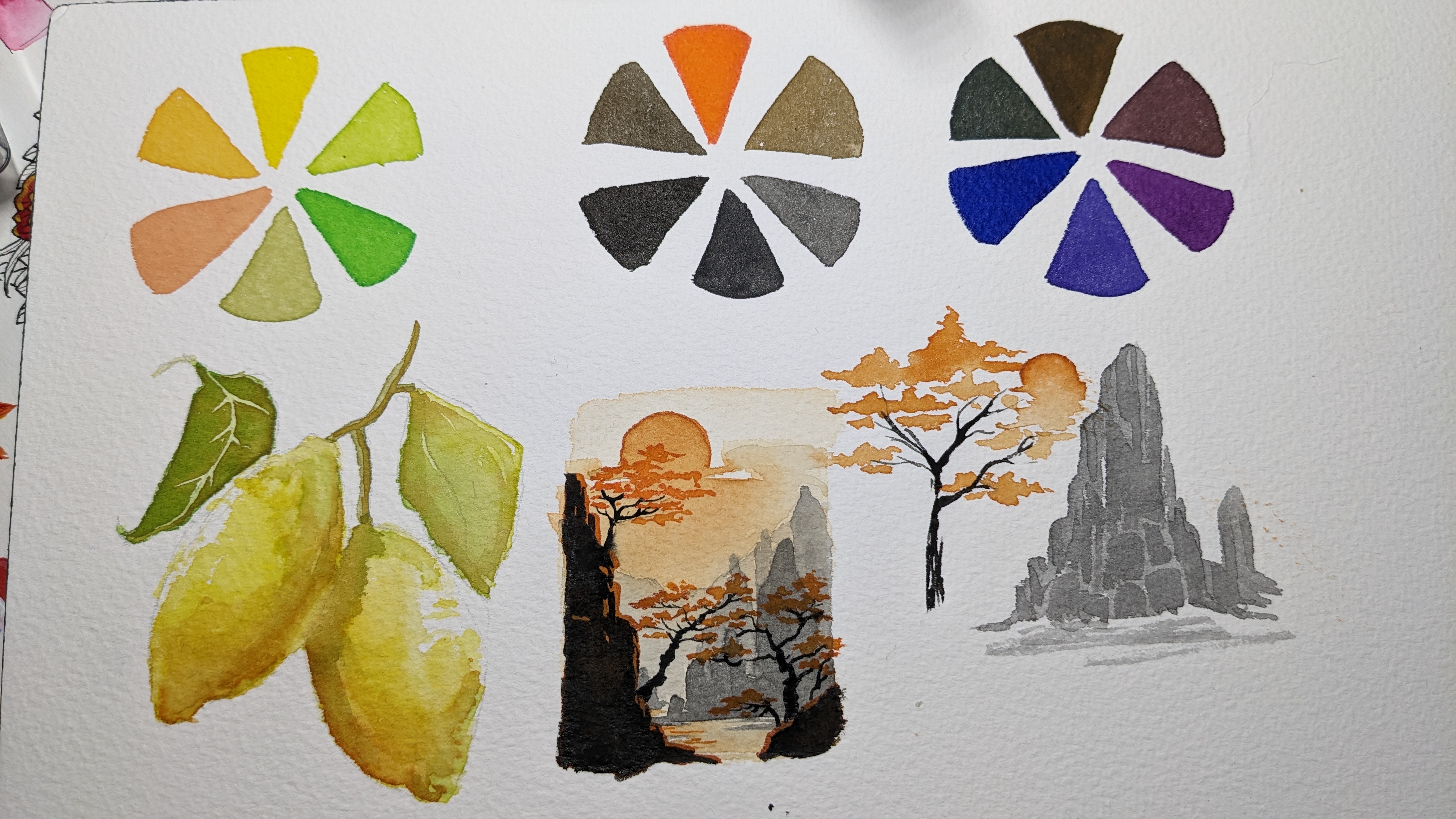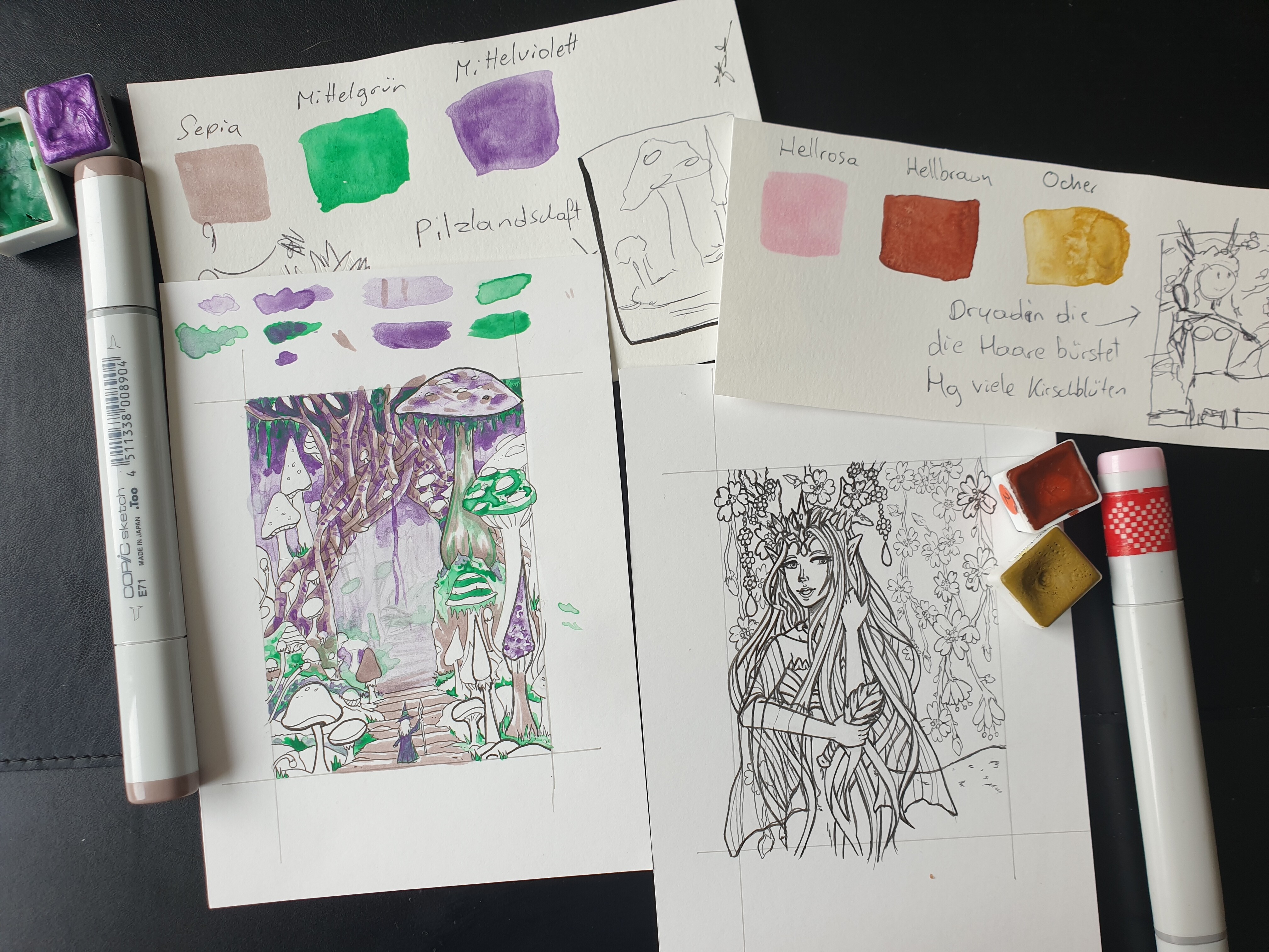 Ich finde es auch immer wieder total spannend zu sehen, wie verschieden ihr auf eure Motive kommt! Mein erster Instinkt bei solchen limitierten Paletten ist meistens, mir “Grundfarben” auszusuchen und dann die dritte Farbe für Akzente zu verwenden. Bei Hiltias Problemkombi zum Beispiel: Wenn ich das richtig verstanden habe, wäre das die mit dem Türkis/Grün/Violett. Da würde ich das Türkis und Grün als Basis-Farben verwenden (eins davon für Schatten/dunklere Bereiche, eins für die helleren Bereiche, je nachdem, welche Farbe da besser funktioniert) und das Hellviolett für wichtige Details oder starkes Licht oder so. Und von da würde ich dann ausgehen und überlegen, was mir zu der Atmosphäre einfällt xD