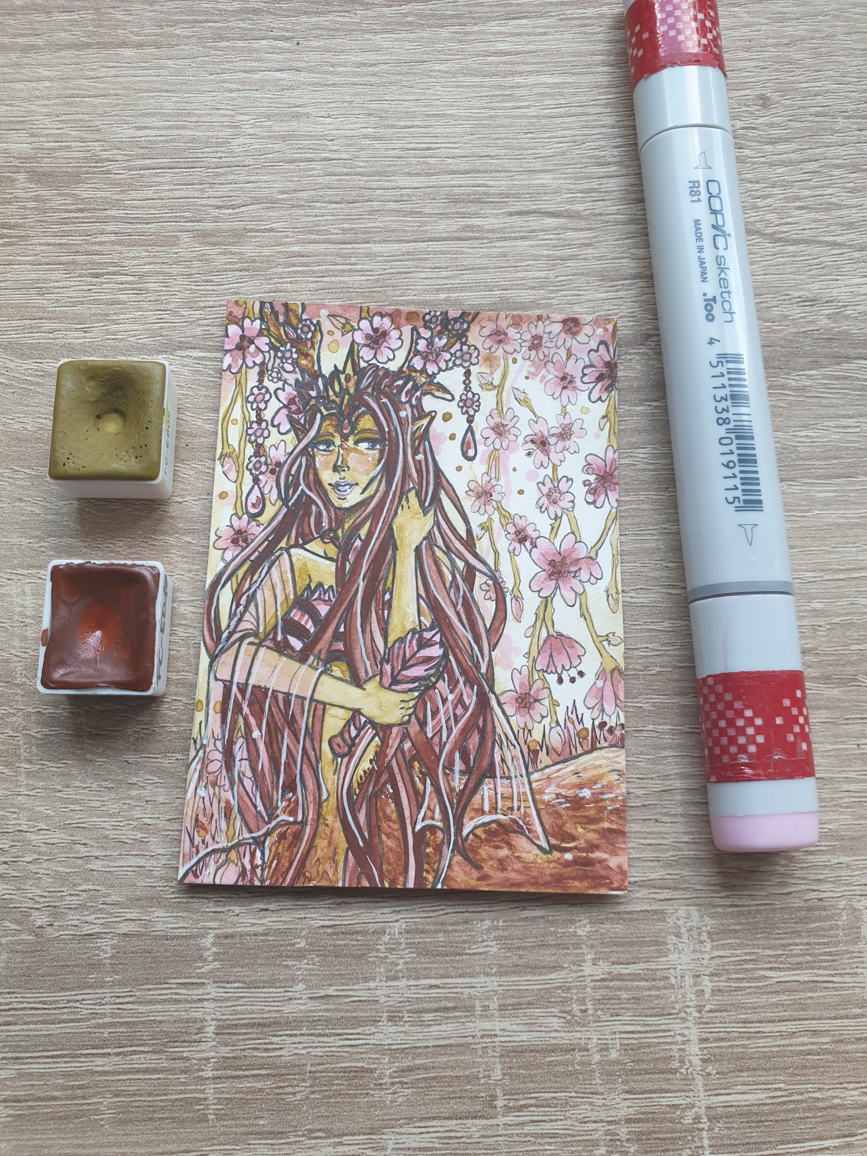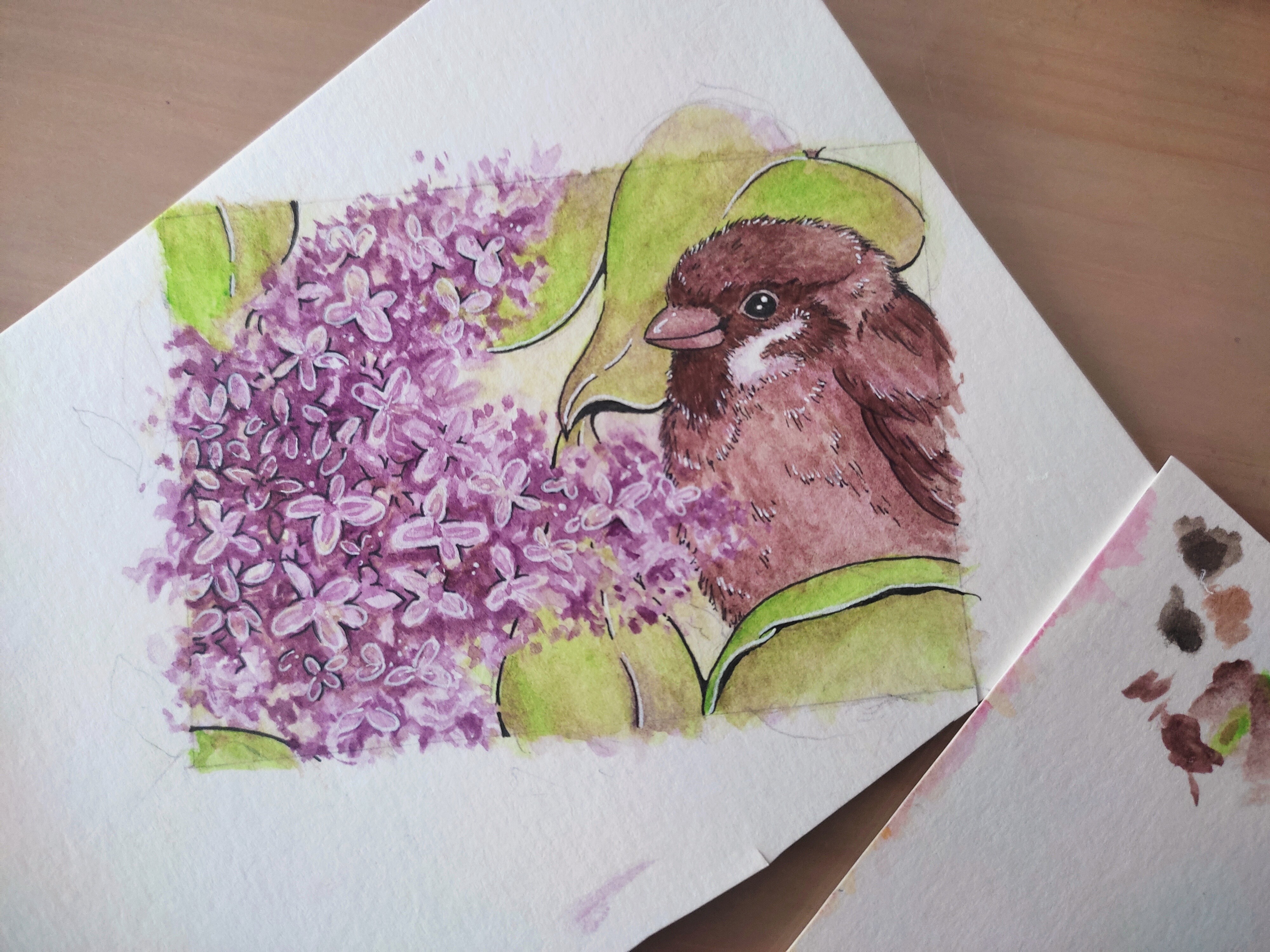 Dann war die Kombi mit dem Grasgrün für mich echt unangenehm anzusehen, sodass ich versucht hab es mit dem Fliederlila gedeckter zu halten, was mir nur bedingt gelungen ist. Schokoladenbraun hatte ich nur in Acryl, sodass ich zum ersten Mal in einem Bild Aquarell und Acryl gemixt hab~ Also eine Herausforderung nach der anderen, aber ich bin doch ganz froh jetzt mit dem Ergebnis und hoffe die Karte findet ein schönes neues Zuhause ^^
