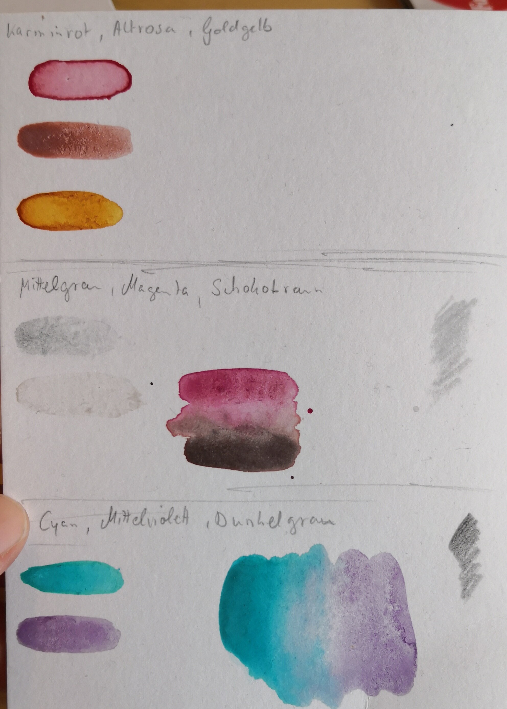 Beim Mittelgrau musste ich ein bisschen probieren, welches ich nehme. Da habe ich das Przybysz’s Grey von Roman Szmal (links oben) oder Kaltgrau II (Polychromos) zur Auswahl. Das Pryzbysz granuliert und hat einen leicht violetten Unterton.