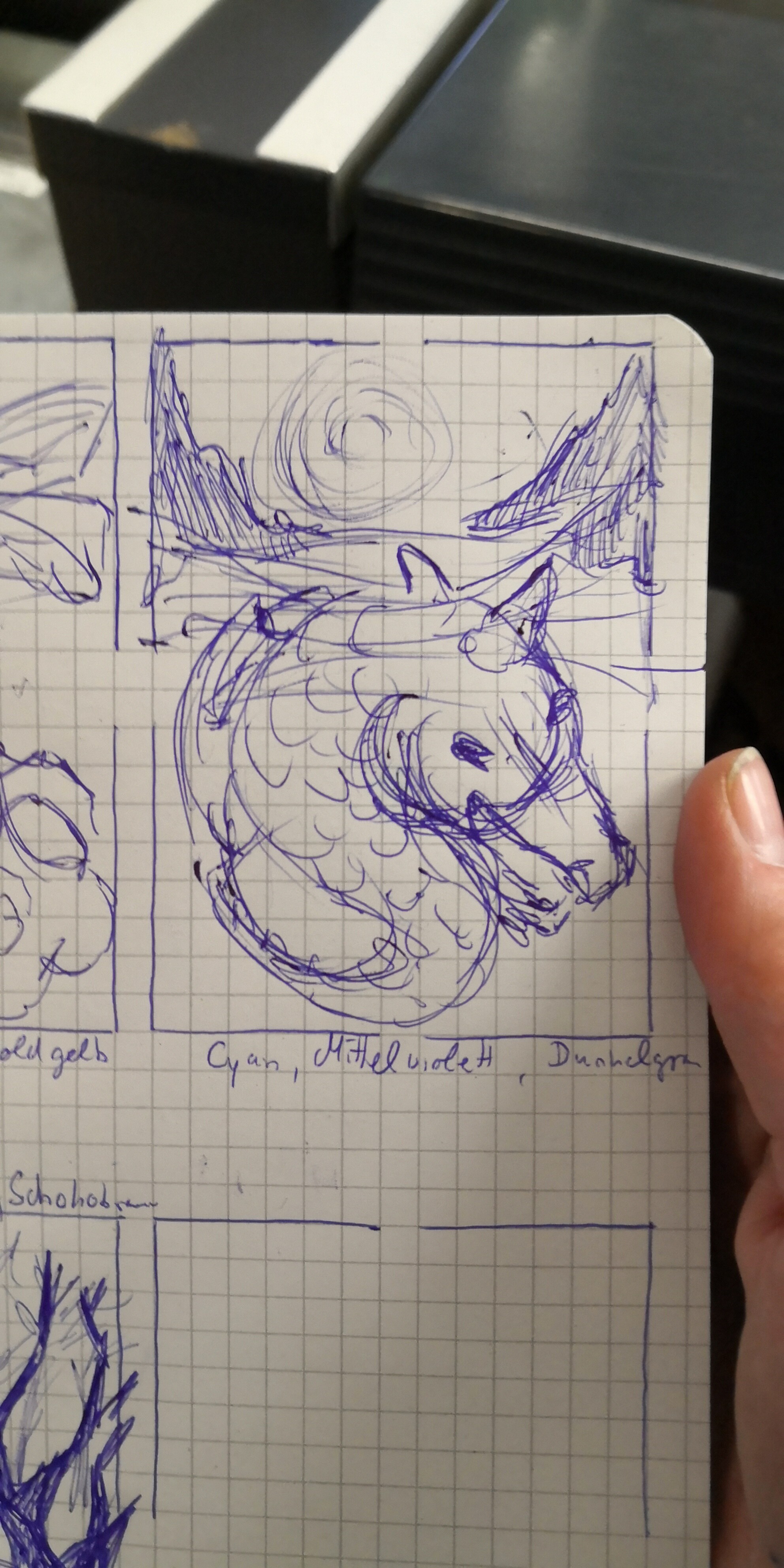 Ich bastel gerade an meinen Karten. Hab gerade die groben Skizzen übertragen, fange gleich an zu linen und versuche mich dann an den Farben.