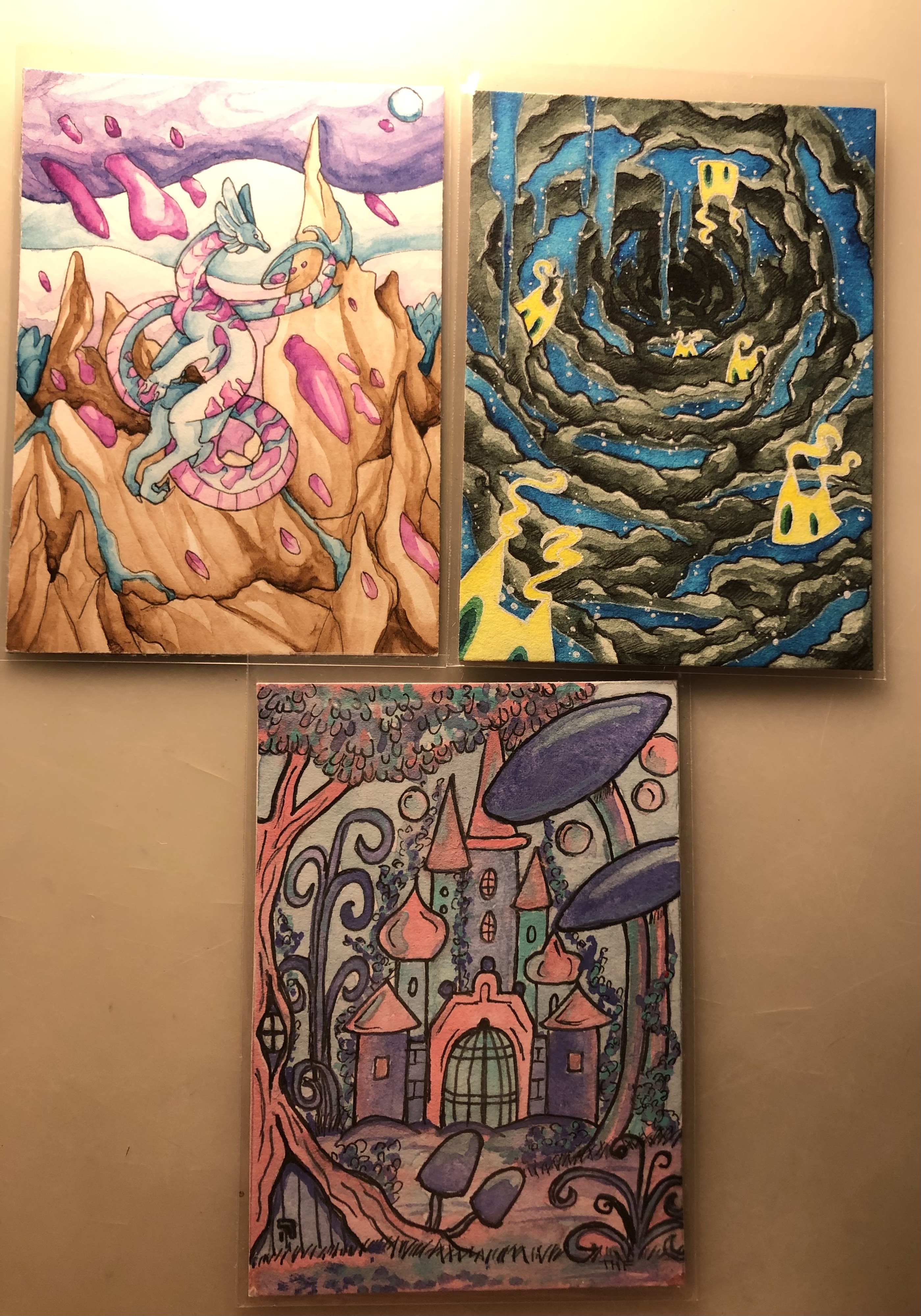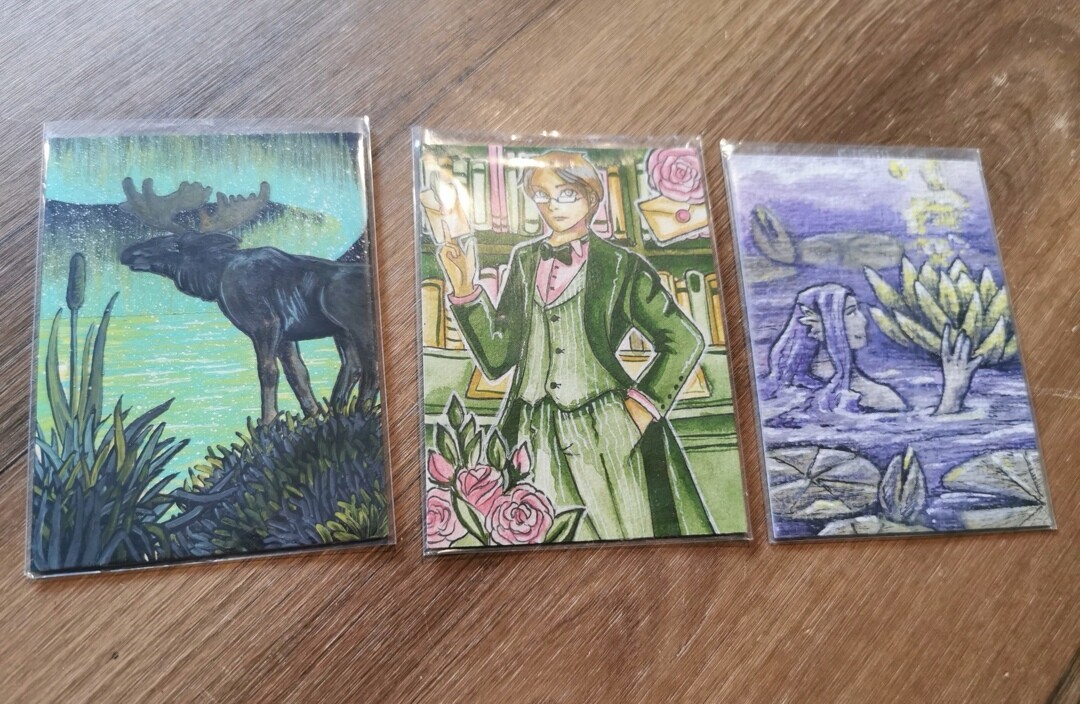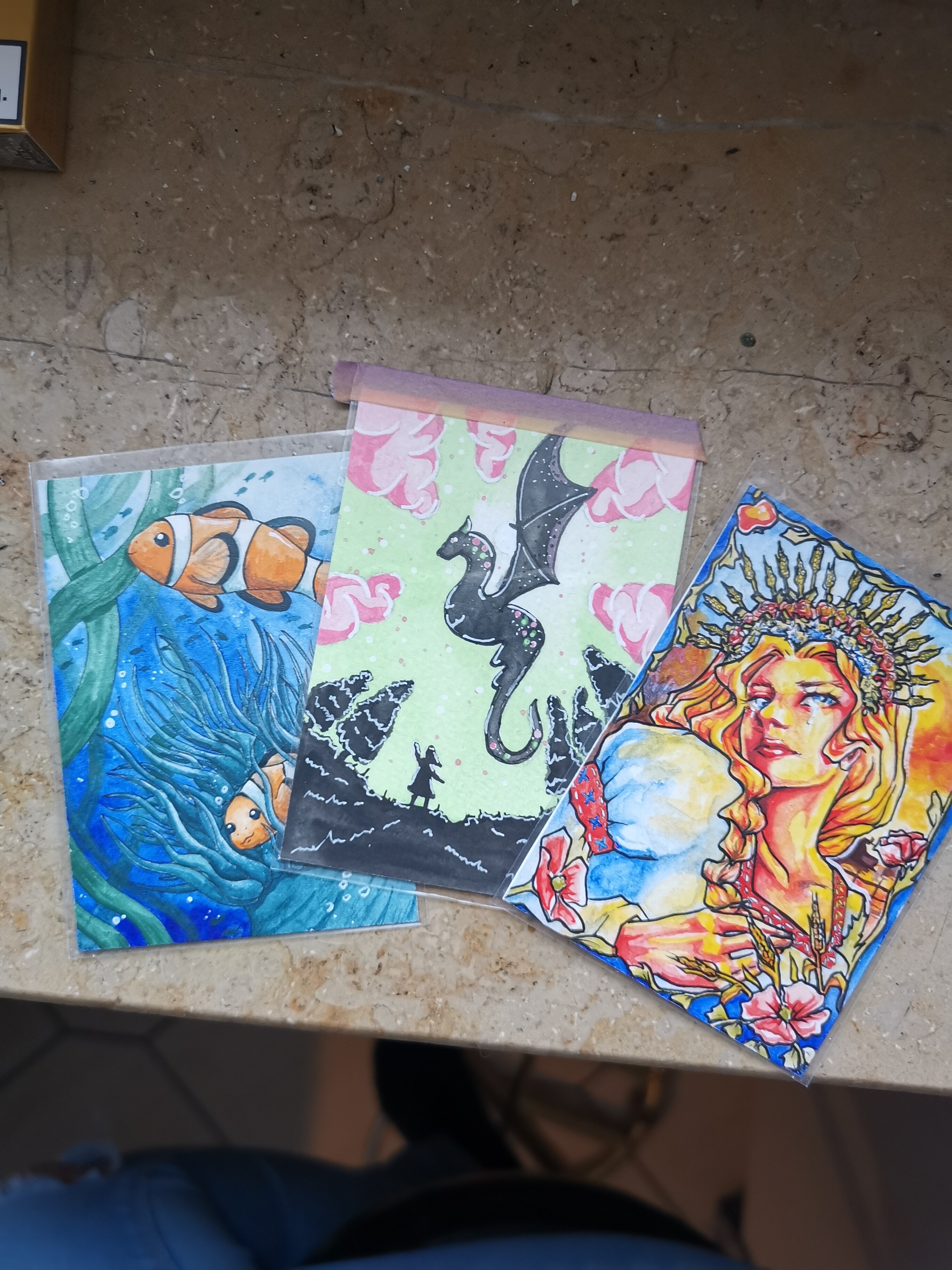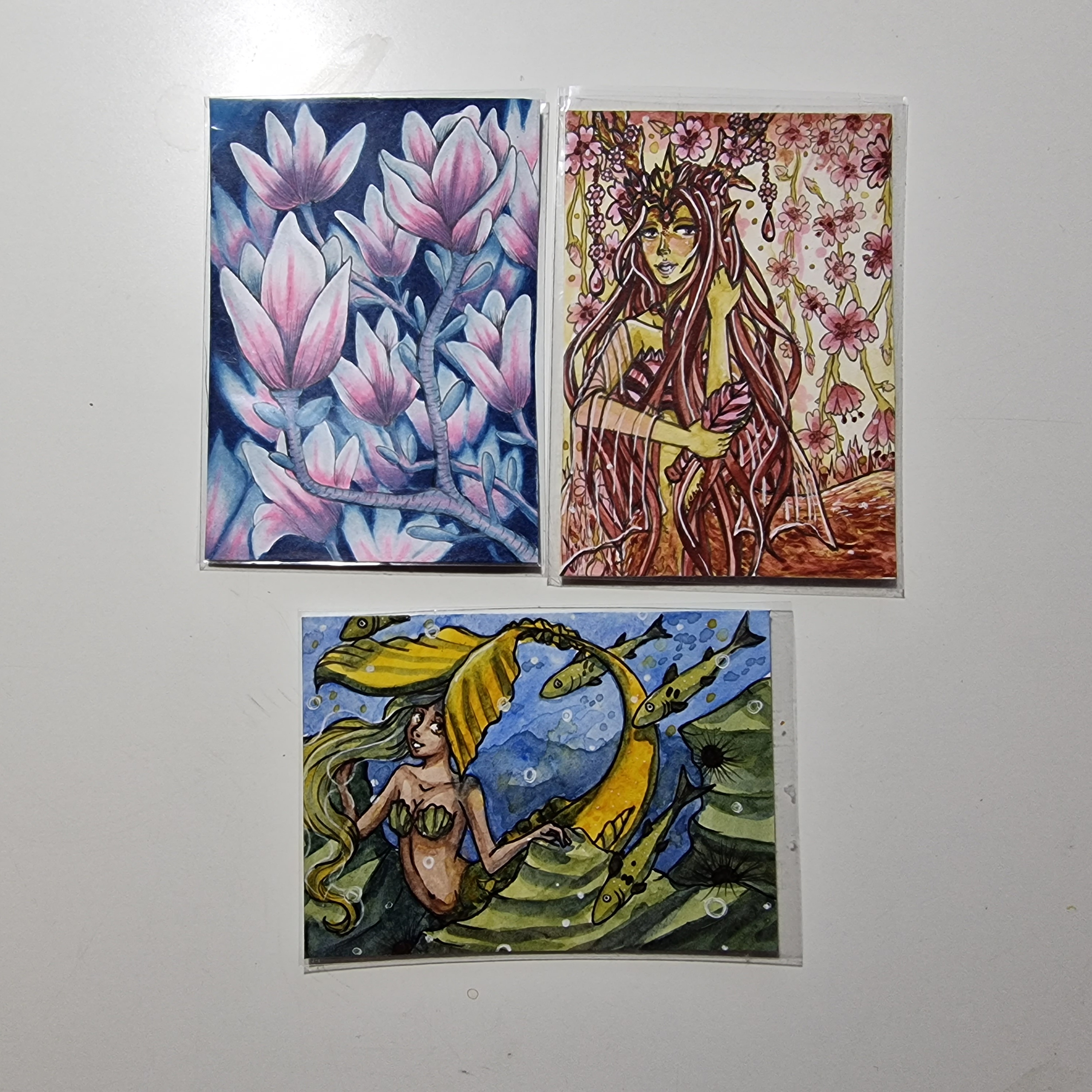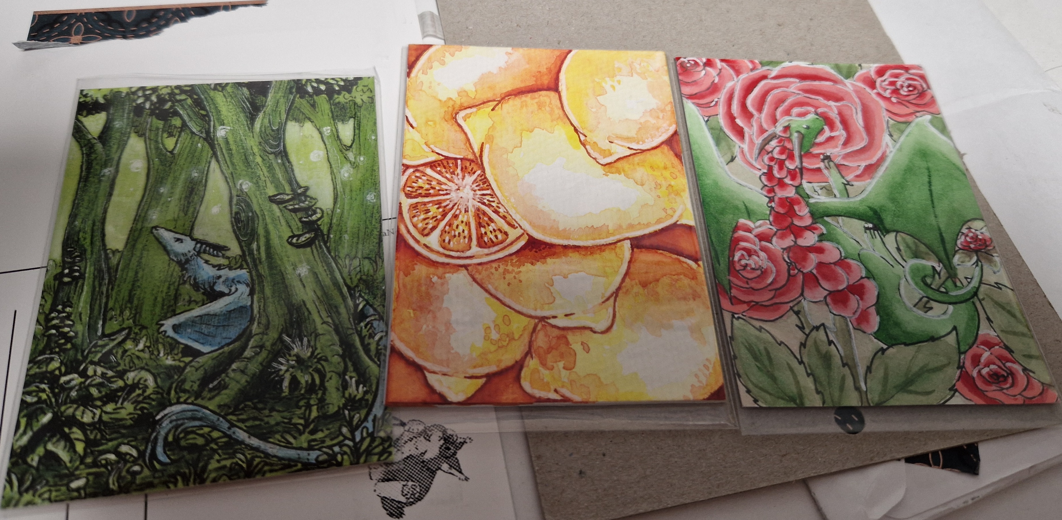 Auch mein Brief kam an und mich haben drei wunderschöne Karten erreicht. Sie passen echt toll zusammen (Farblich und Thematisch) und ich bin total begeistert, weil es zwei Nixen und ein Drache (bzw. Seeschlange, aber ich sortiere ihn zu den Drachen) sind.