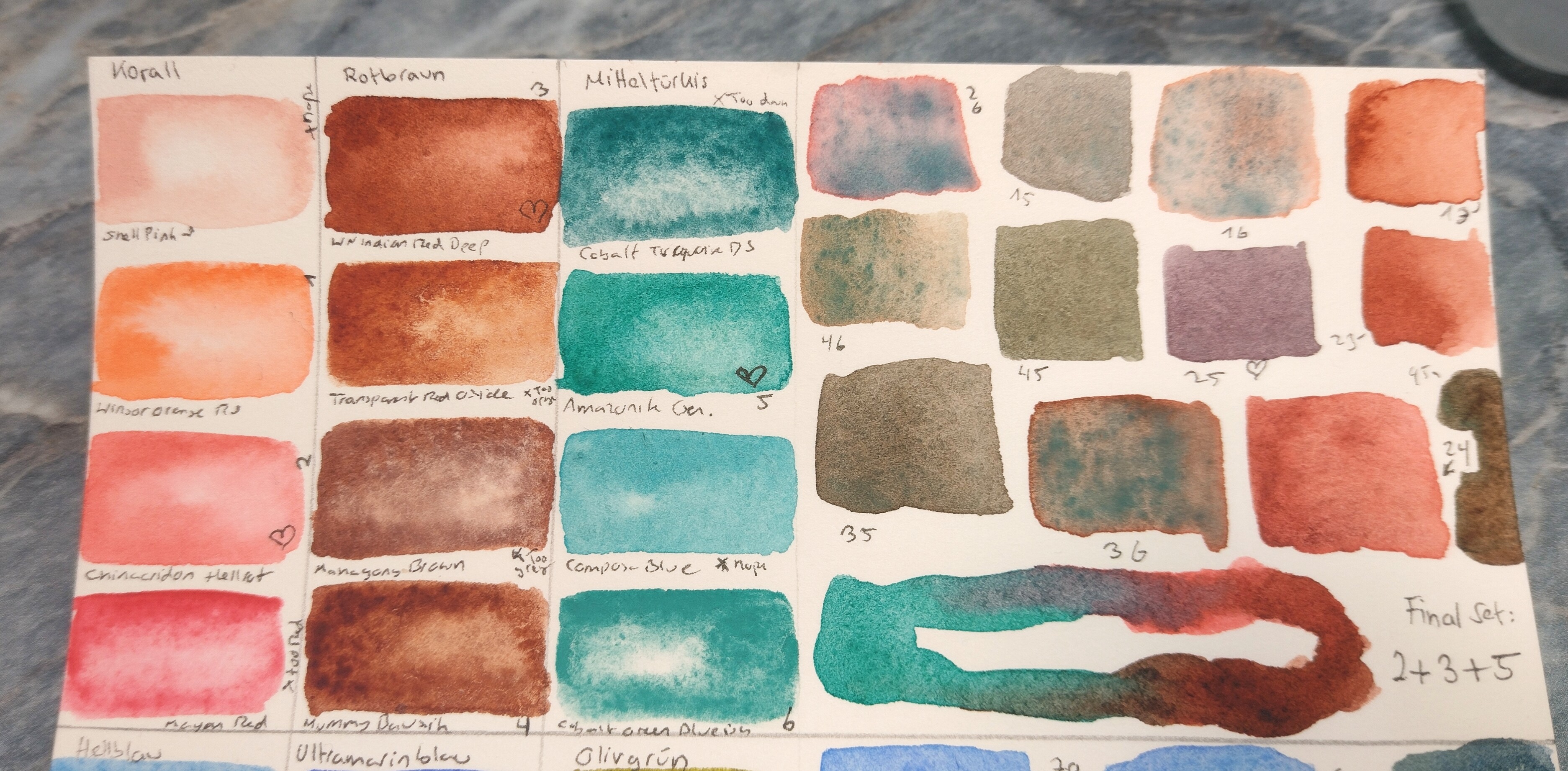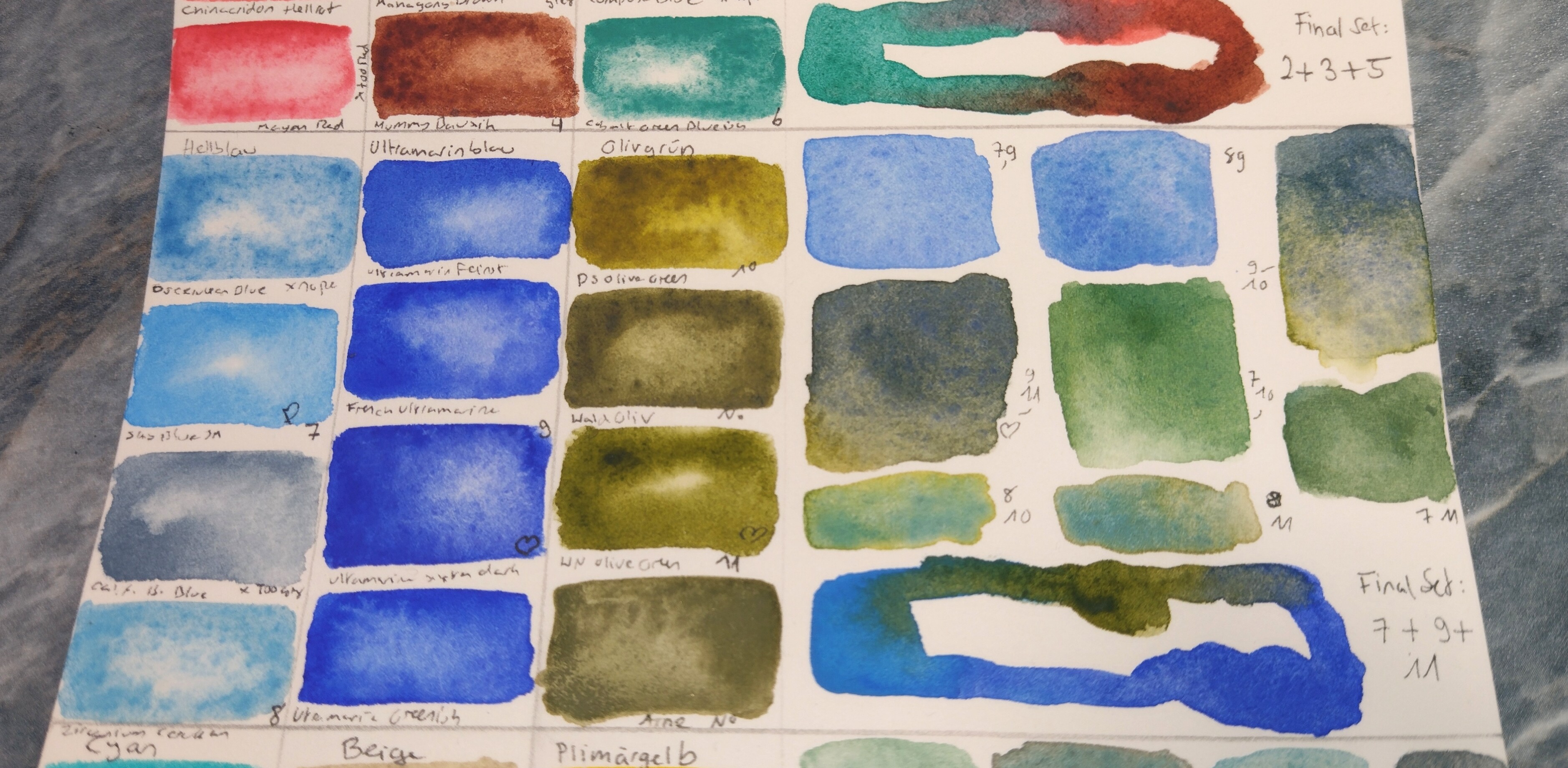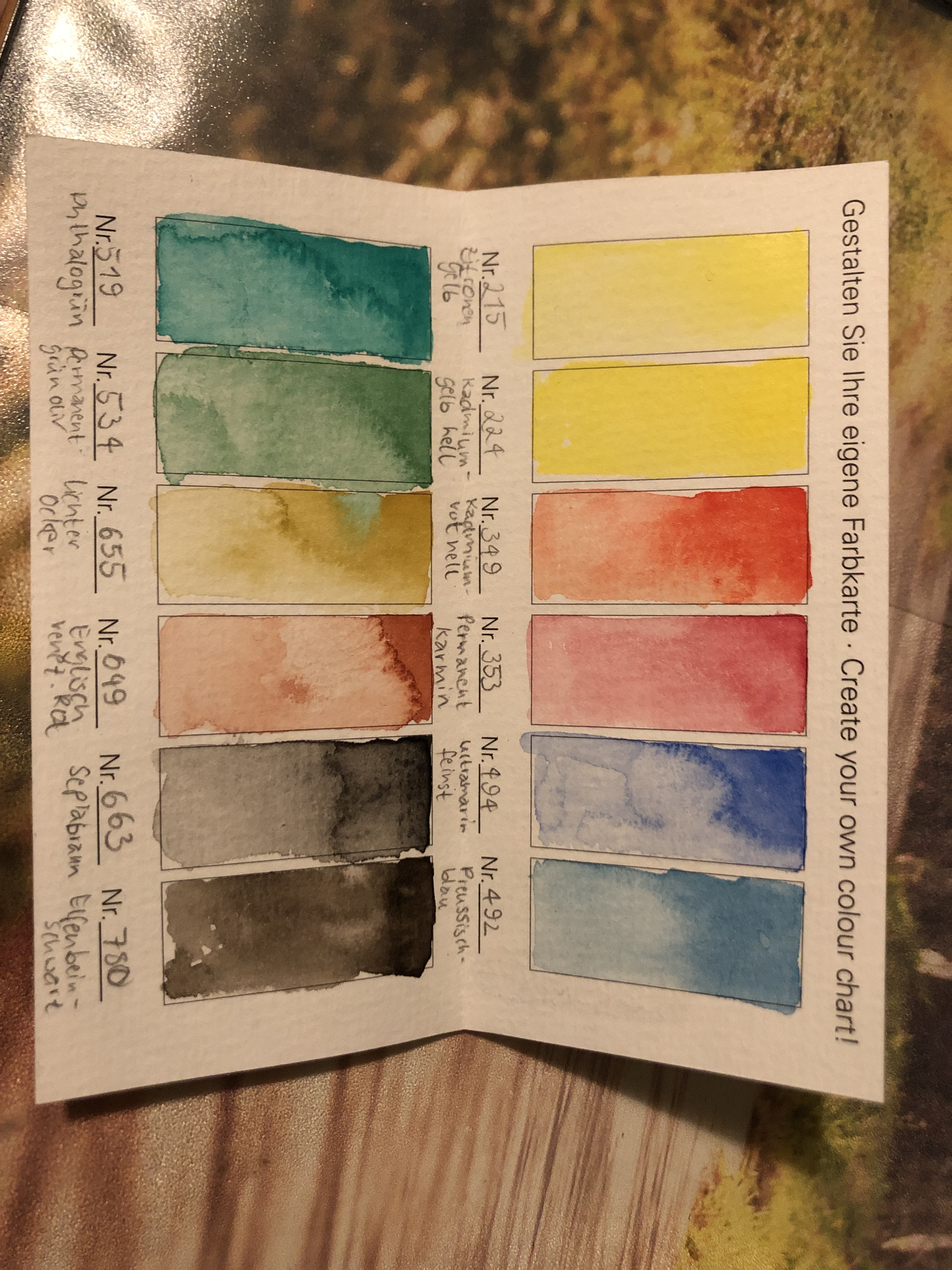 Ich hab wohl in der Beschreibung übersehen, dass man die Farbtöne nicht anmischen darf. Ich habe bei Aquarell nur die kleinen Basisnäpfchen von Schminke weil ich mir gesagt hab dass ich lieber gute Farben habe und dann mische. Bei Gouache hab ich tatsächlich nur die Primärfarben und Schwarz und Weiß weil ich alles selber mische.