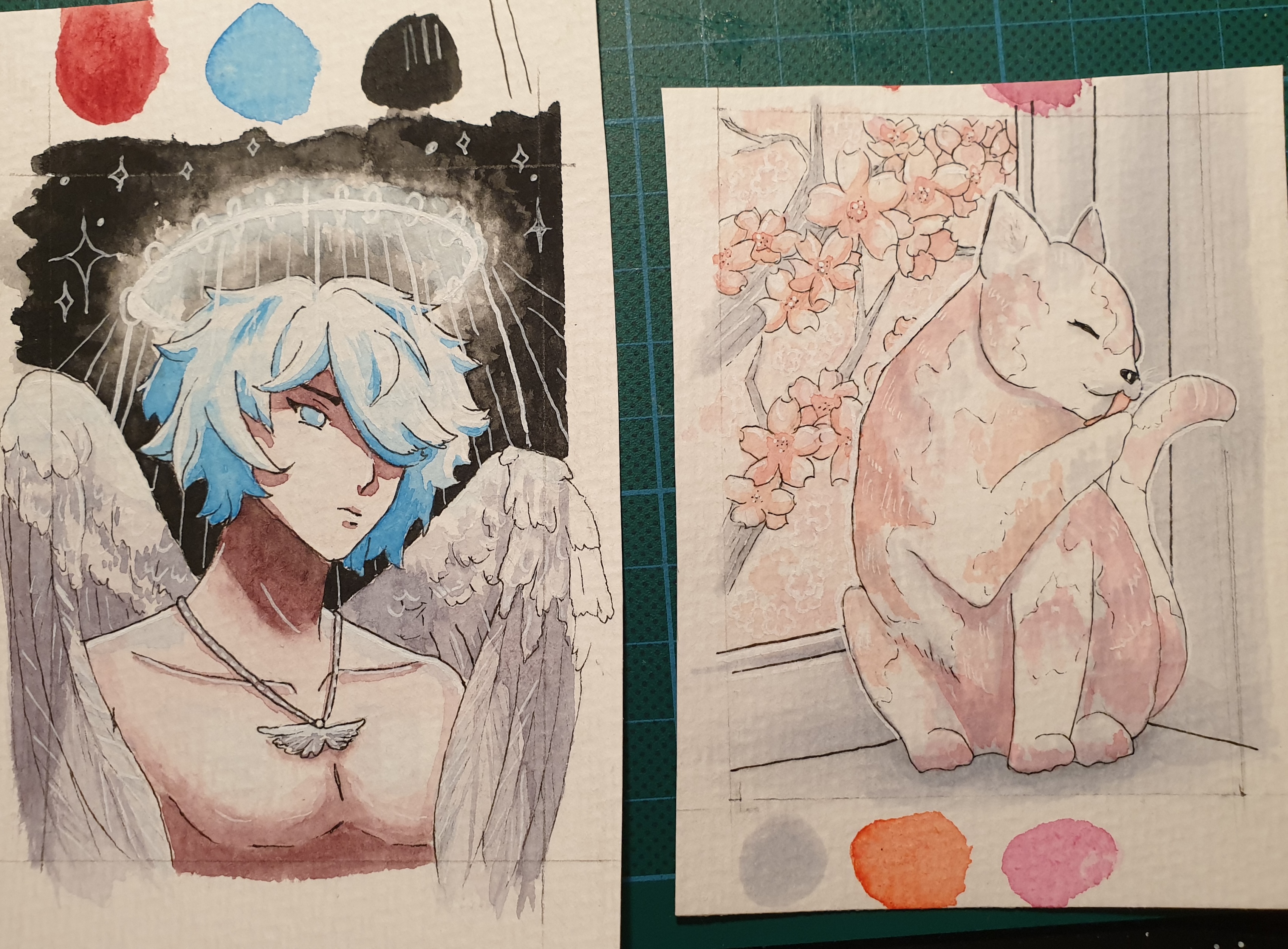 @Kawiji : Die Karte ist super niedlich! Die Idee rechts ist cool mit dem starken Schatten, aber so in der Ausarbeitung noch etwas wenig für das Motiv. Die Flügel sind toll, aber könntest du bei den Haaren und besonders beim Gesicht vielleicht noch einmal drüber gehen? Gerade das Gesicht wirkt im Vergleich zu den anderen Bereichen noch sehr flach, da es nur die Schlagschatten unter den Haaren und sonst nichts hat. Bei so starkem Licht müsste da noch mehr Schatten für die Rundungen im Gesicht oder auch an der Nase/Lippe/Kinn sein. Bei den Haaren würden glaub ich auch ein paar feinere Strähnen mit dem Blau noch gut aussehen :3
