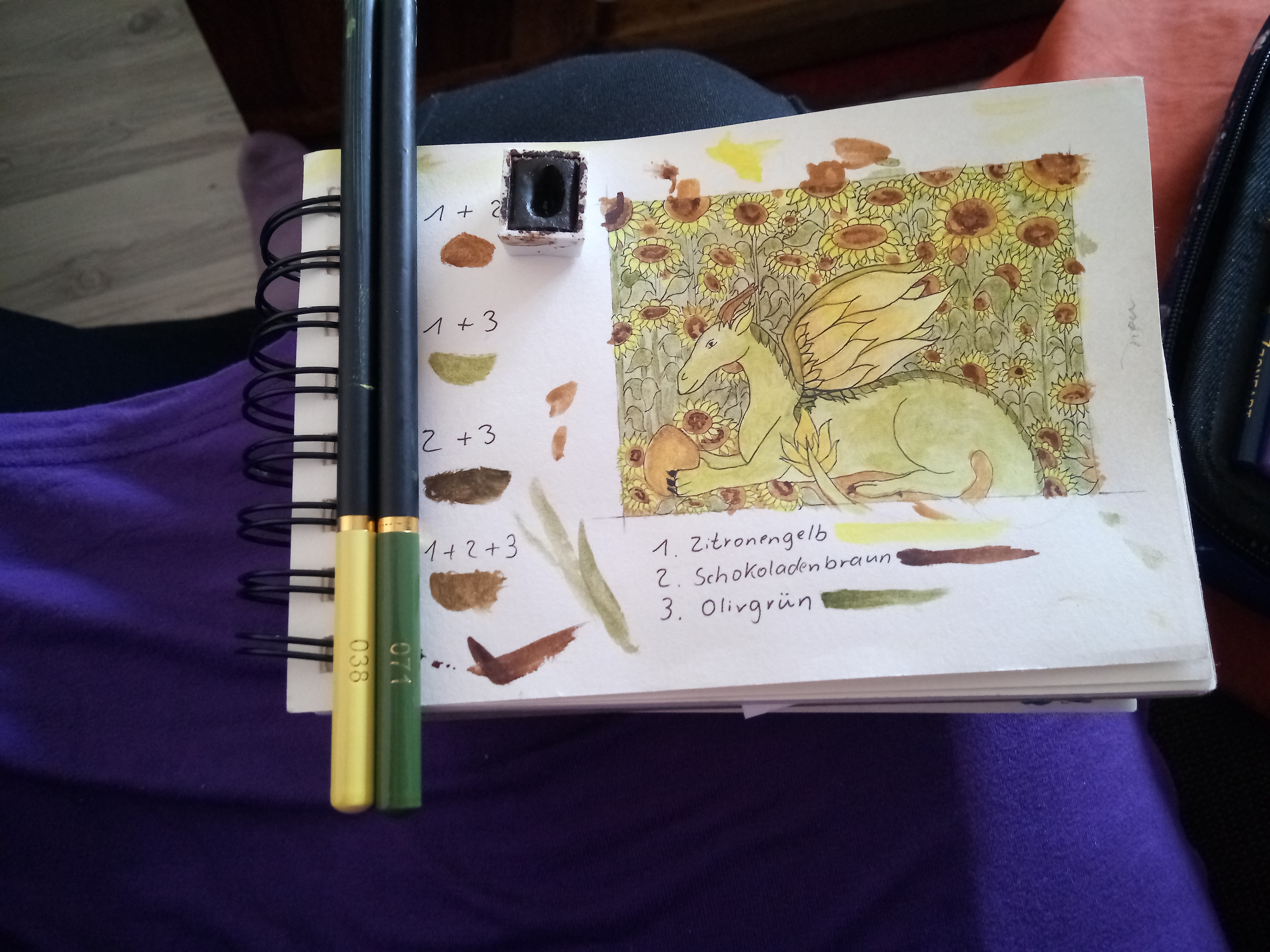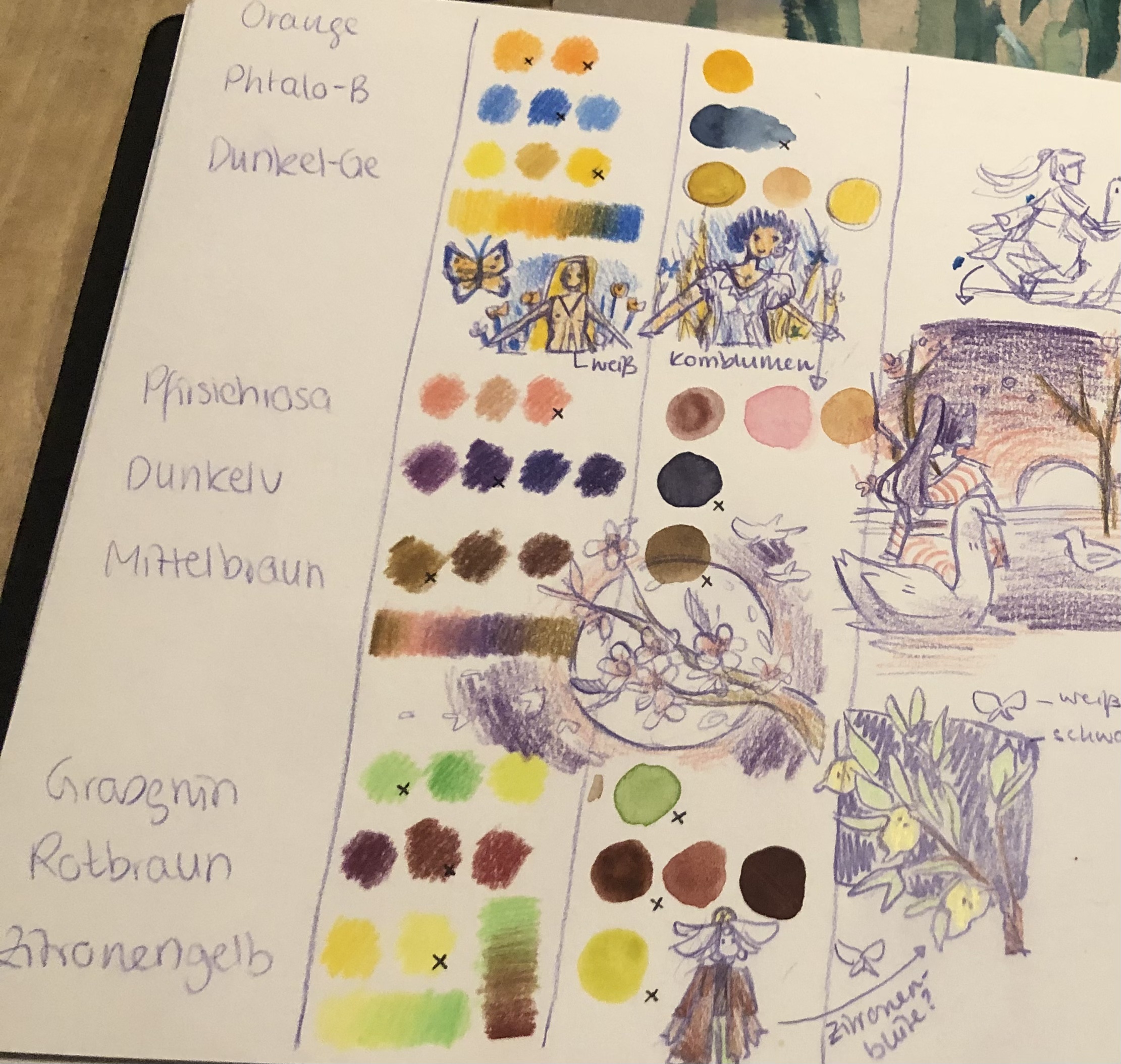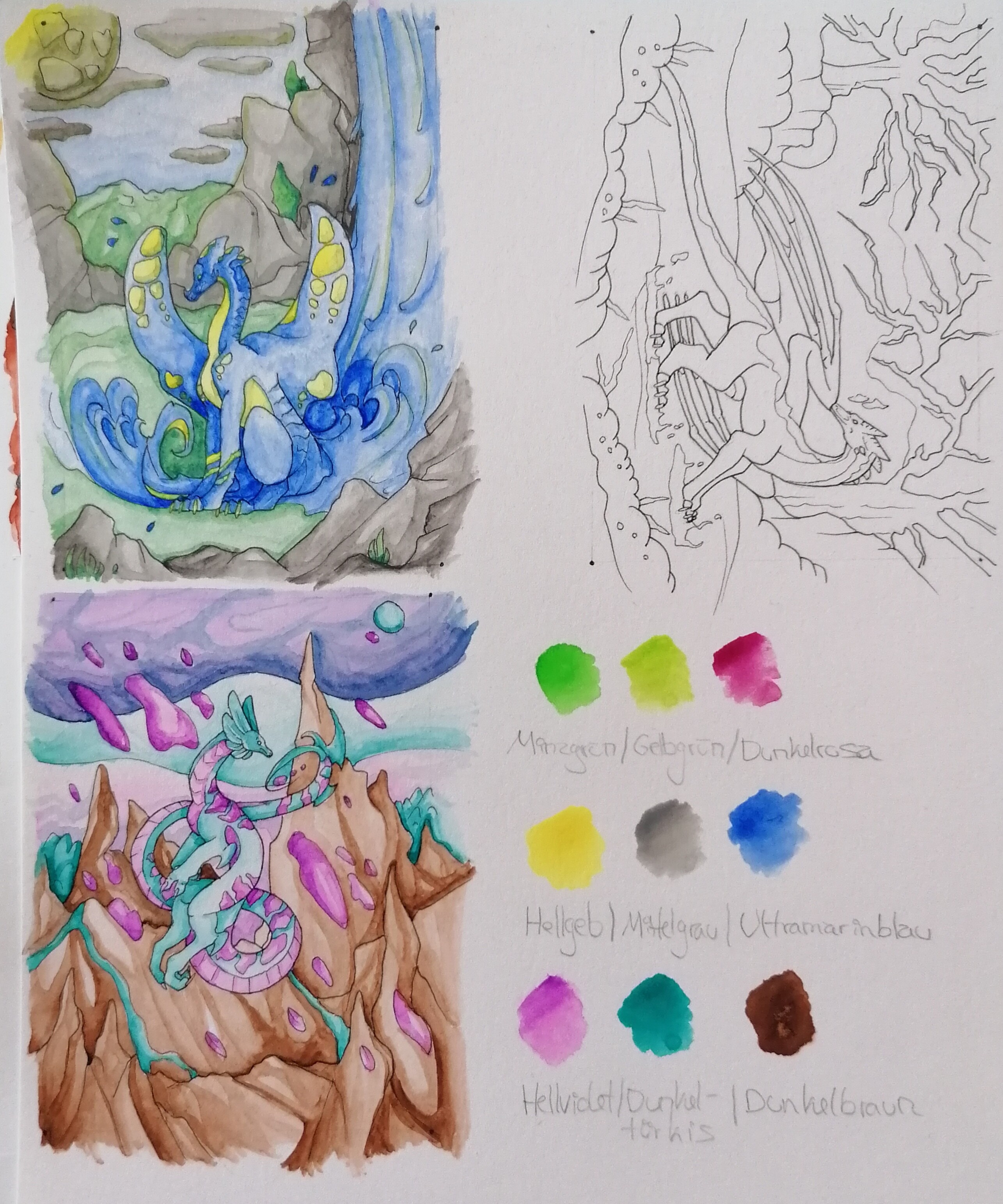 Ich überlege noch bei mir und hab jetzt erstmal ne grobe Motiv und Farbskizze gemacht. Für die finalen Farben wähle ich dann die passenden Wasserfarben aus, da müsste ich alles haben.