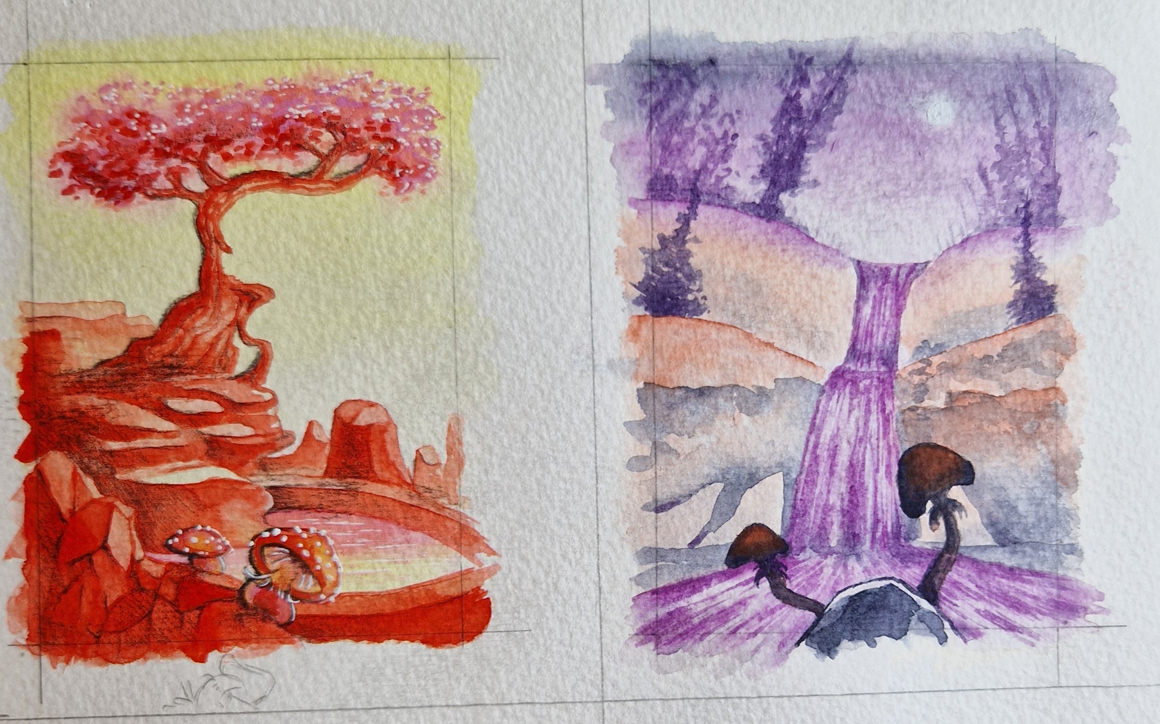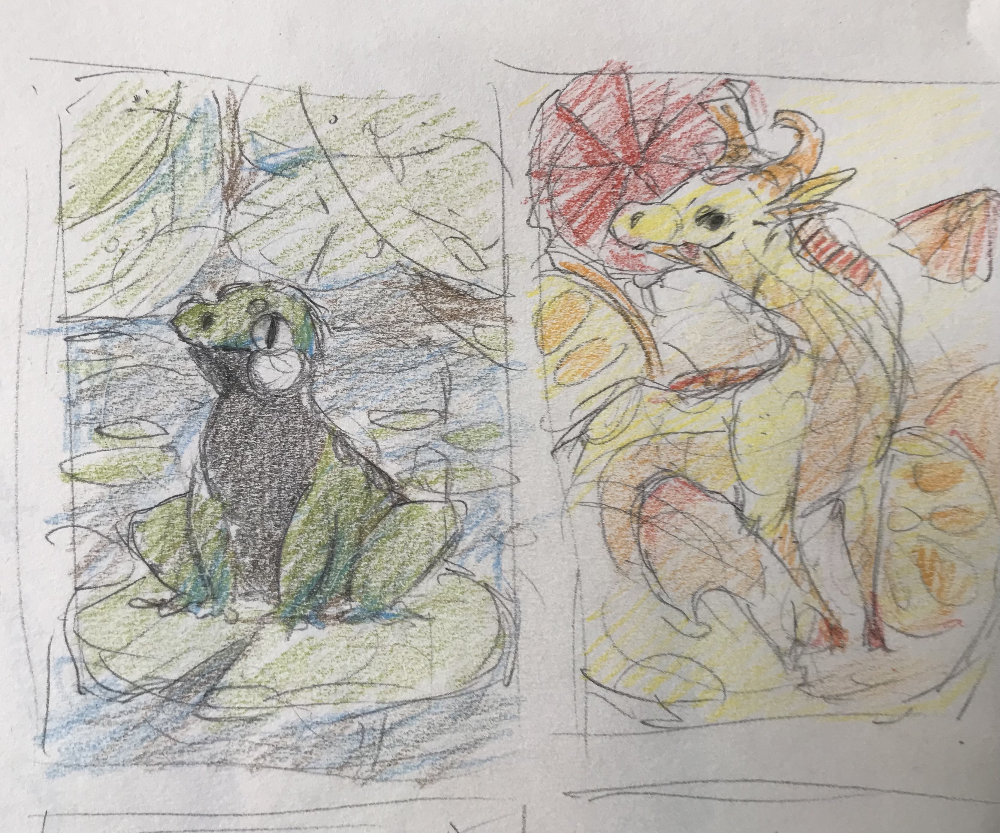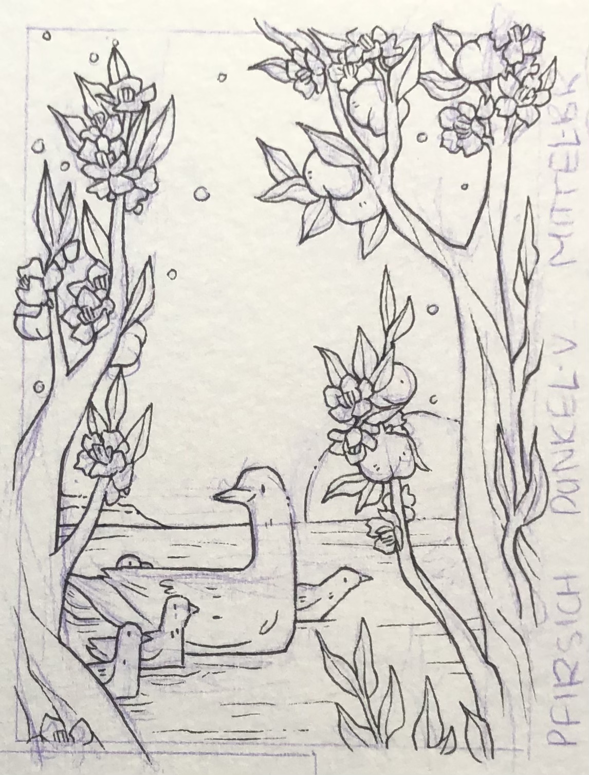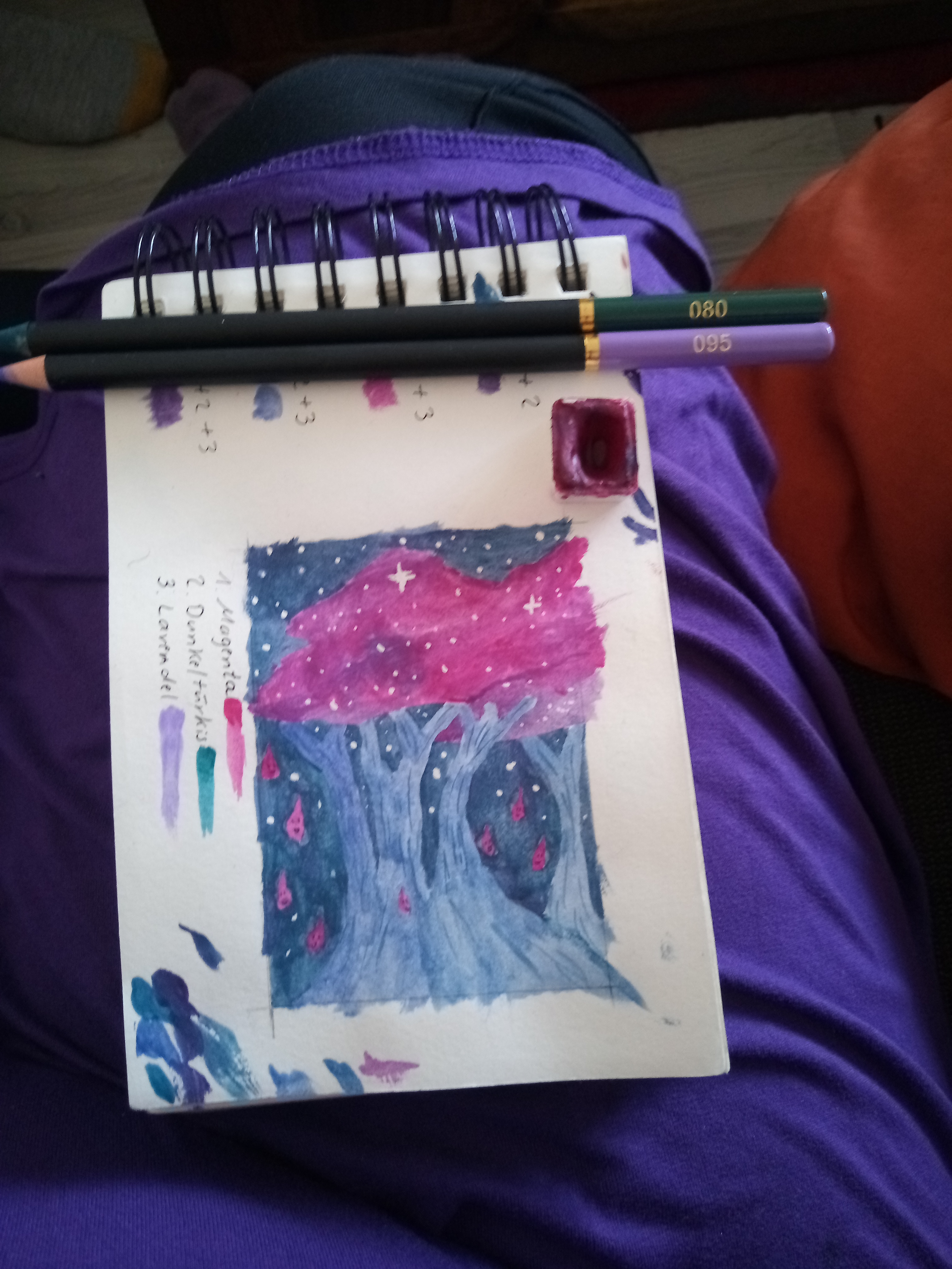 Ich überlege noch bei mir und hab jetzt erstmal ne grobe Motiv und Farbskizze gemacht. Für die finalen Farben wähle ich dann die passenden Wasserfarben aus, da müsste ich alles haben.