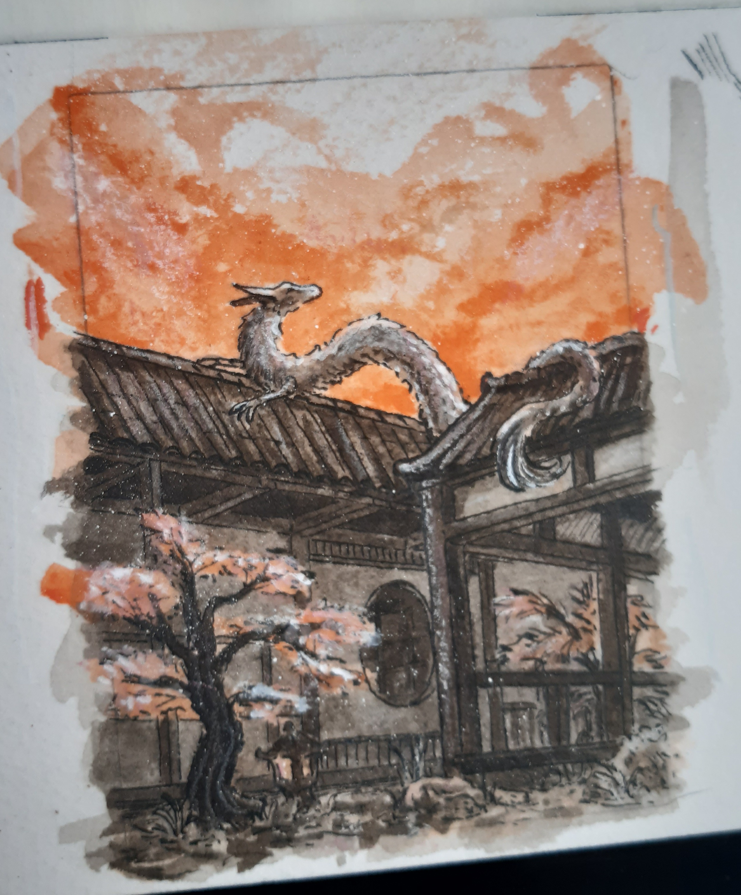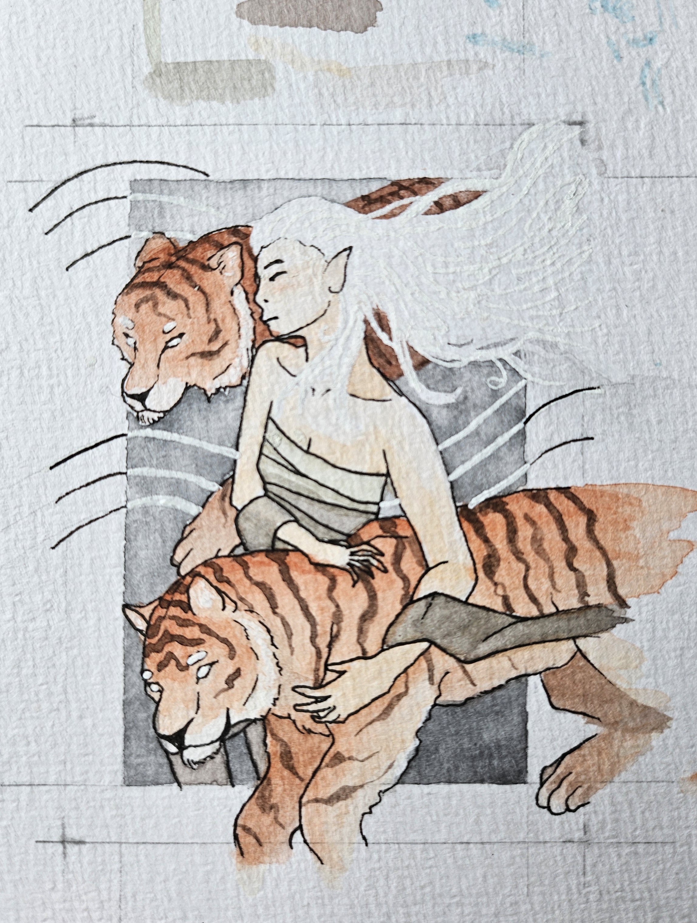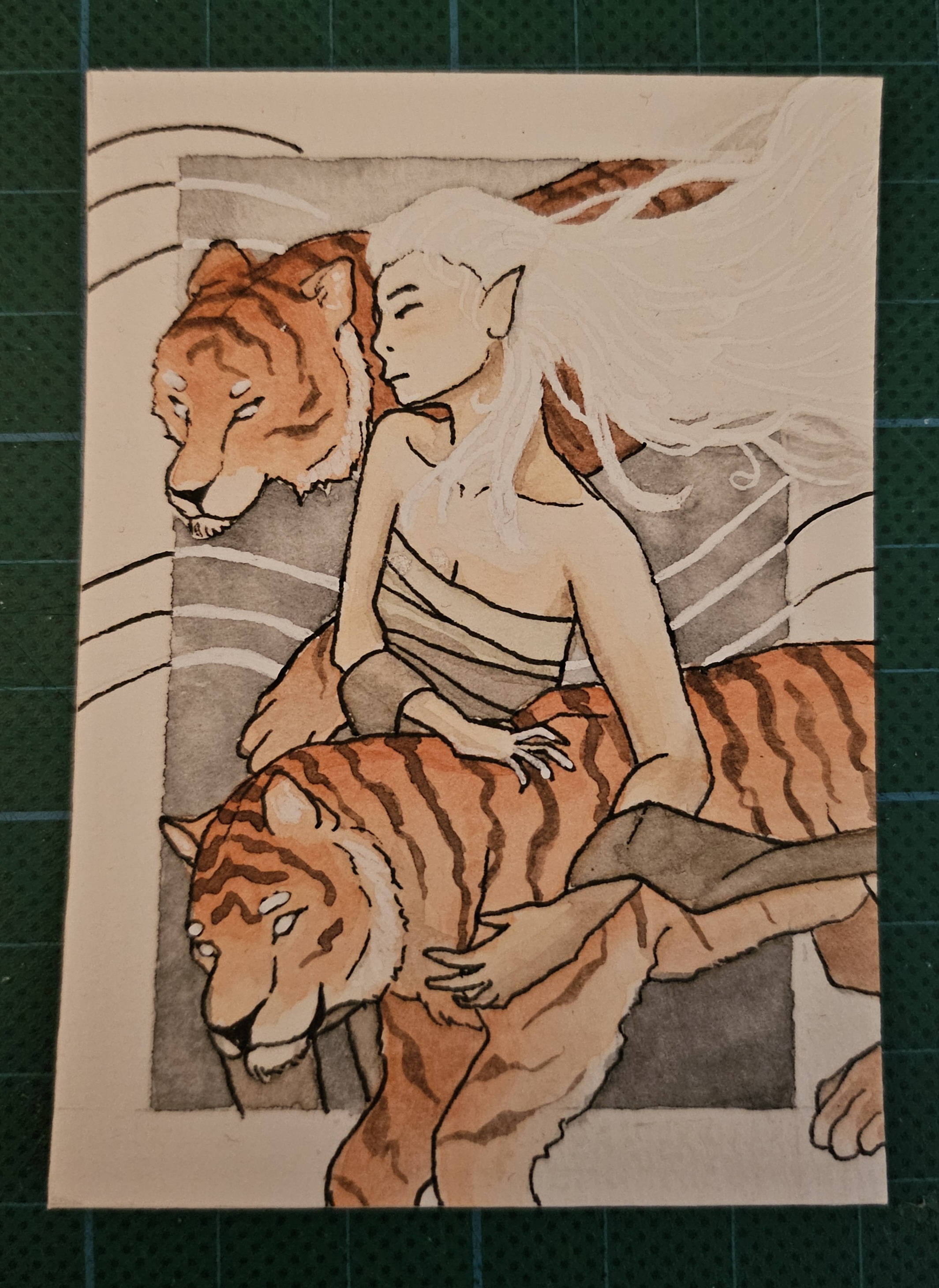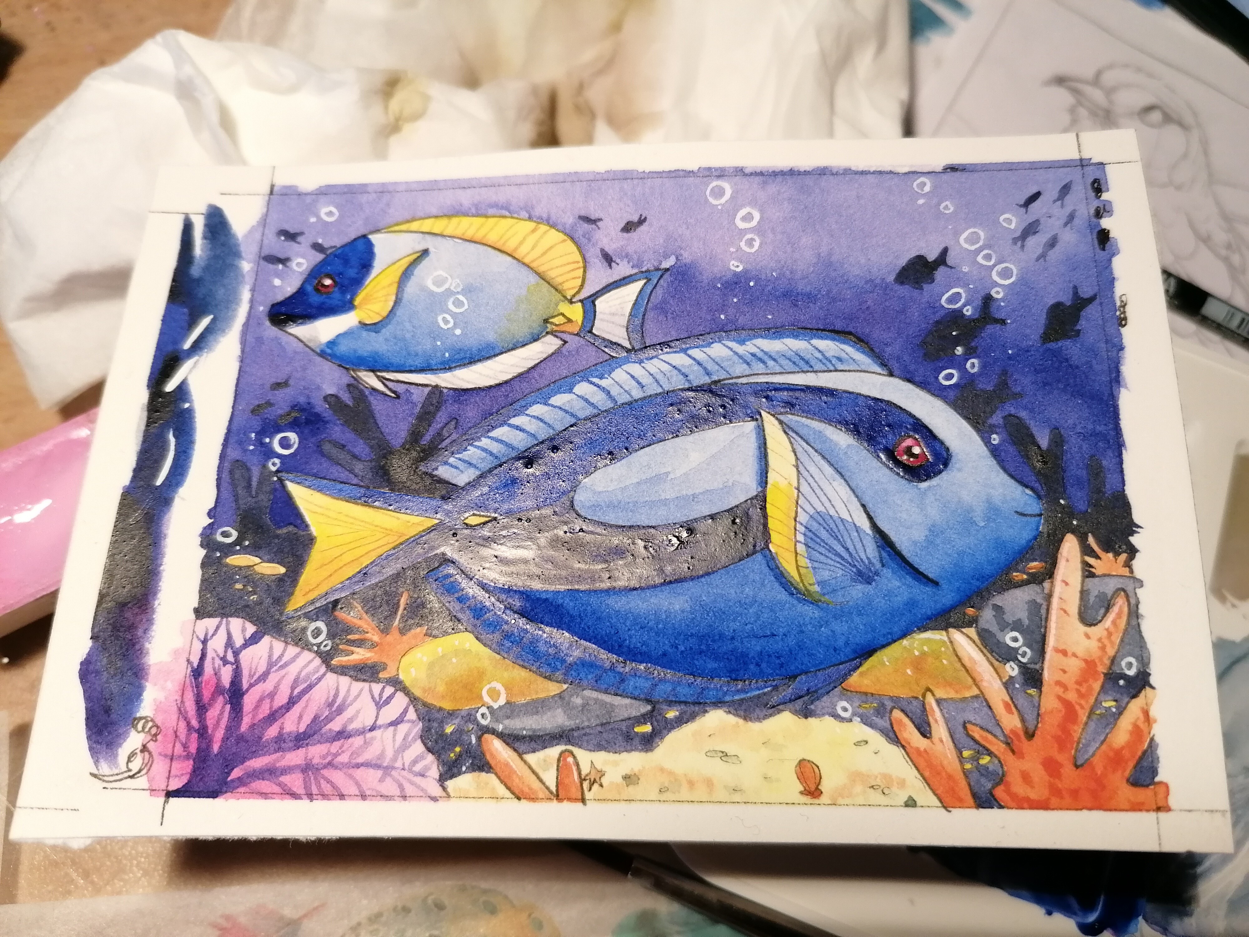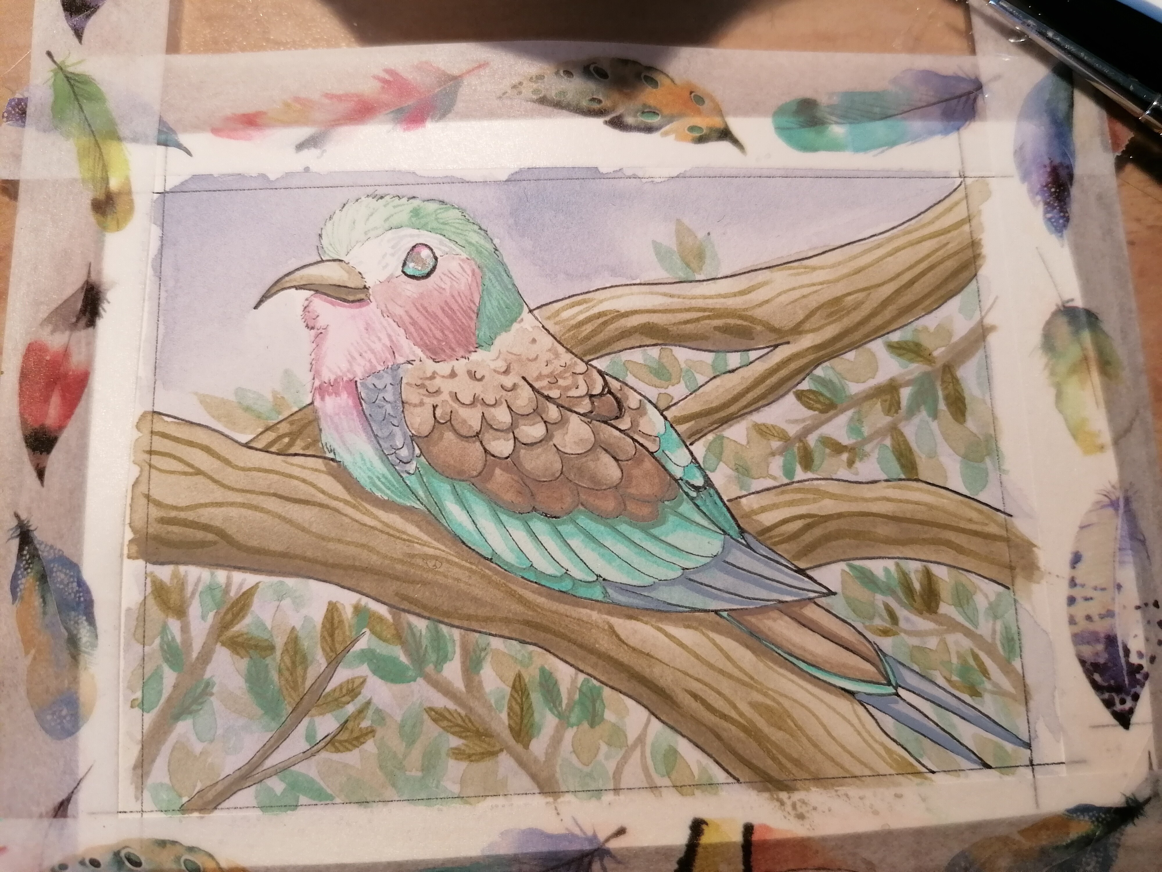 Was bei so hellen Farben leider ziemlich ins Auge sticht sind übermalte Stellen wie zB beim Kinn oder der Hand. Könntest du da vielleicht versuchen, das noch etwas zu kaschieren? (also entweder mit Wasser abtupfen oder mit weiß übermalen oder so?)