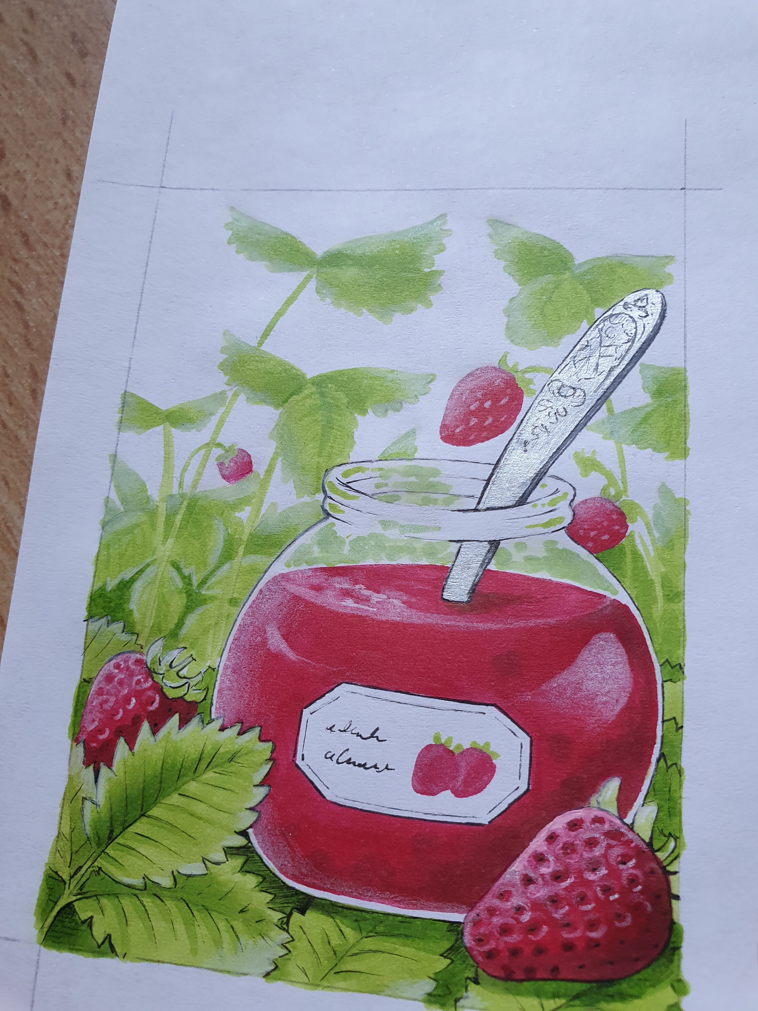 Das wäre für Karminrot, Silber, Gelbgrün, wäre das so okay? Die Farben auf dem Foto entsprechen etwas mehr der Realität als der Scan (also die Marmelade ist nicht ganz so pink wie auf dem Scan)