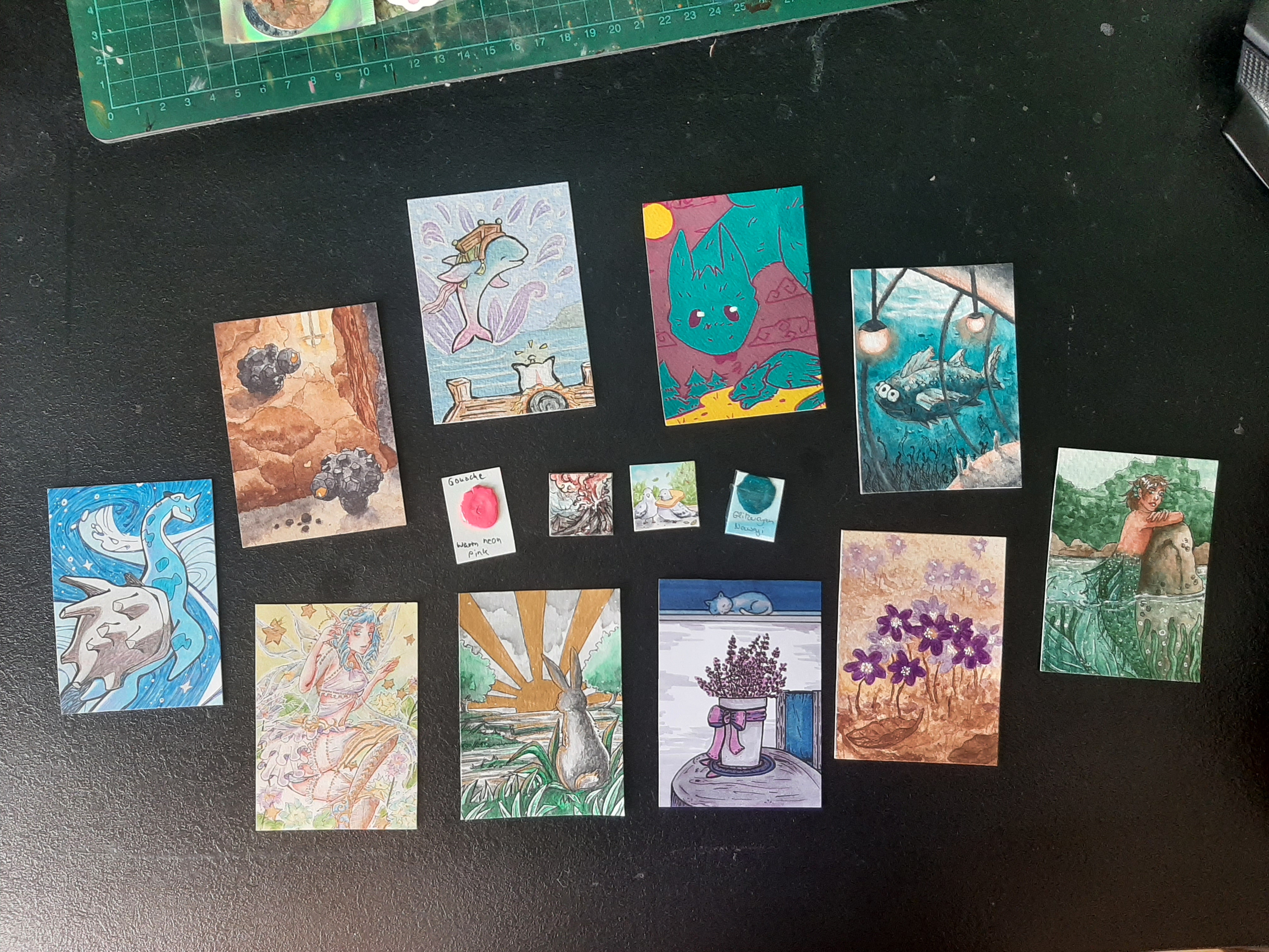 Uuund noch ein zweites Gruppenfoto für all die tollen Karten und die Inchies, die ich von euch bekommen habe - ich kann mich nicht genug bedanken, ihr wart wieder so wahnsinnig großzügig dieses Mal! Es waren sogar zwei Farb-Dots dabei, da kann ich schon fast ne eigene Farbroulette-Karte machen - Neon-Pink und Glitzergrün wären auf jeden Fall ne interessante Kombi xD