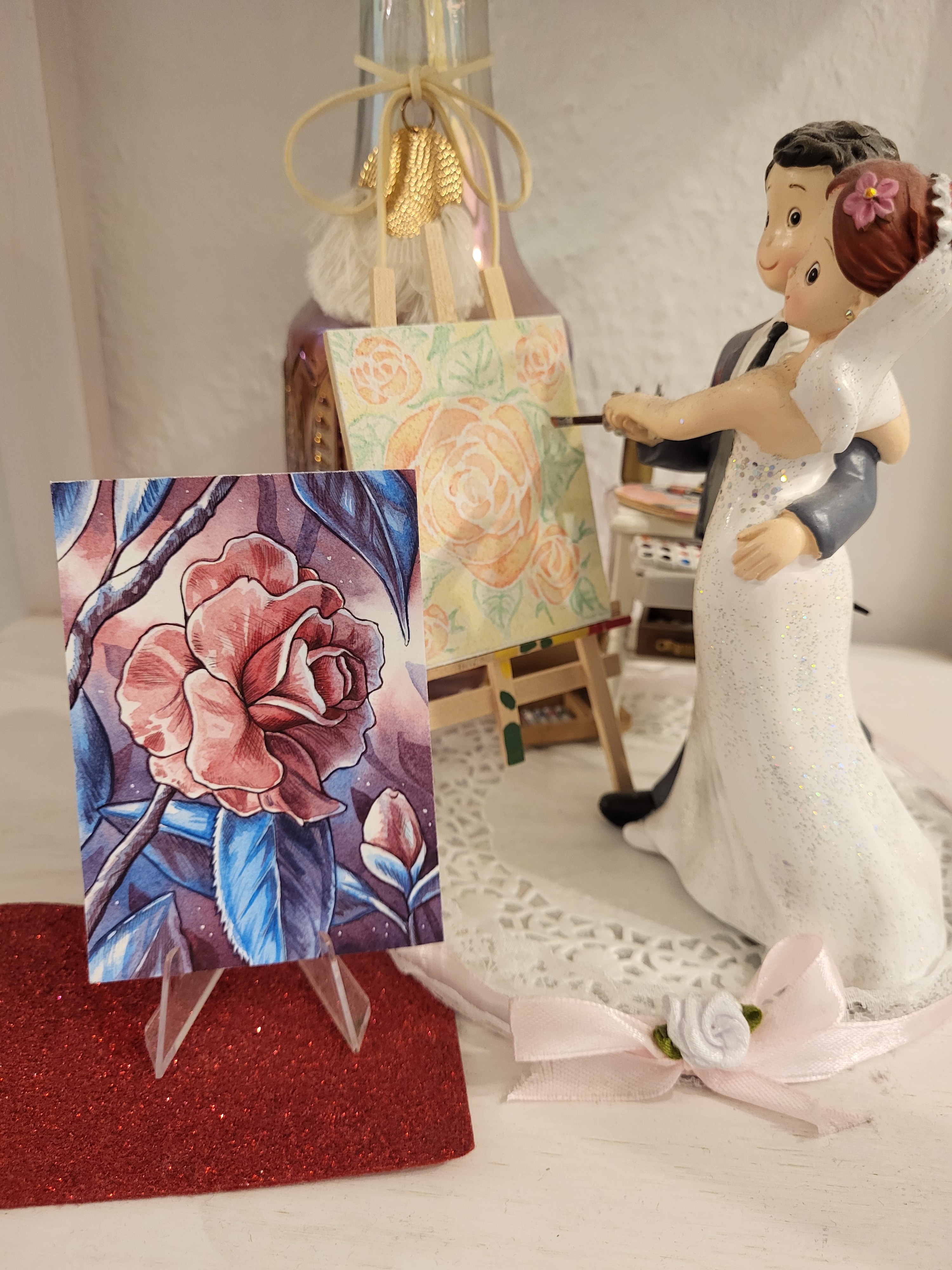 Deine Karte war bei uns allen ein riesen Favorit und ich bin endhappy, dass ich mich darüber freuen kann sie in den Händen zu halten. Sie sieht in echt so schön aus und sie hat einen Ehrenplatz erhalten. Mein Mann und ich teilen uns den Nachnamen Rose und ich werde von Kunden oft auf meinen Namen angesprochen weil er so schön klingt. Die Rose ist daher ein Sinnbild für unsere Ehe. Selbst unsere Hochzeitstortenfiguren haben zusammen eine Rose gemalt weil auch mein Mann ein kreativer Kopf ist und viel malt :) ich freue mich sehr!