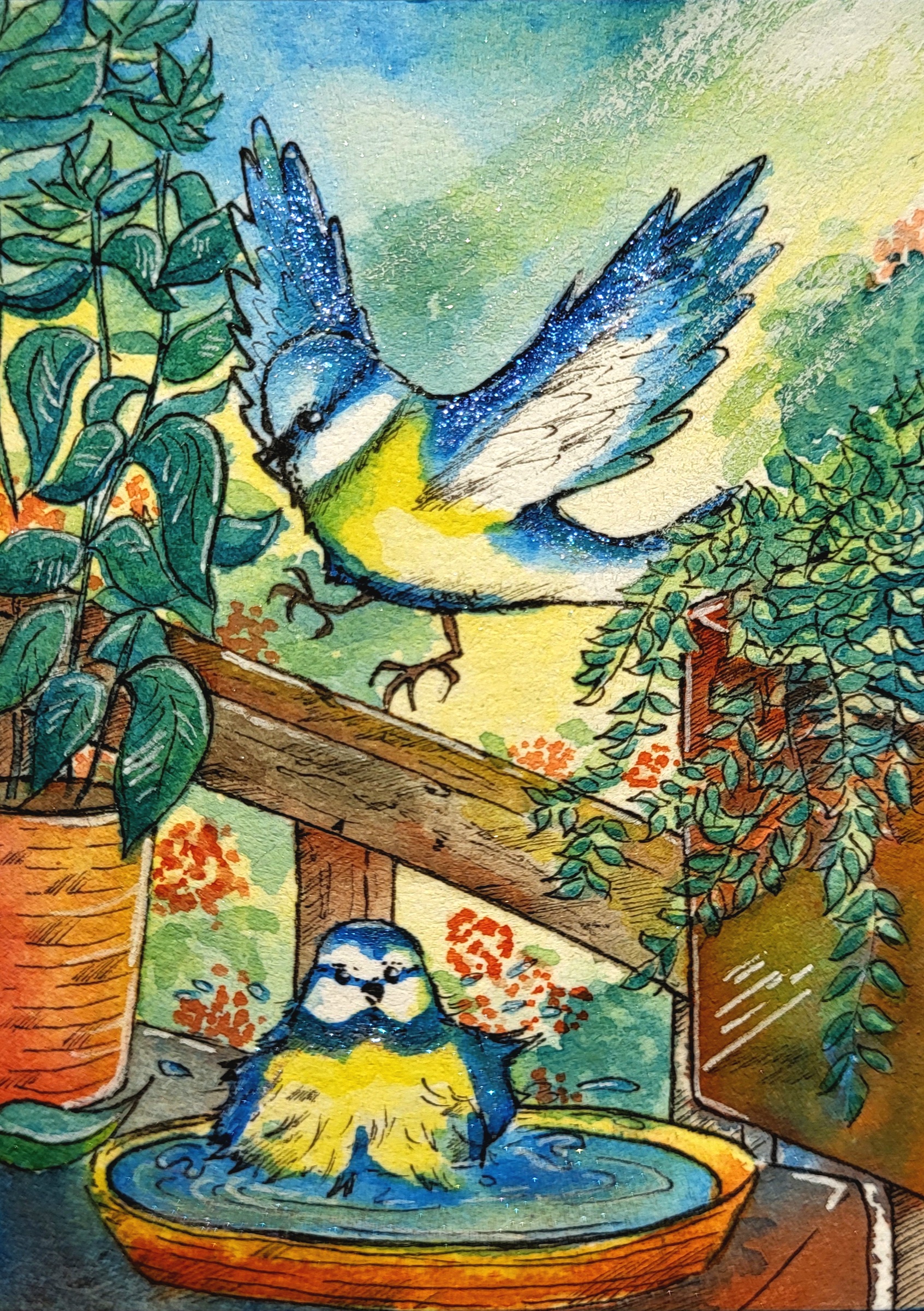 Ich hatte heute Post und hab die tolle Ersatzkarte von @Lilinya bekommen (übrigens finde ich den 1. Versuch auch super hübsch, wenn du nichts dagegen hast würde ich den auch ausschneiden und mit der anderen Karte zusammen abheften). Die tolle Meisenkarte von @Eleisis habe ich schon vor ein paar Tagen aus dem Kasten gezogen, wollte sie hier aber auch nochmal zeigen