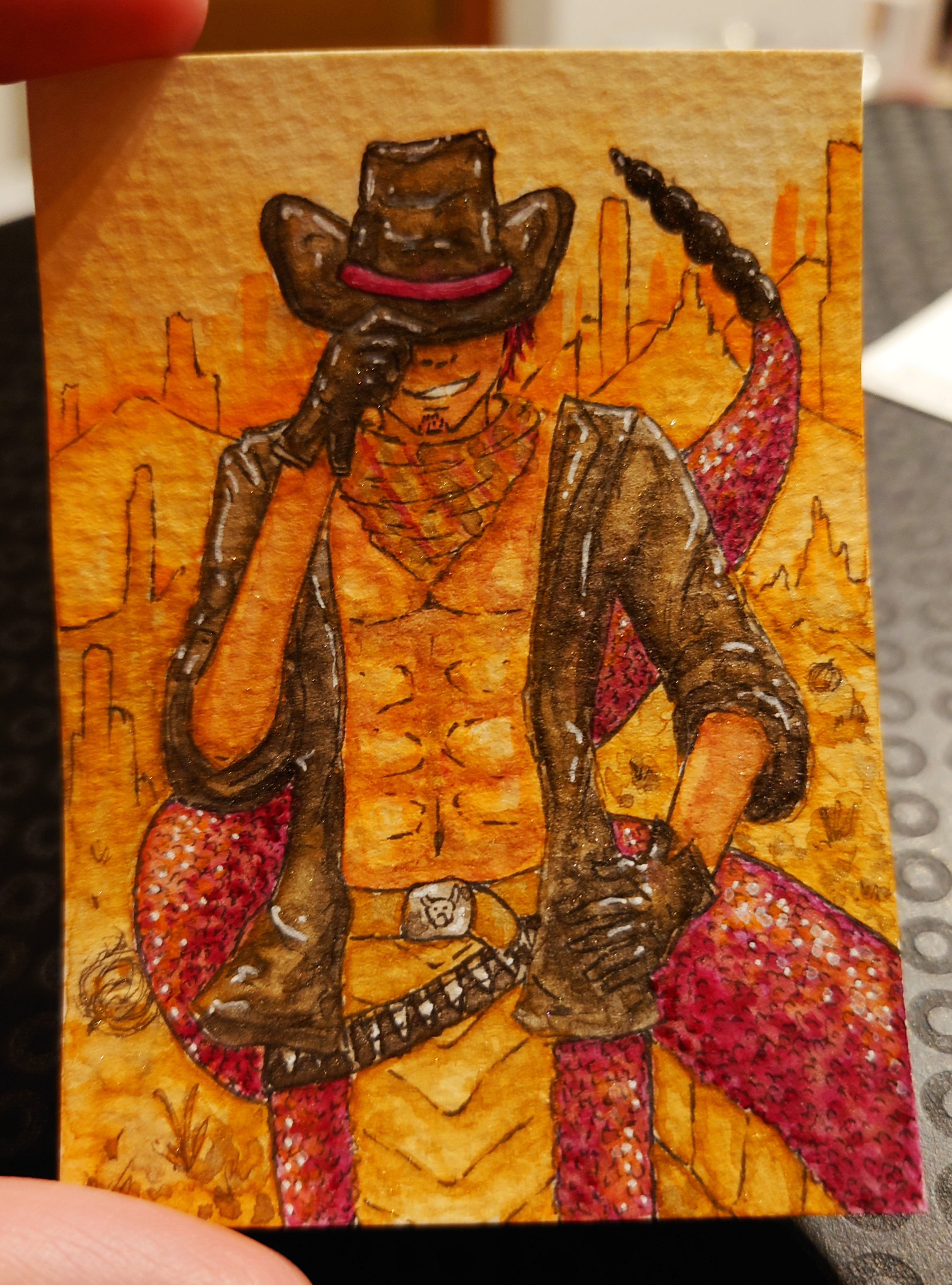 Ich musste an den wilden Westen denken bei der Kombination von Farben. Und weil ein Cowboy zu einfach wäre, hab ich einen Naga-Cowboy gezeichnet. Ich hoffe euch gefällt das Motiv.