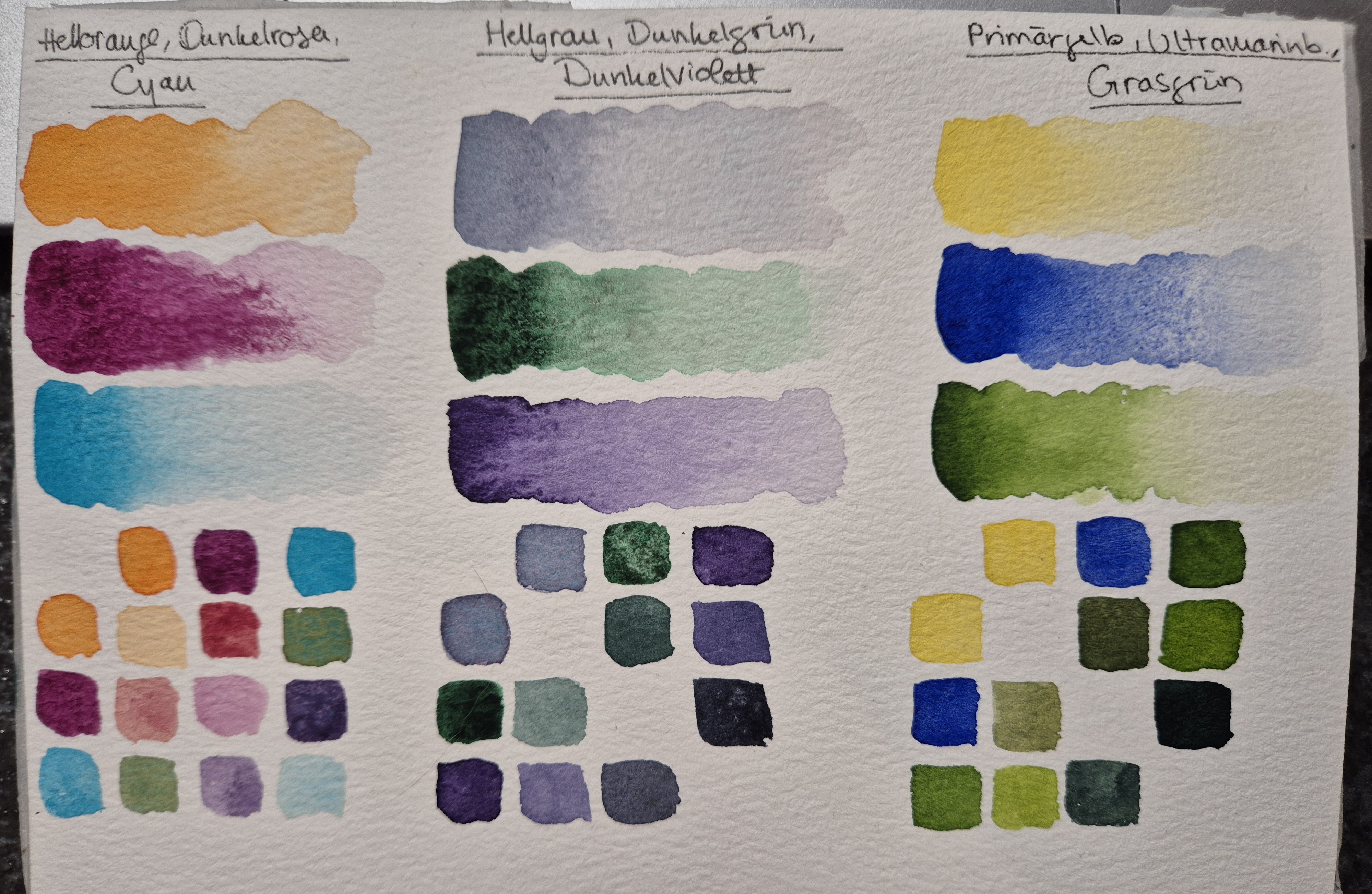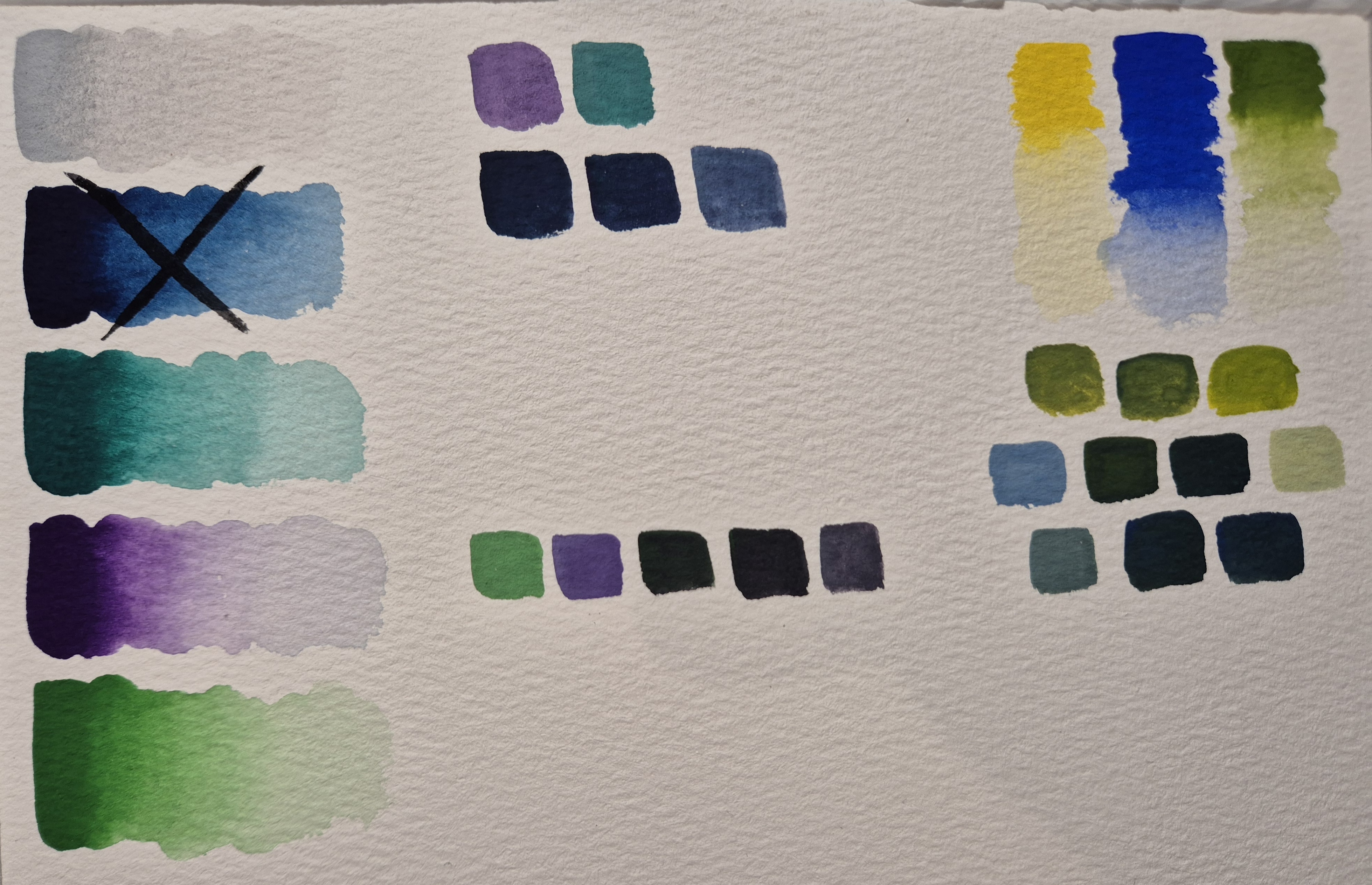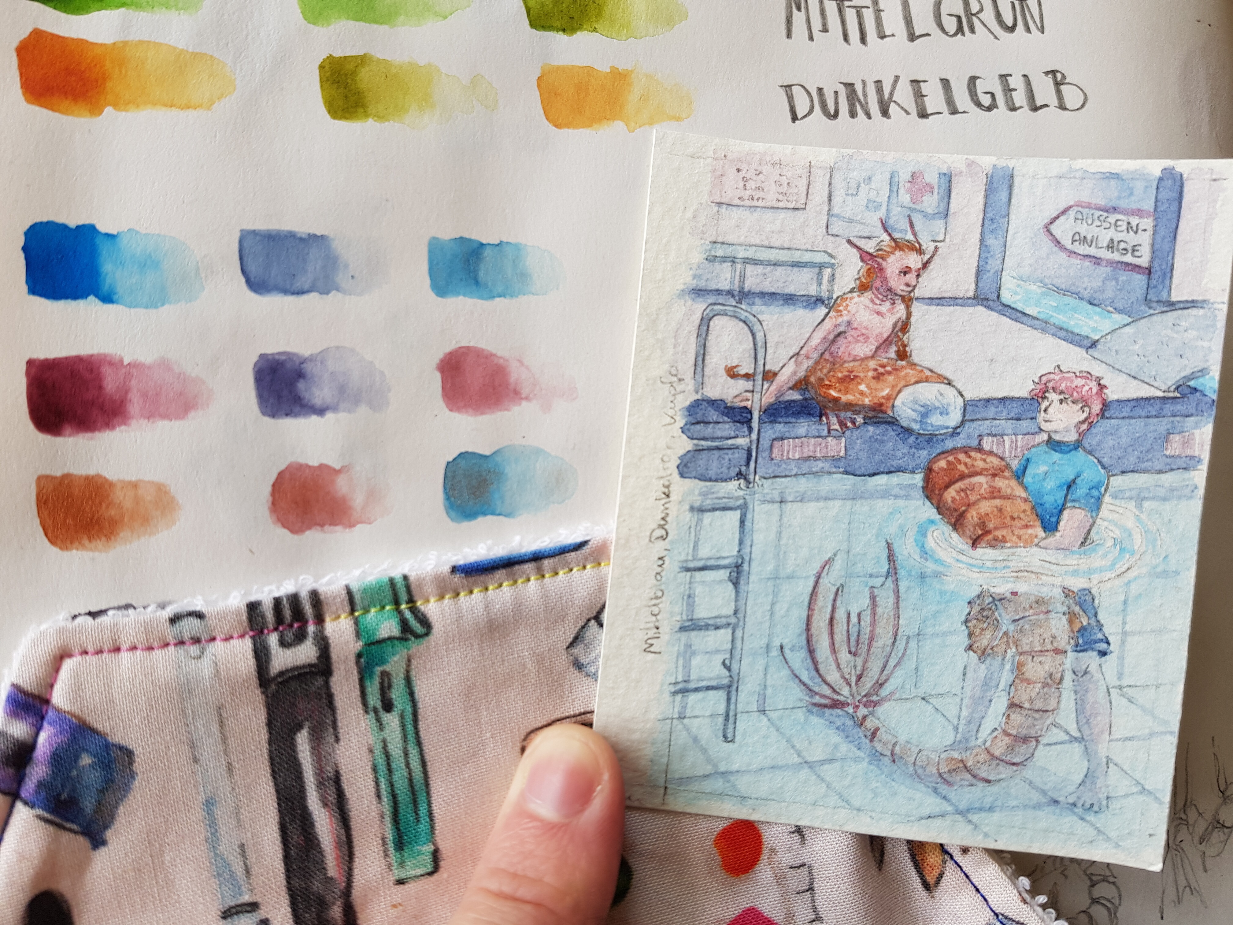 Hab inzwischen auch mal meine Farbkombis mit Aquarell und Gouache geswatcht und bin mir noch nicht so sicher, was ich nehmen werde :’) Bei der ersten Kombi (Hellorange, Dunkelrosa, Cyan) eventuell tatsächlich Gouache, aber bei den anderen beiden fällt es mir mit Aquarell wahrscheinlich leichter~ Primärgelb, Ultramarinblau und Grasgrün bereitet mir außerdem allgemein noch etwas Kopfzerbrechen… Fast nur Grün xD