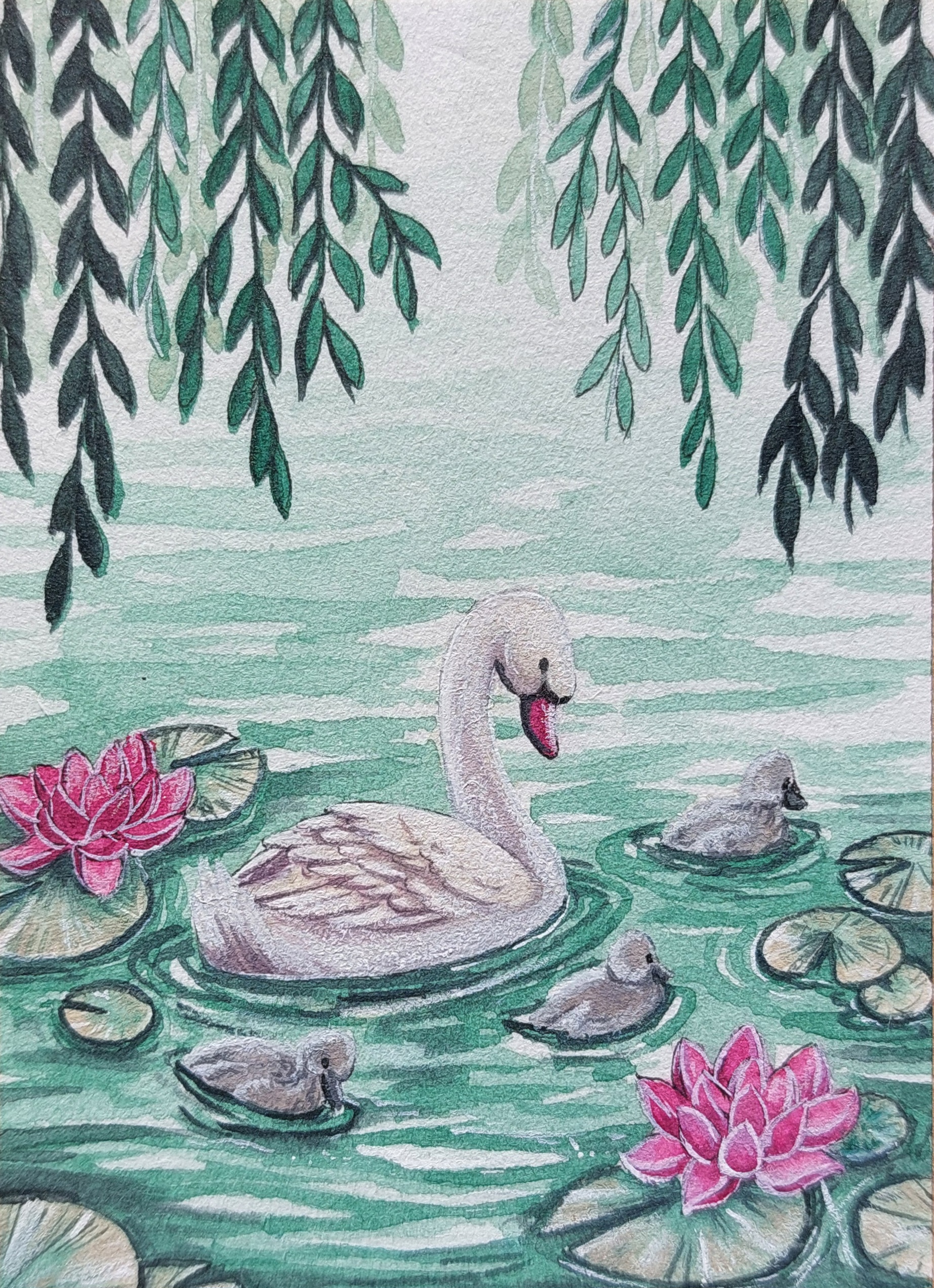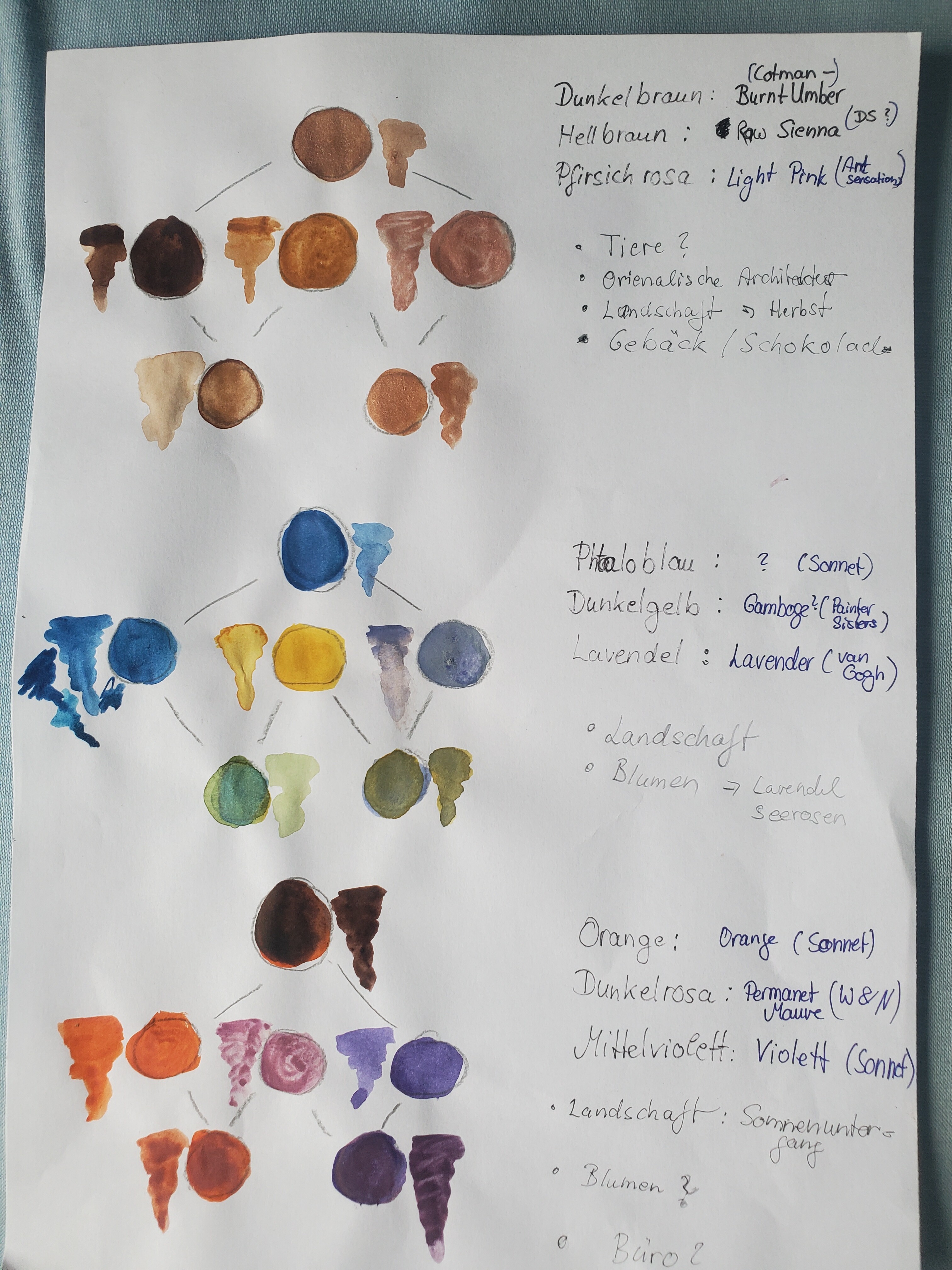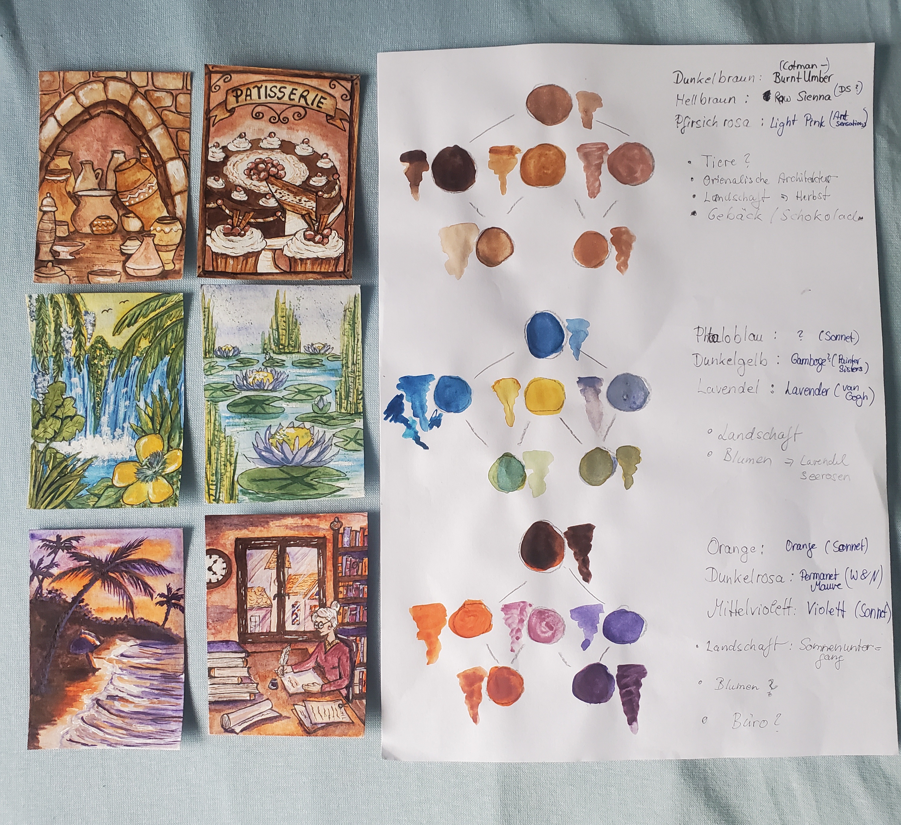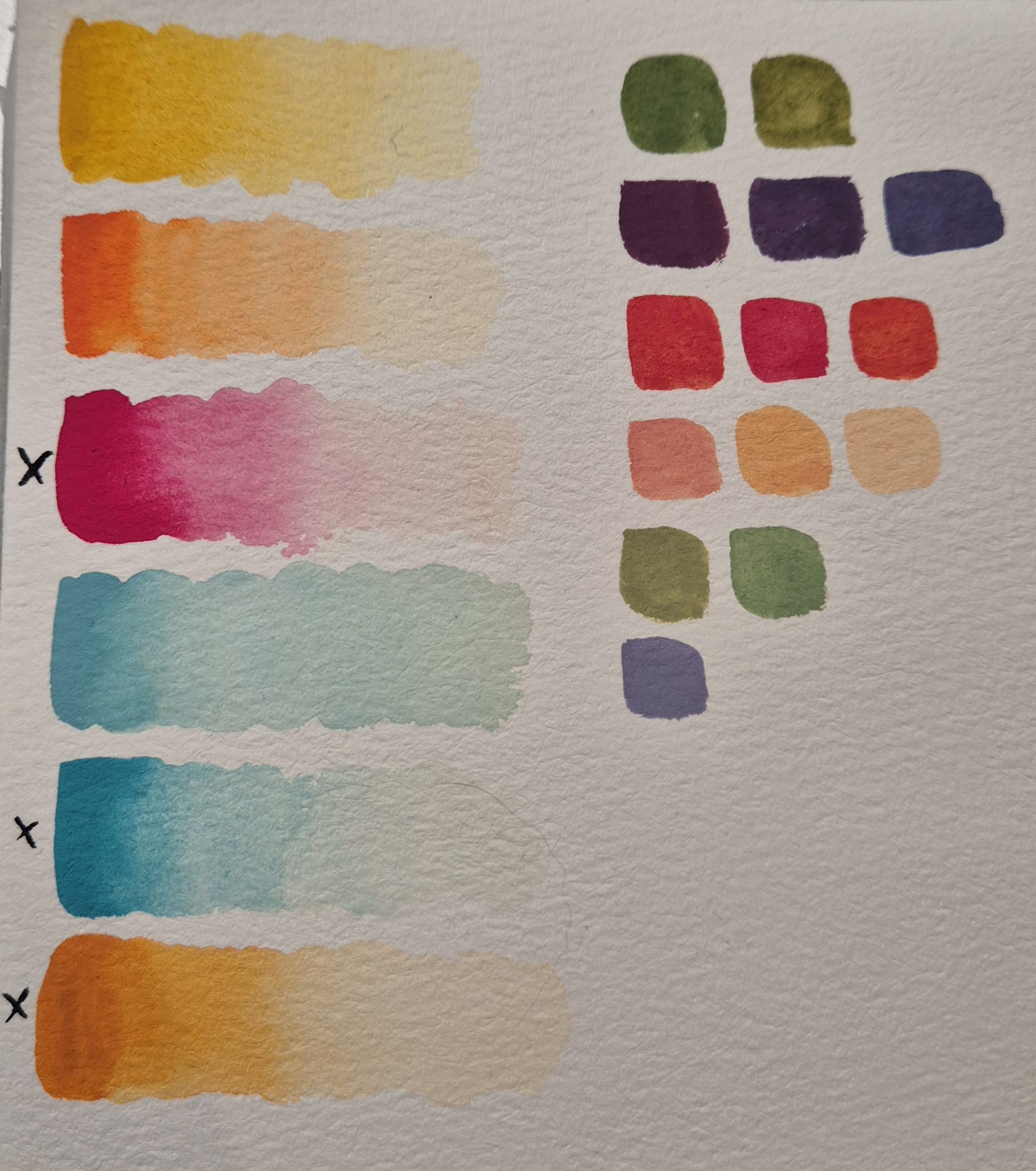 Hab inzwischen auch mal meine Farbkombis mit Aquarell und Gouache geswatcht und bin mir noch nicht so sicher, was ich nehmen werde :’) Bei der ersten Kombi (Hellorange, Dunkelrosa, Cyan) eventuell tatsächlich Gouache, aber bei den anderen beiden fällt es mir mit Aquarell wahrscheinlich leichter~ Primärgelb, Ultramarinblau und Grasgrün bereitet mir außerdem allgemein noch etwas Kopfzerbrechen… Fast nur Grün xD